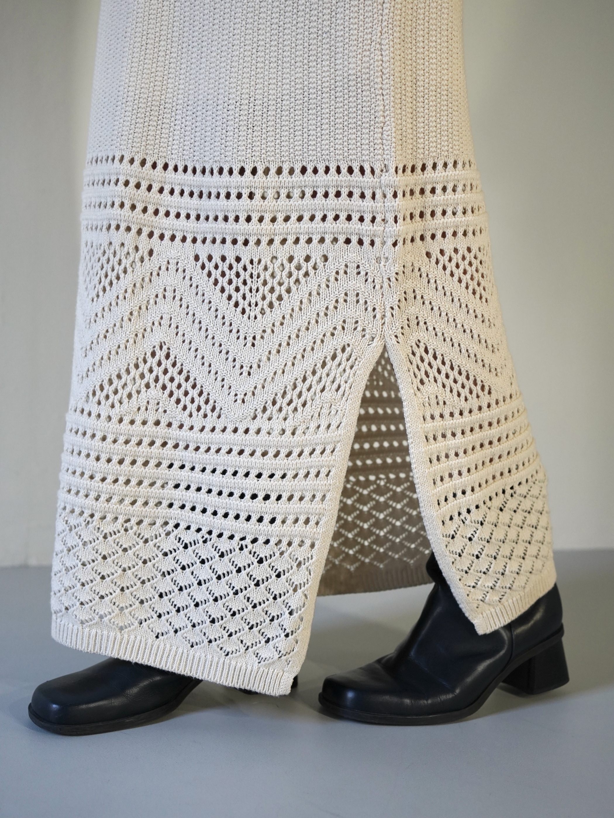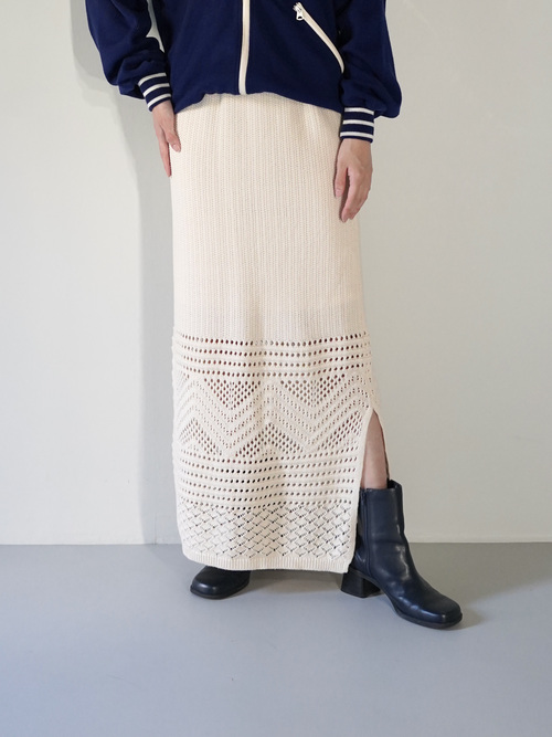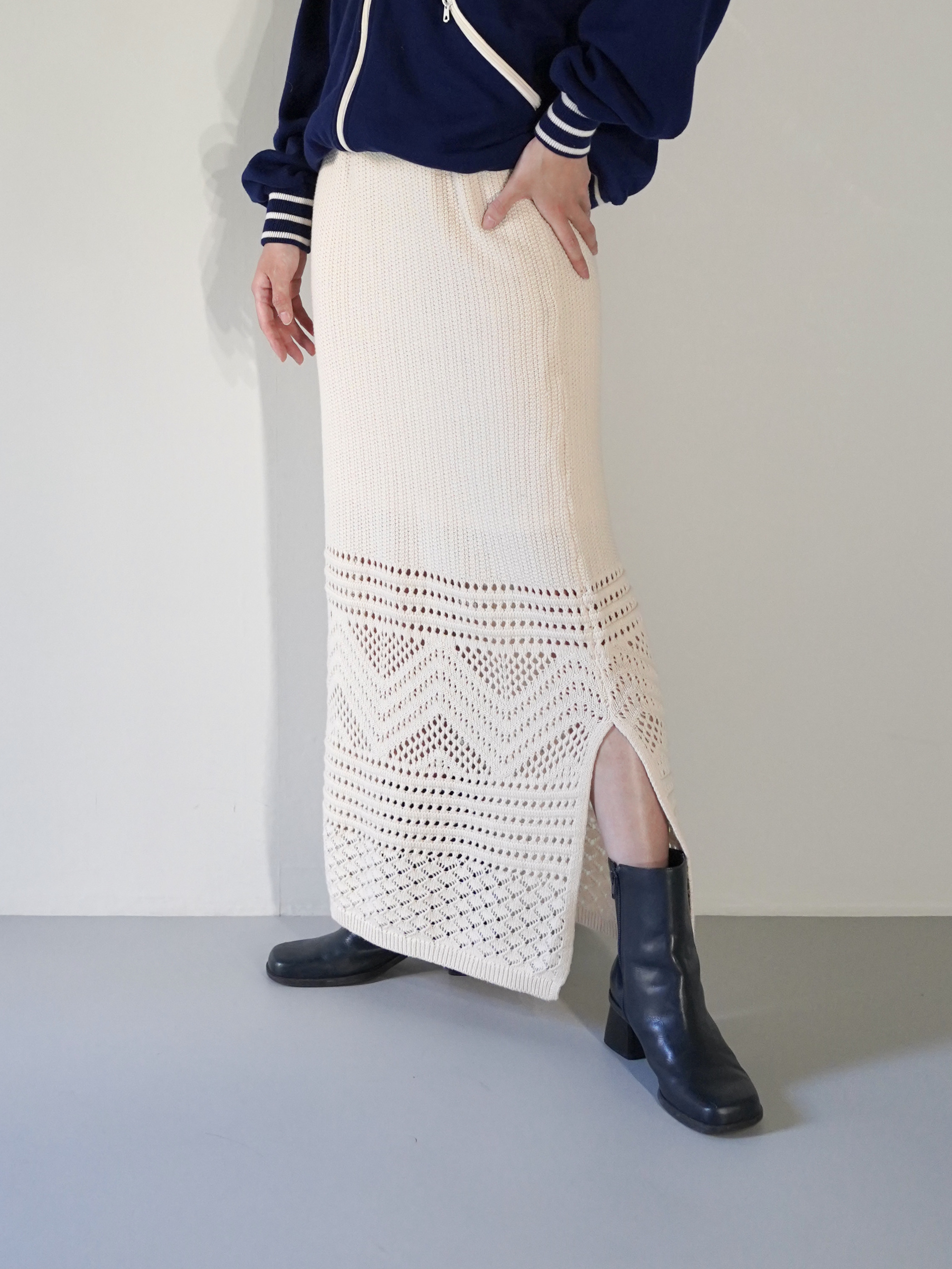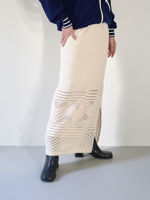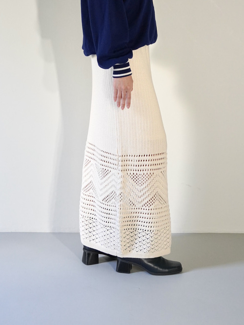 細やかな凸凹感のある鹿の子編みに、裾は繊細な透かし編みにて切り替えられた上品なニットスカート