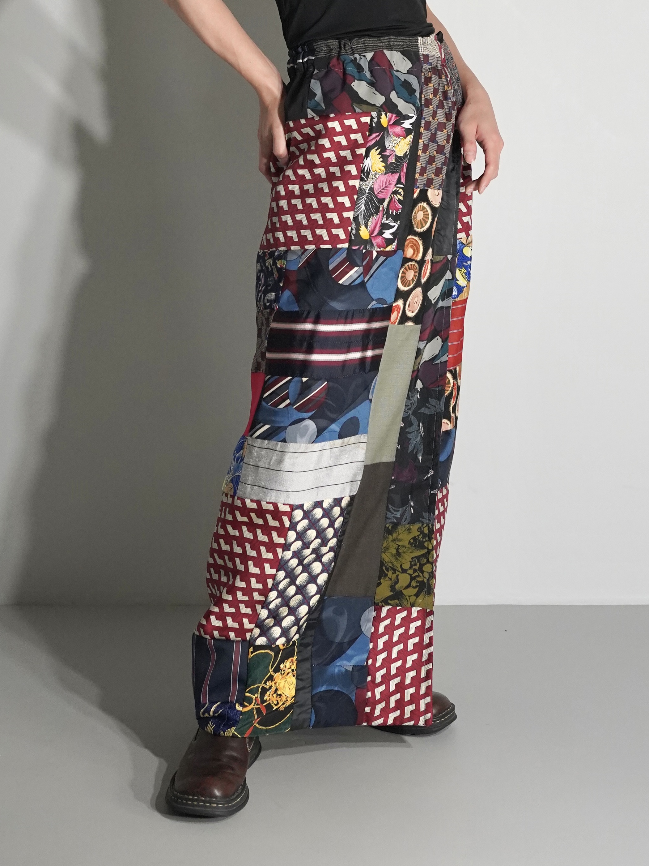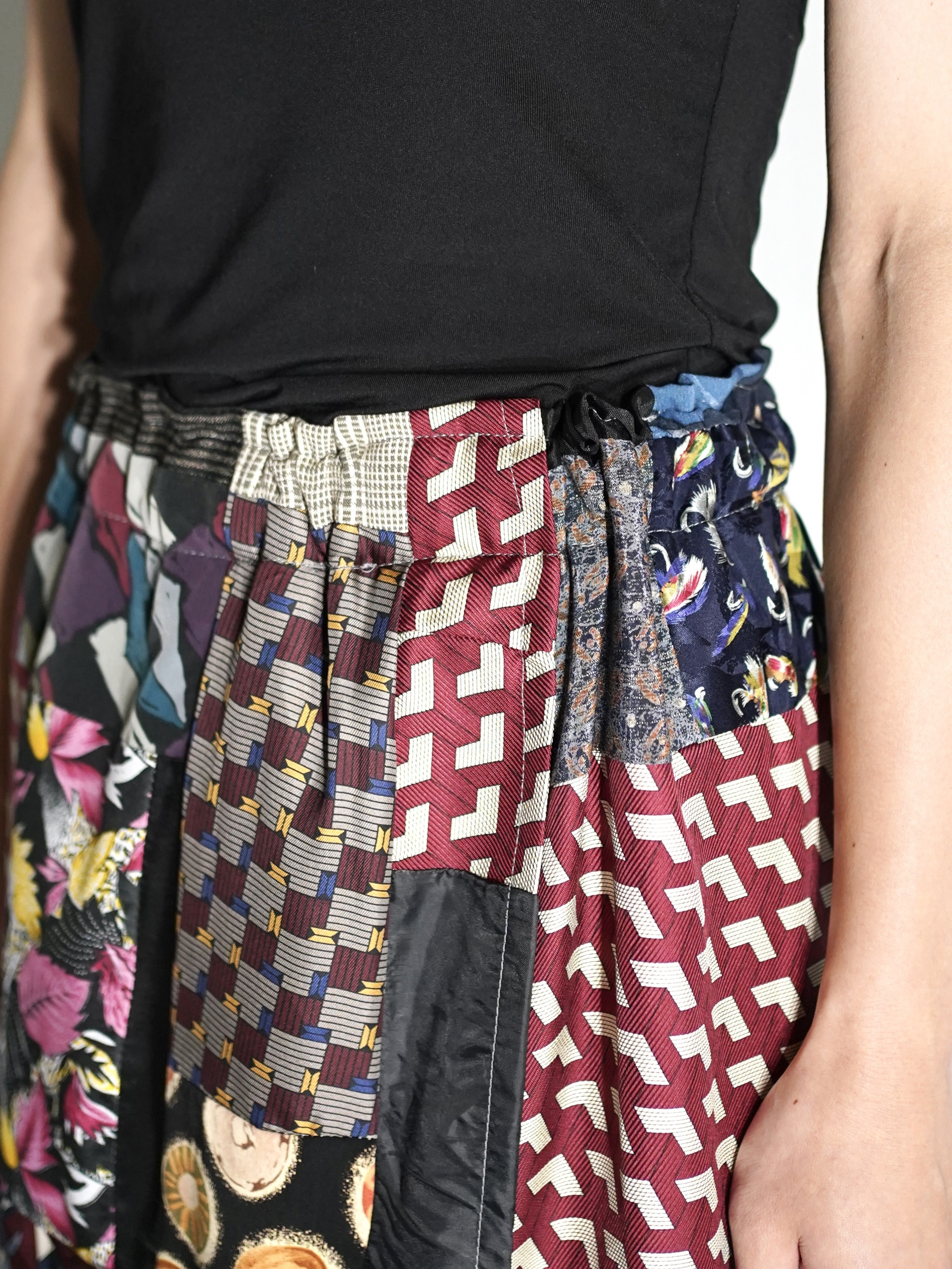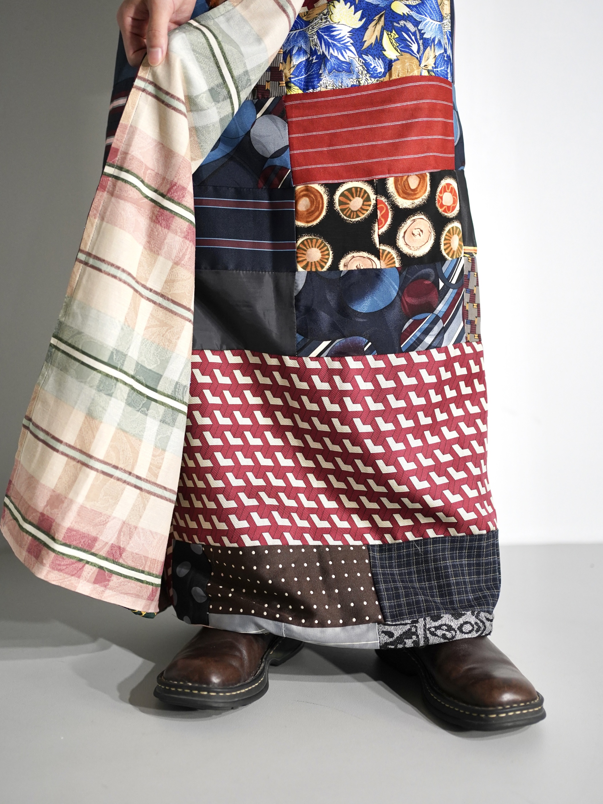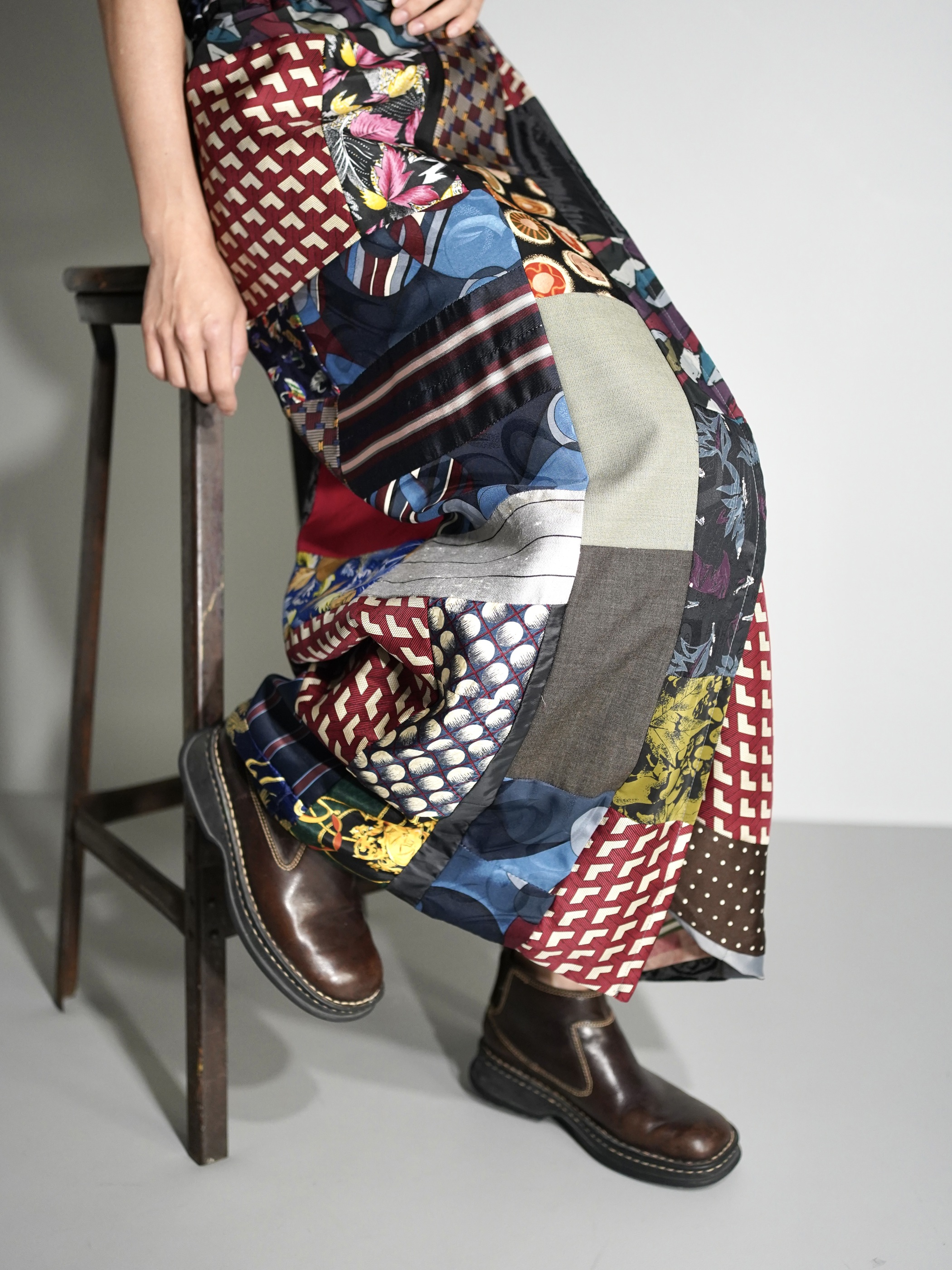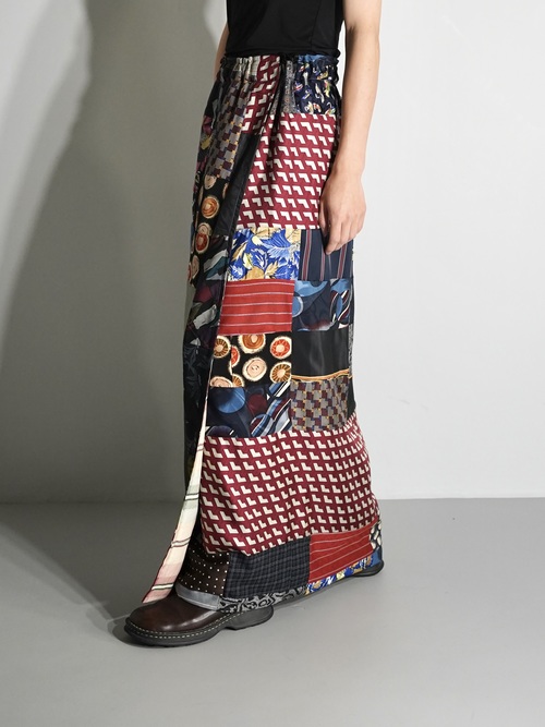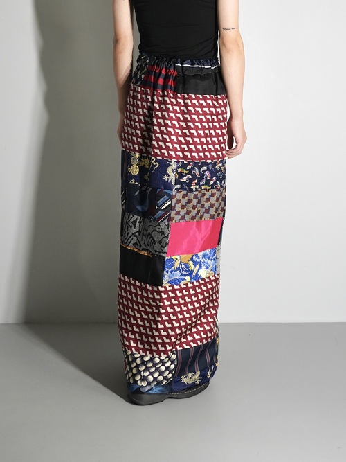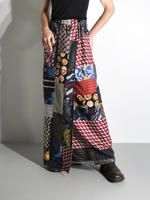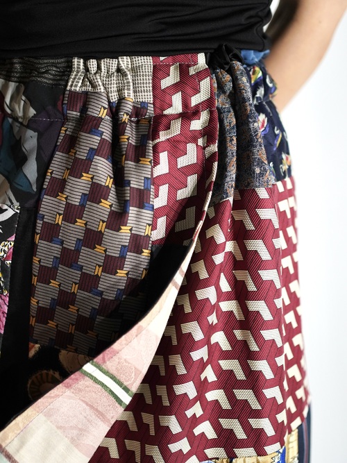 恐らく古いキルトラグからインスピレーションを受け作られたパッチワーク生地を解体しラップ状のスカートに仕立てた1着。