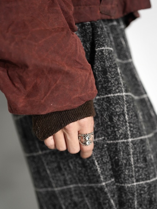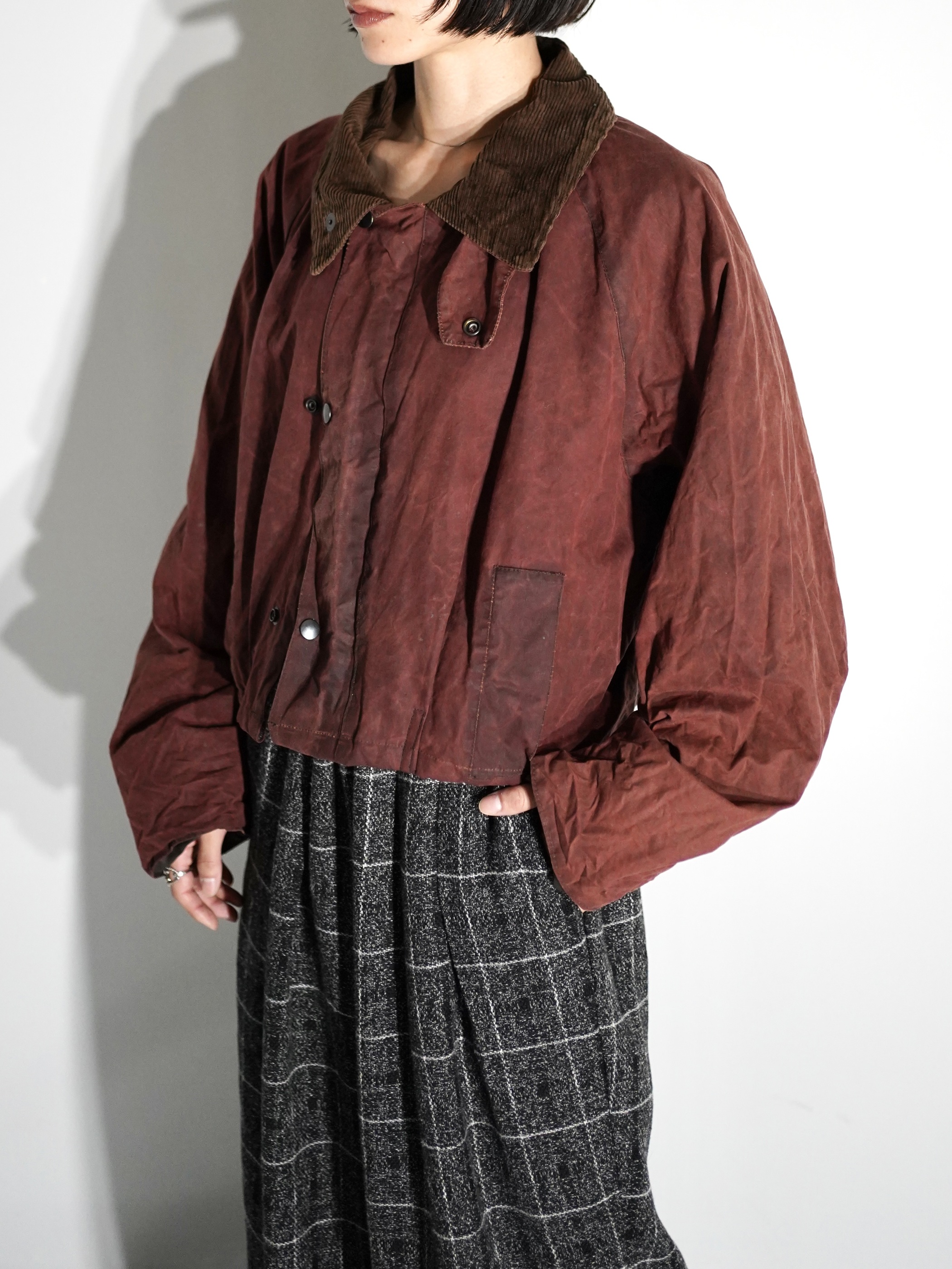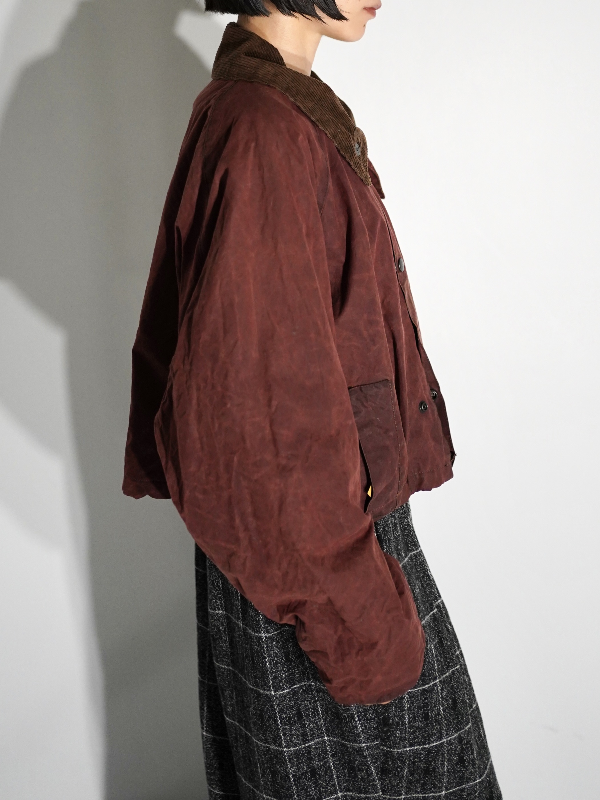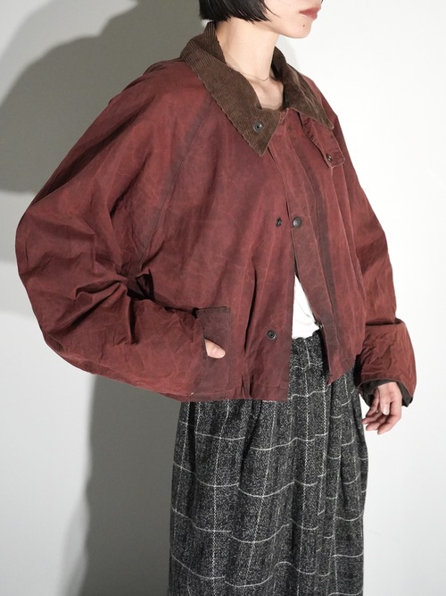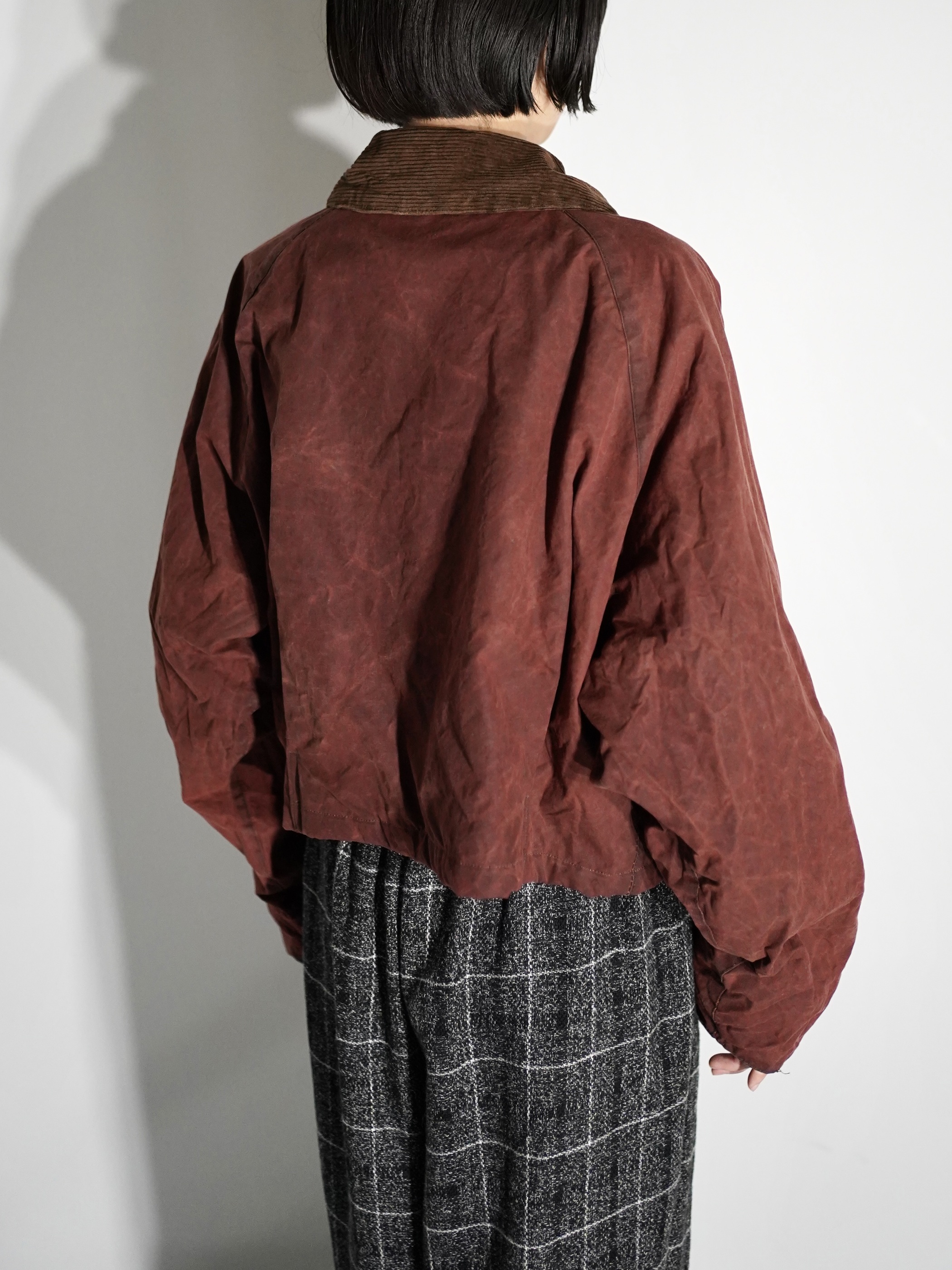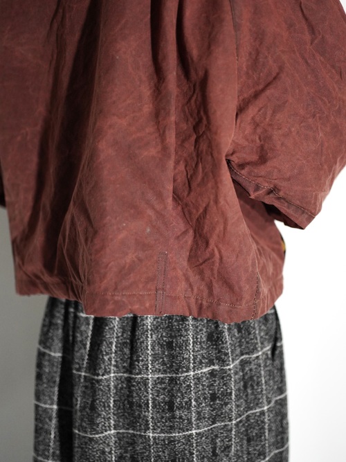 ショート丈にし、後ろ身頃にタックを施すことで納まりの良いシルエットに構築。ハイウエストのボトムやワンピースなどとも相性が良いかと