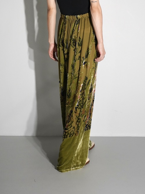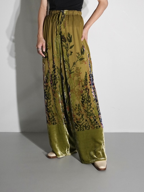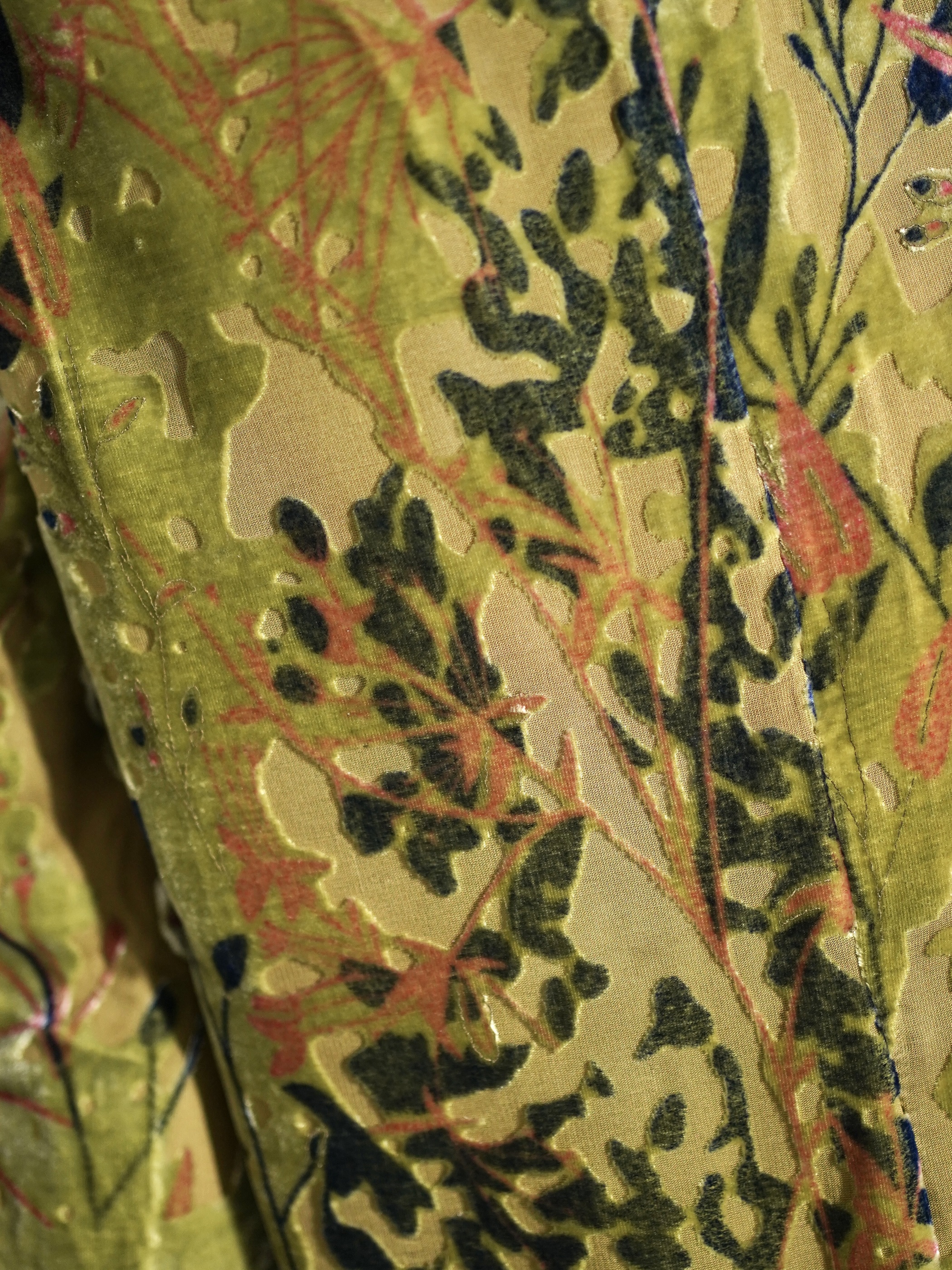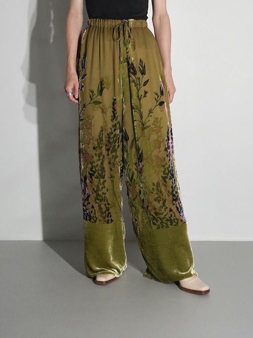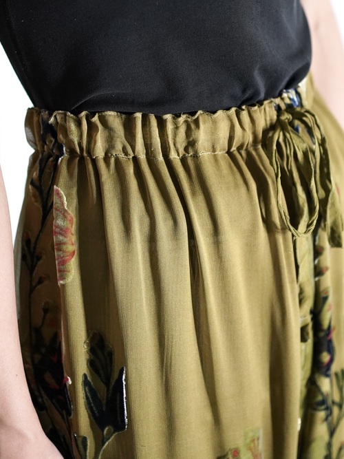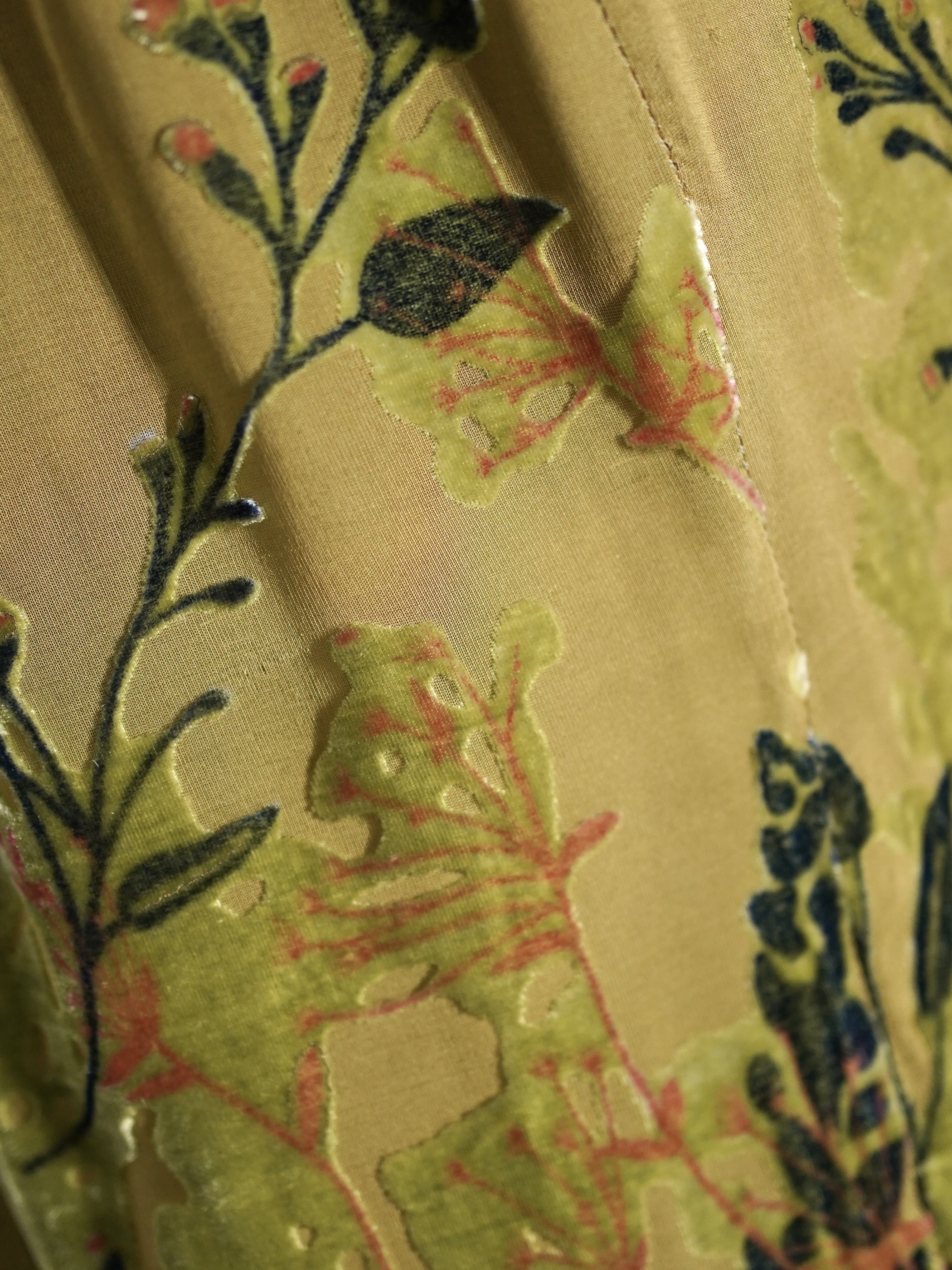 セミシアー生地にボタニカルライクなベロアのフロッキー加工が施され、裾は全体を纏める様にワンカラーに切り替えたデザイン