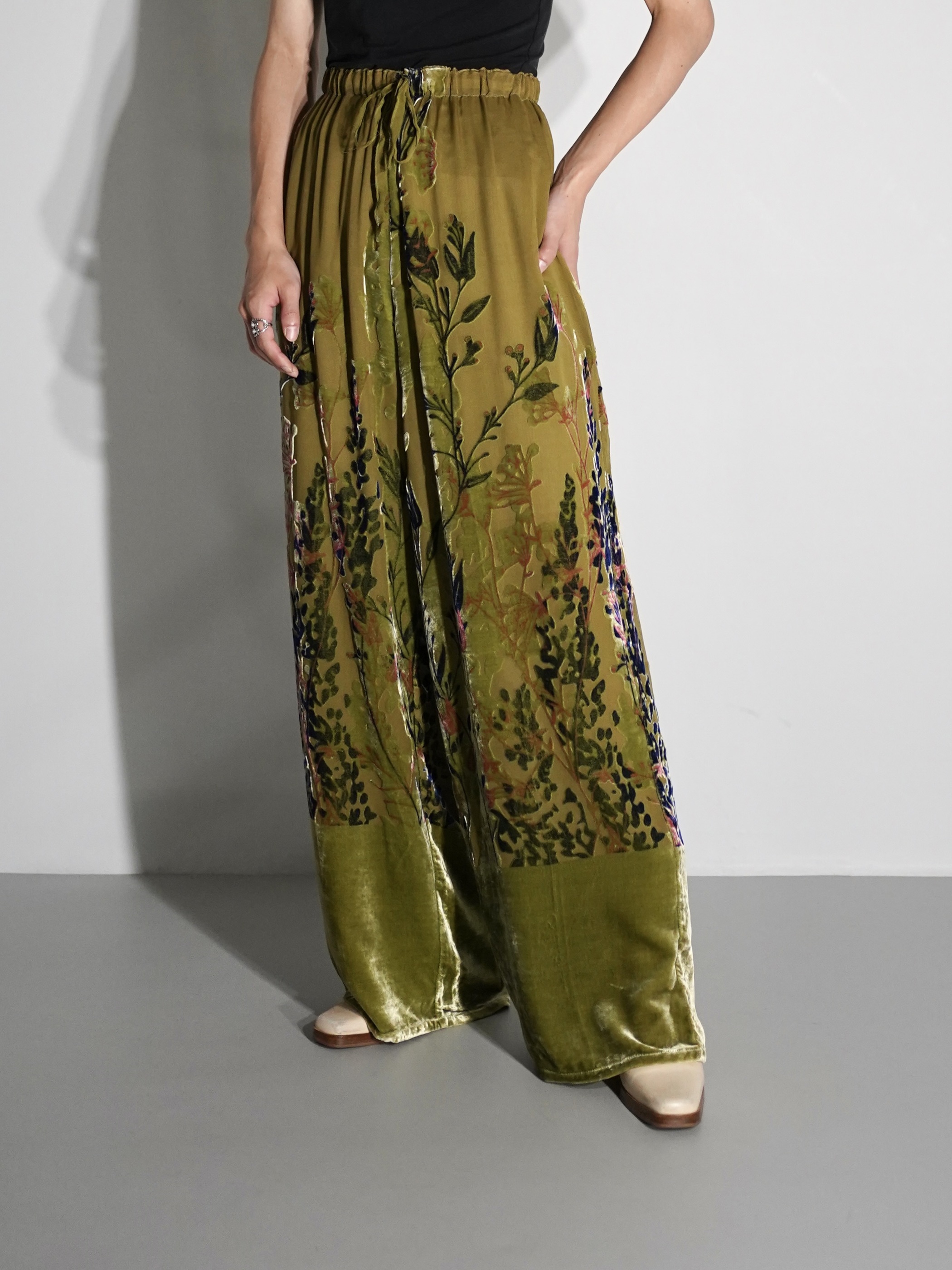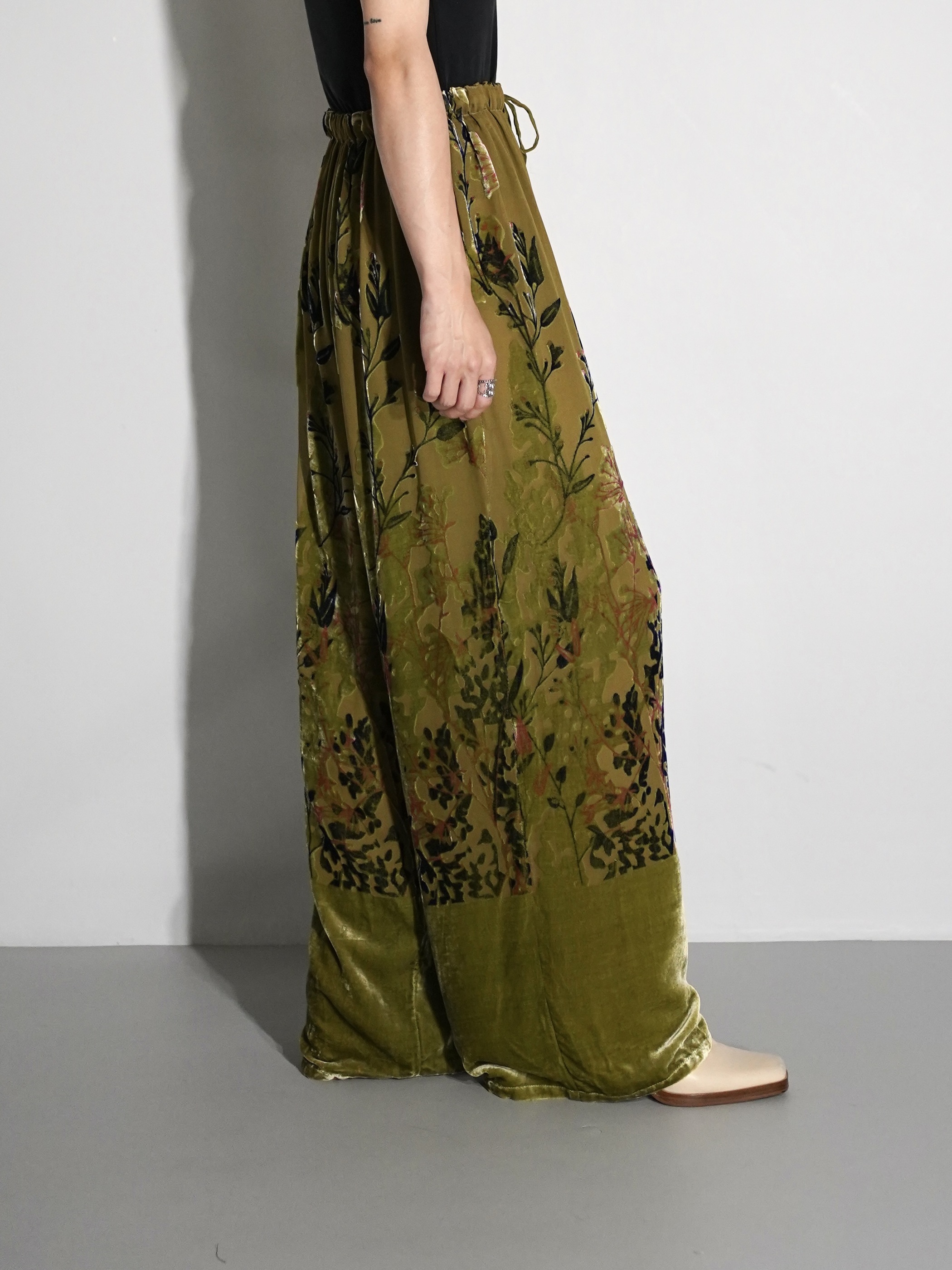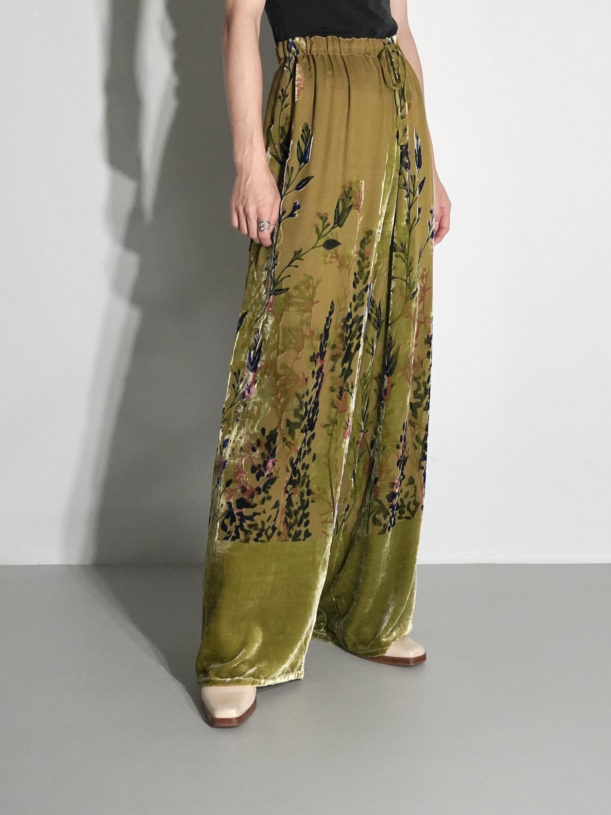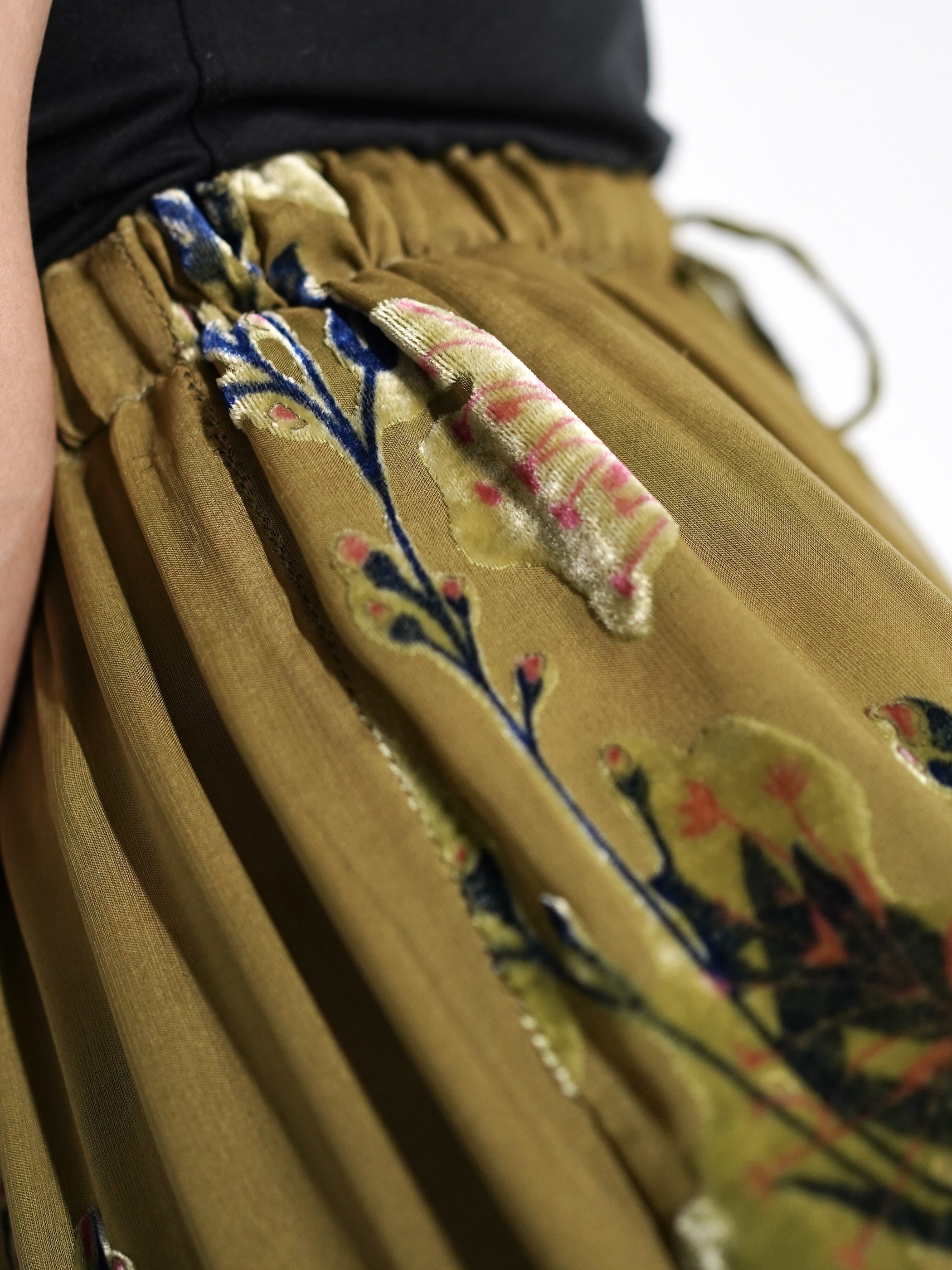 セミシアー生地にボタニカルライクなベロアのフロッキー加工が施され、裾は全体を纏める様にワンカラーに切り替えたデザイン