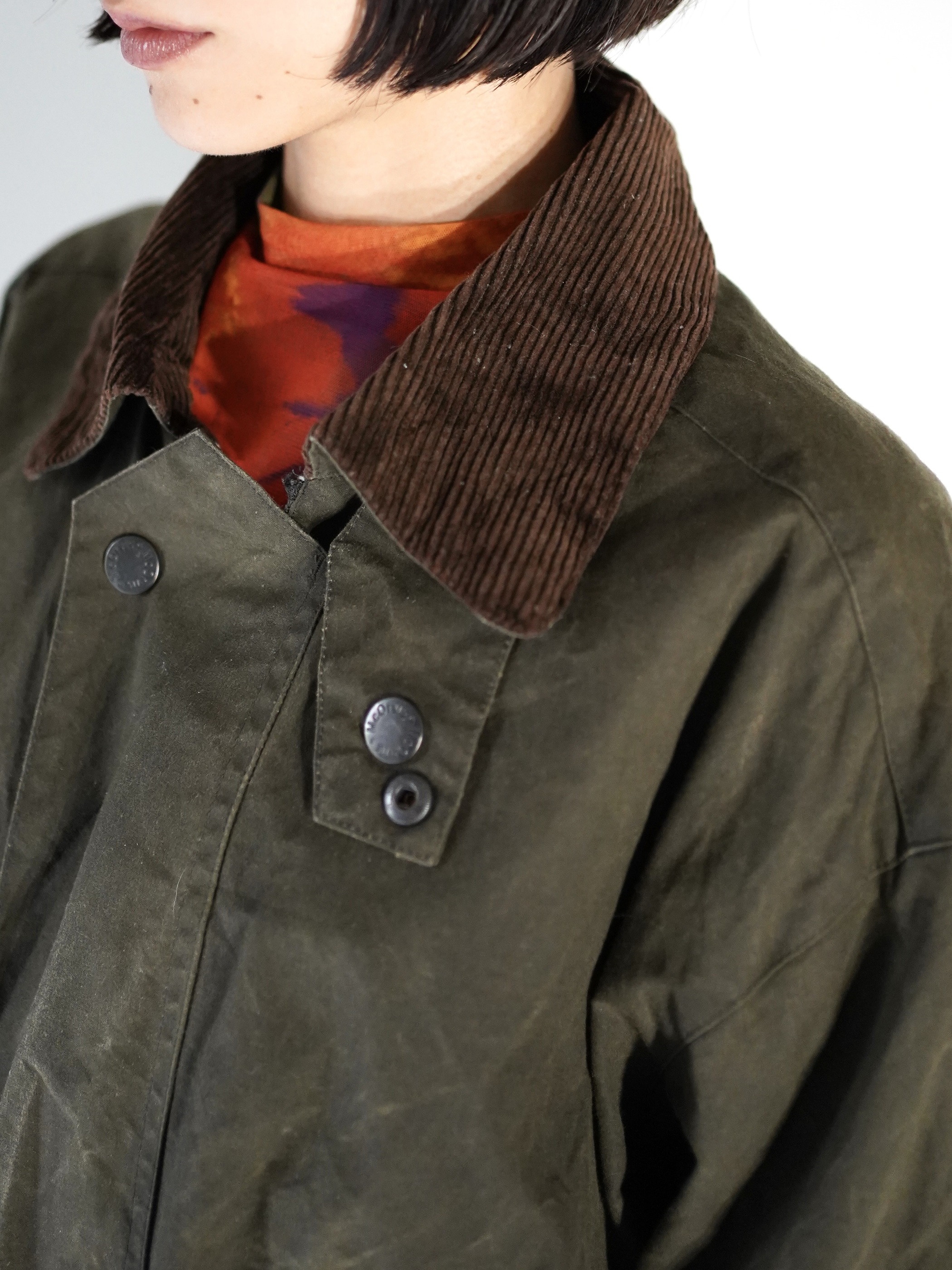 ボディは深みのあるカーキ、襟はブラウンのコーデュロイの秋らしい良配色