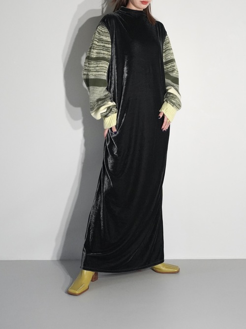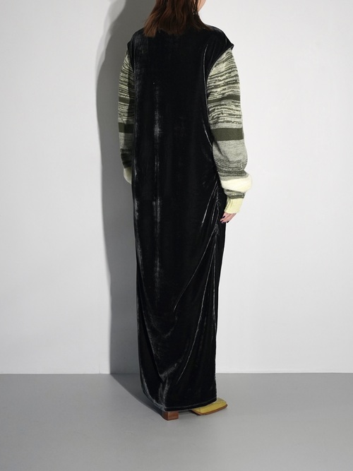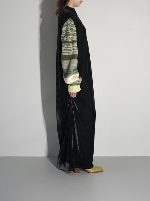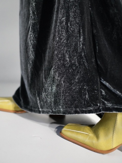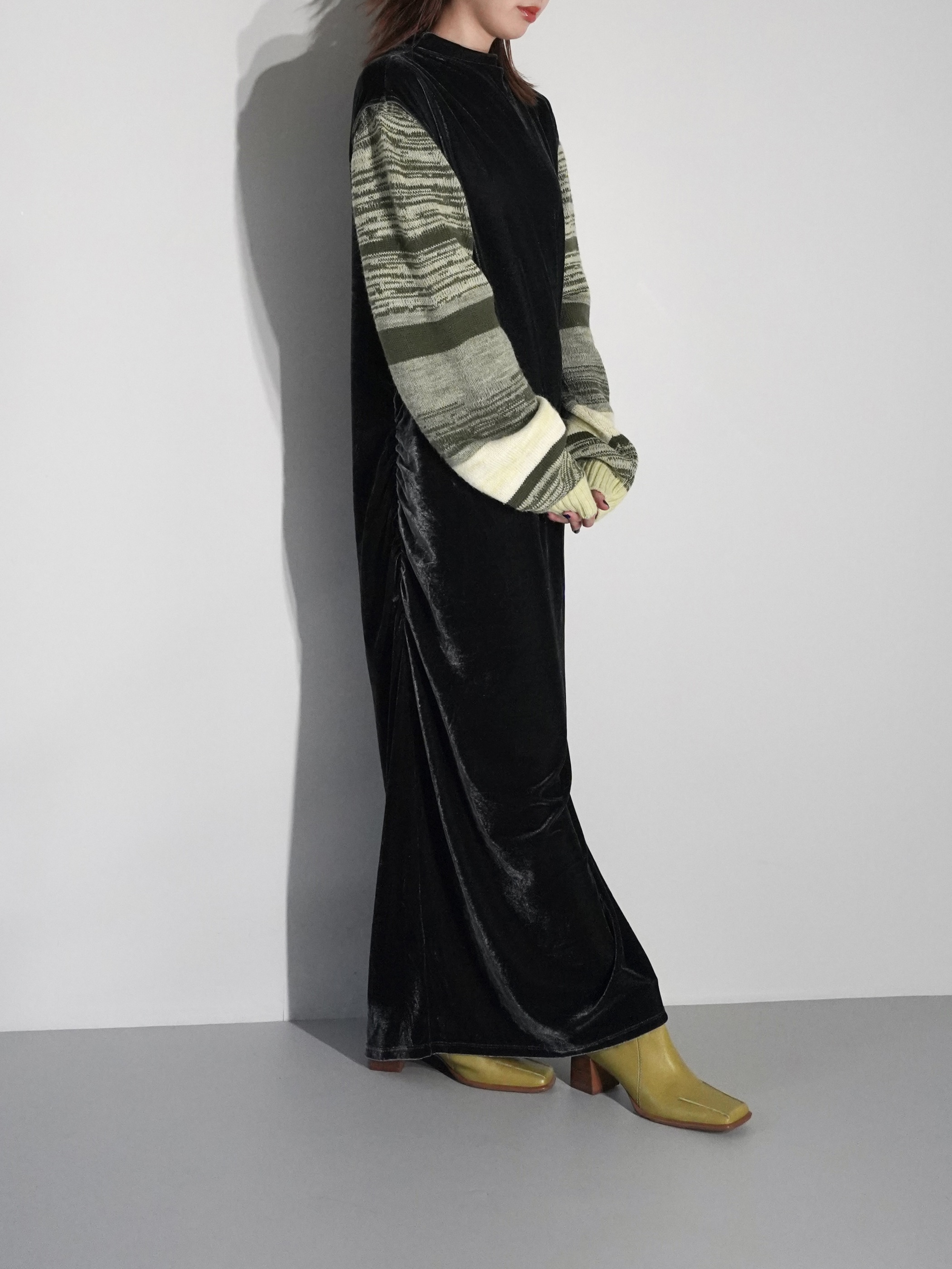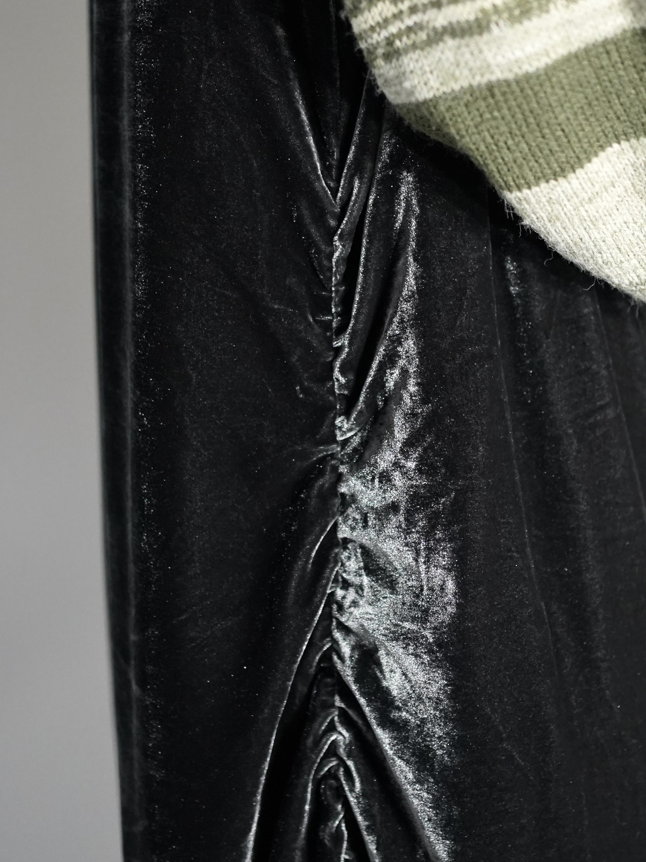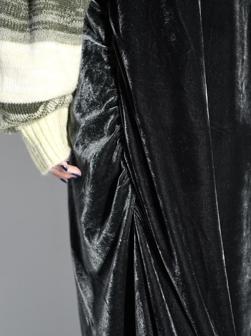 サイドはさり気なくギャザーが寄せられることによって平面的にならず、裾に向かって自然にドレープを生み出している仕立て