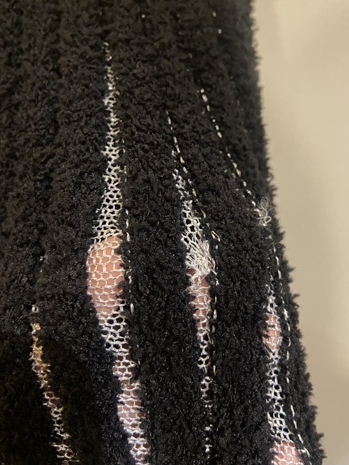黒の部分はパイル素材、それをつなぎ合わせるシルバーの糸でストライプの柄を作り上げている面白いデザイン。
