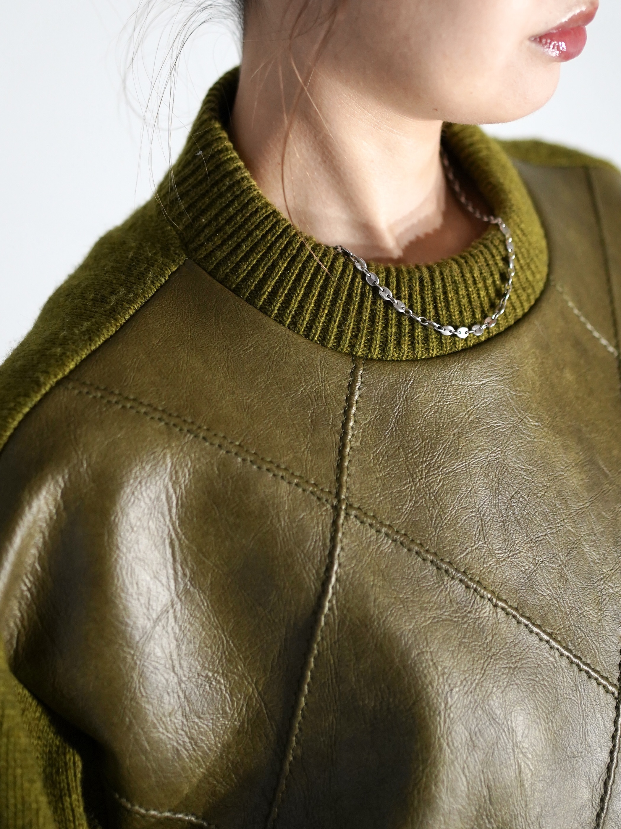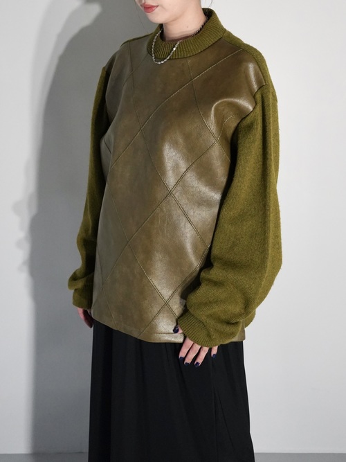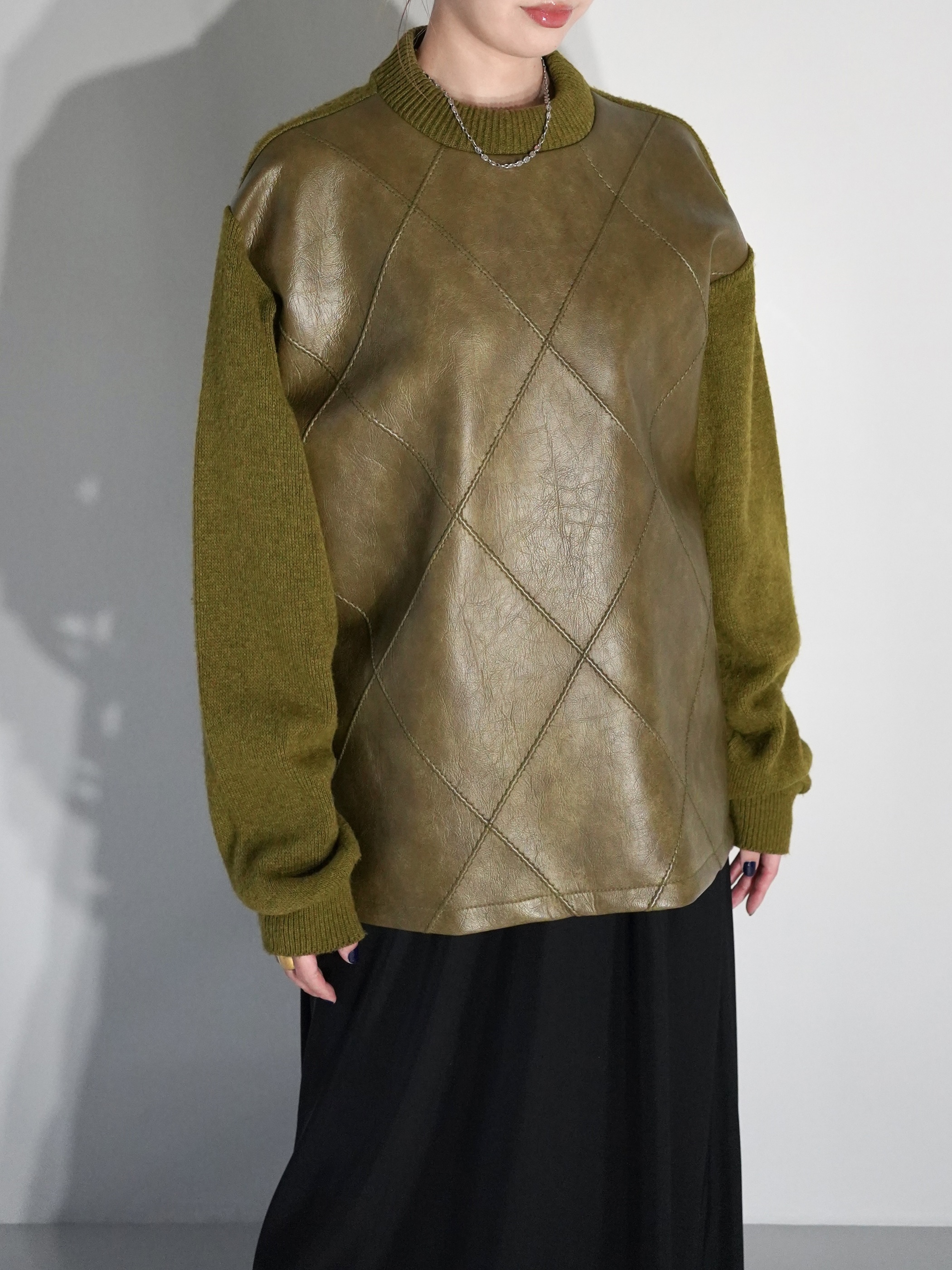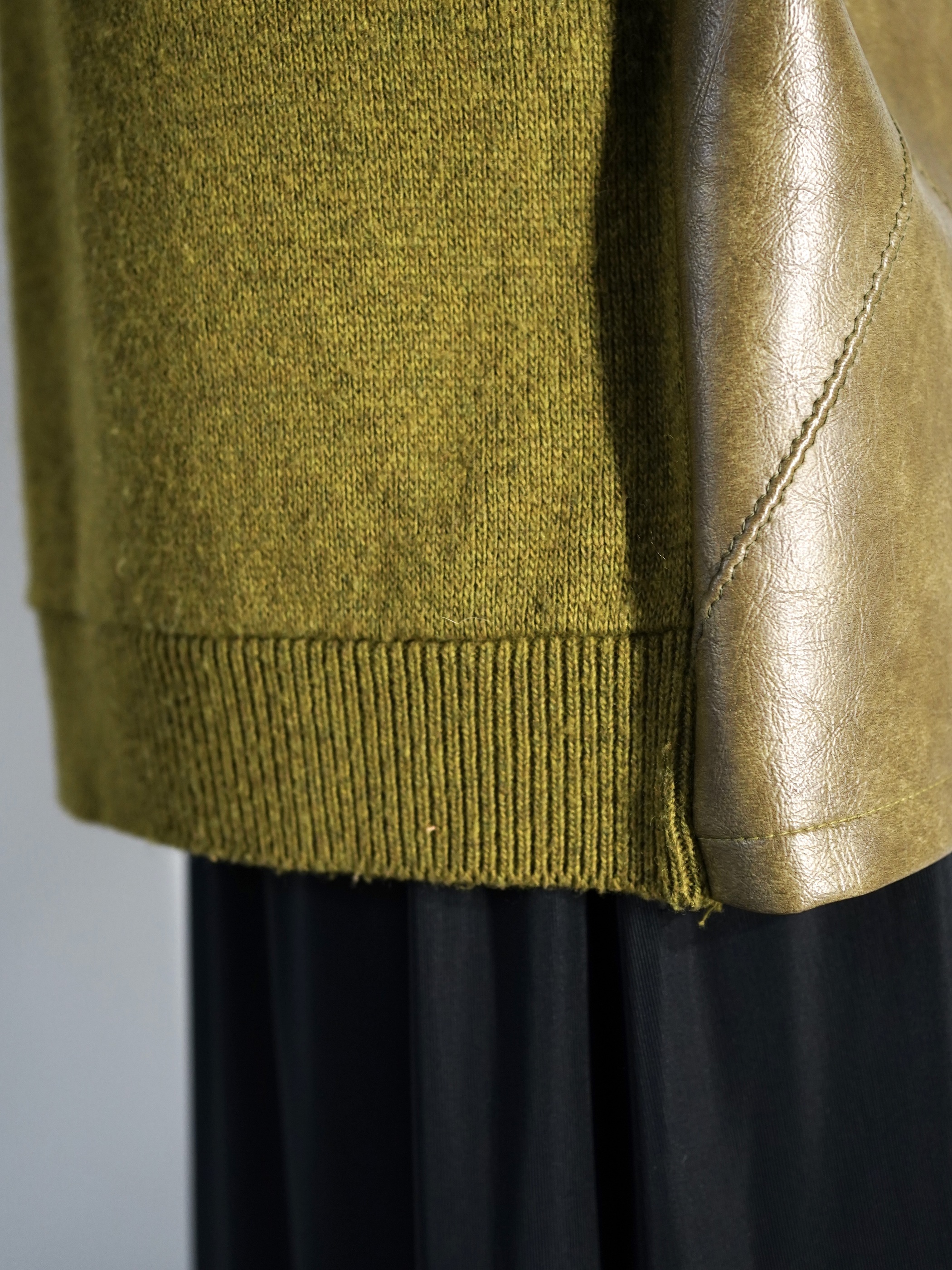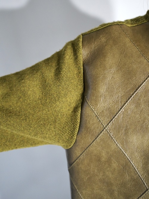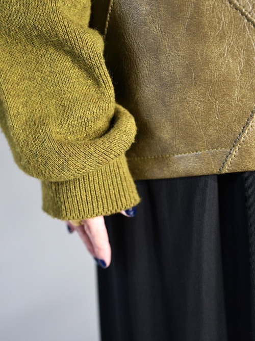 コーティング加工されたフェイクレザーとウールニットの異素材を組み合わせたスイッチングデザイン