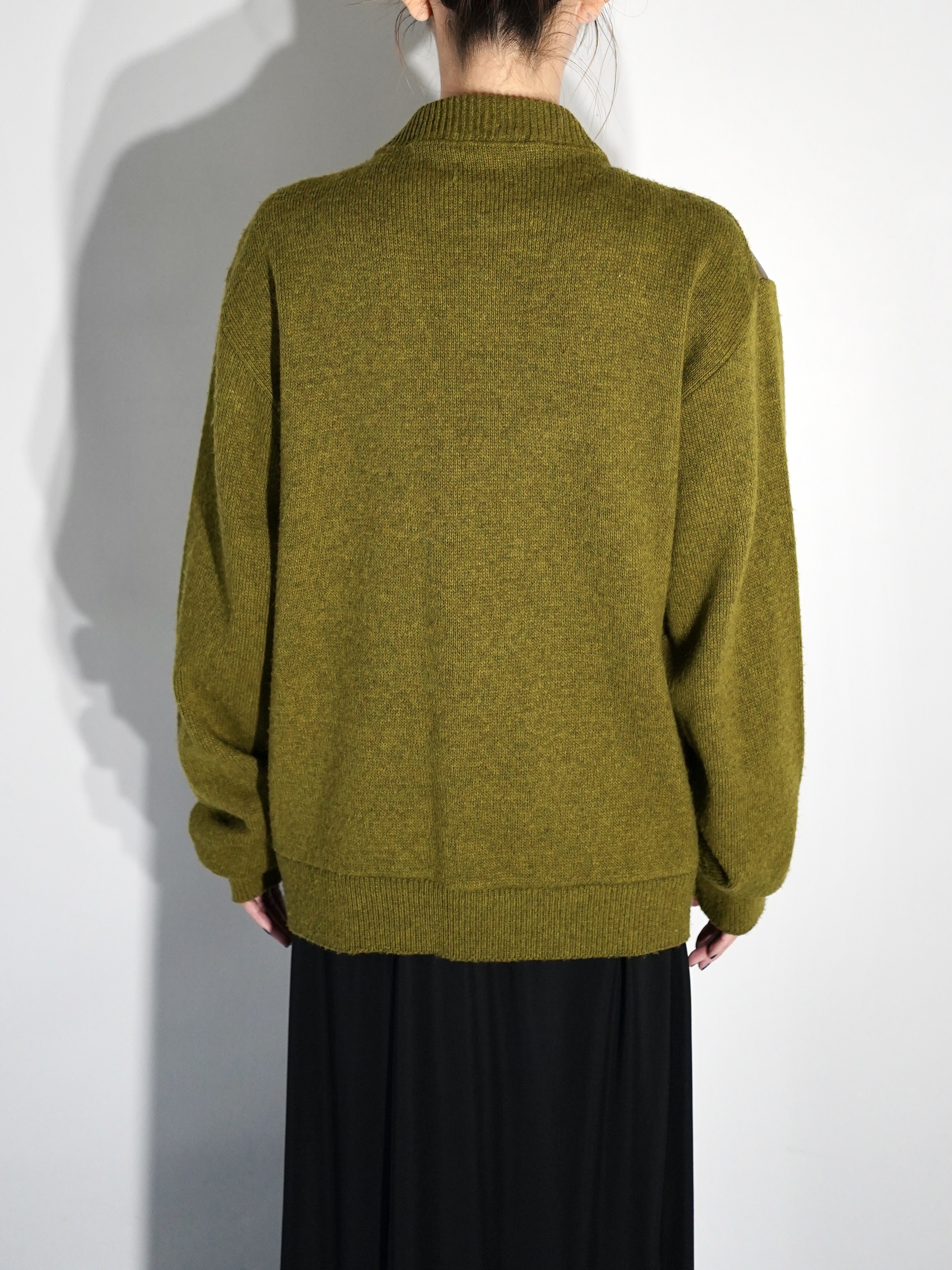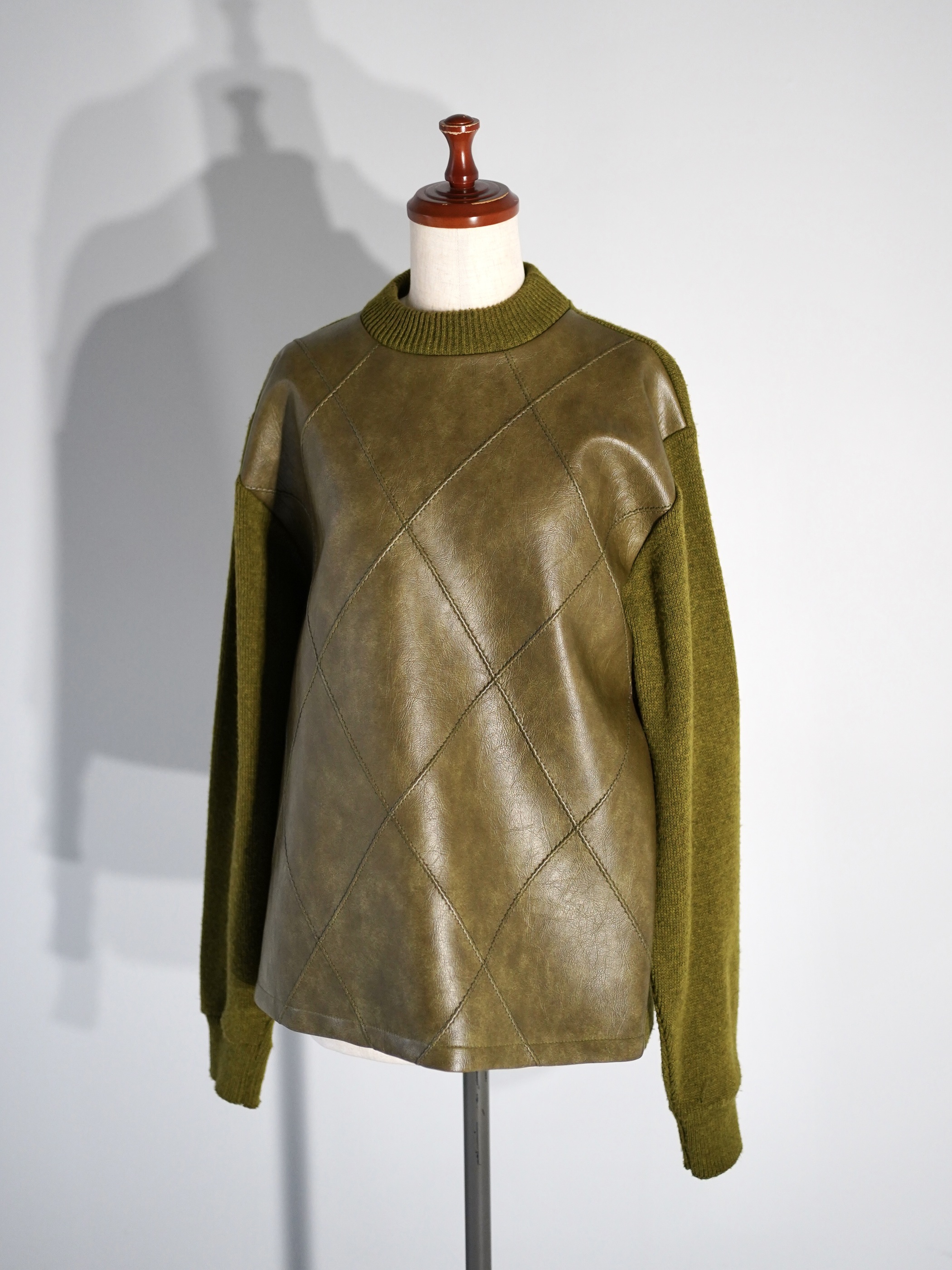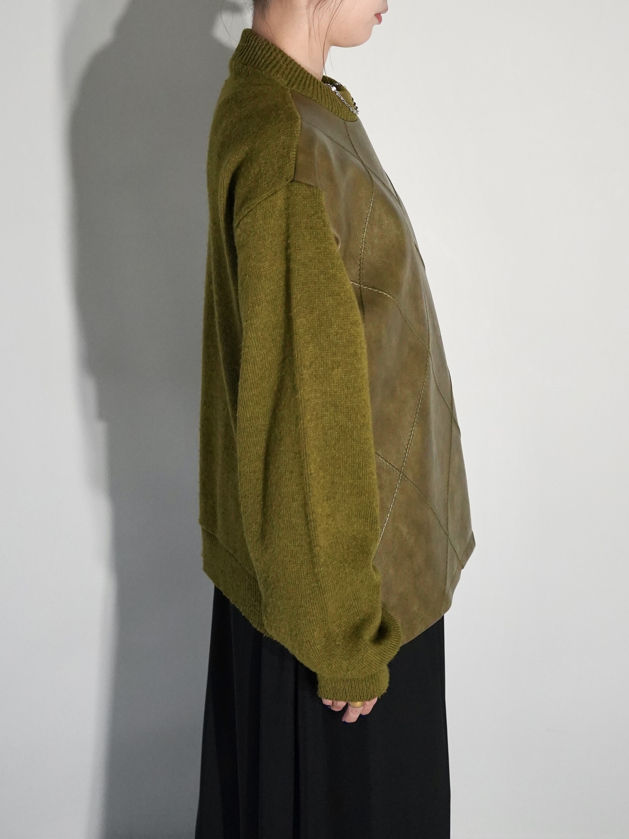 コーティング加工されたフェイクレザーとウールニットの異素材を組み合わせたスイッチングデザイン