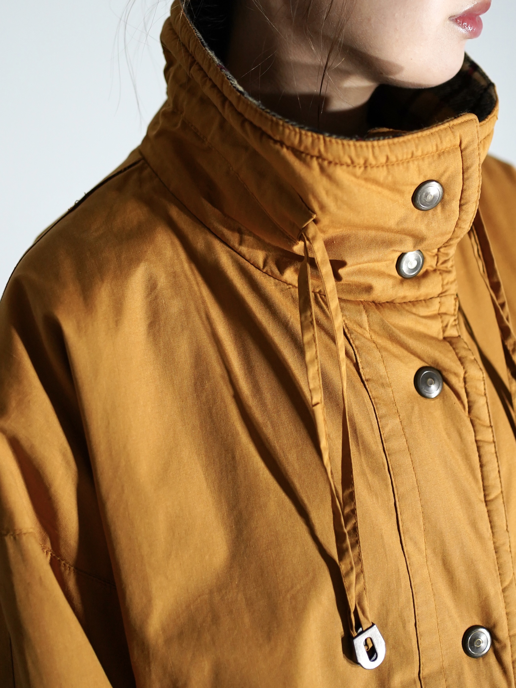 襟元はハンティングを意識して高めに設定をしているが、スナップボタンで開いた際、大きく広がるデザインが良し