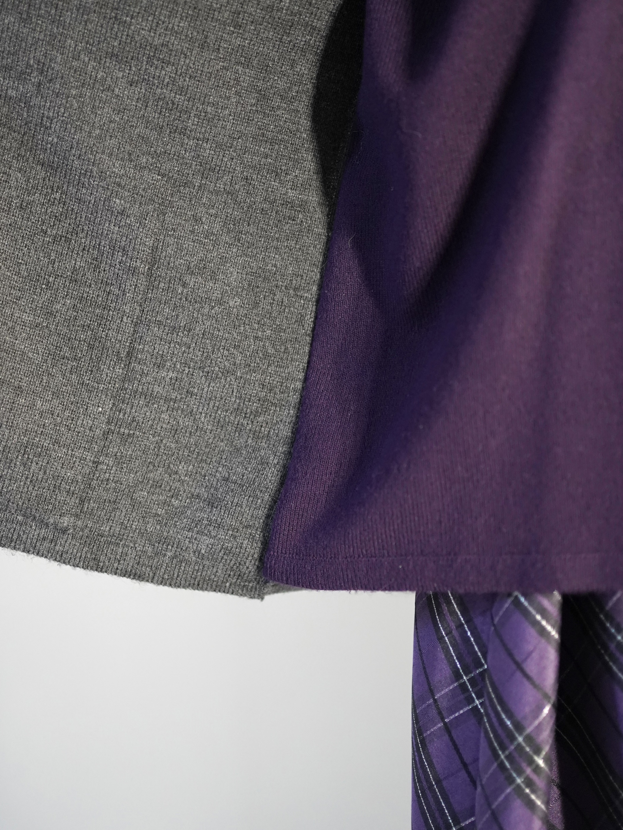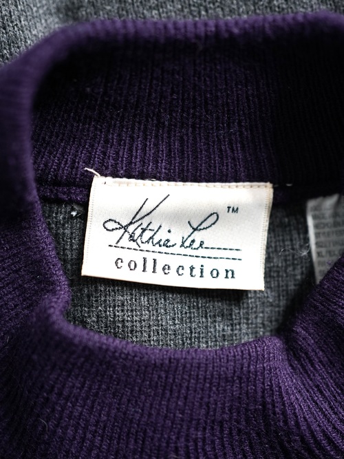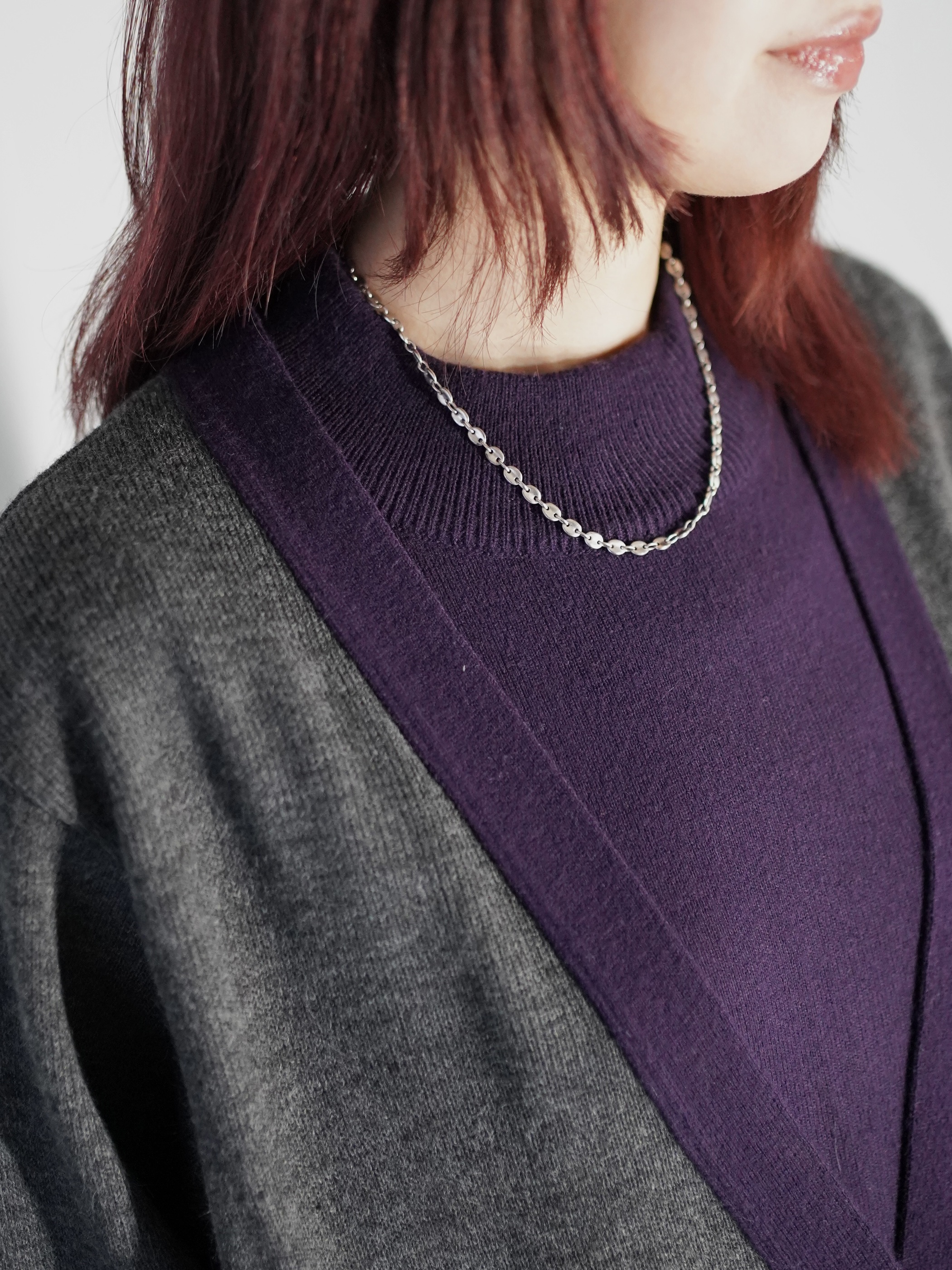モックネックニットにカーディガンをレイヤードした様なバイカラーセーター
