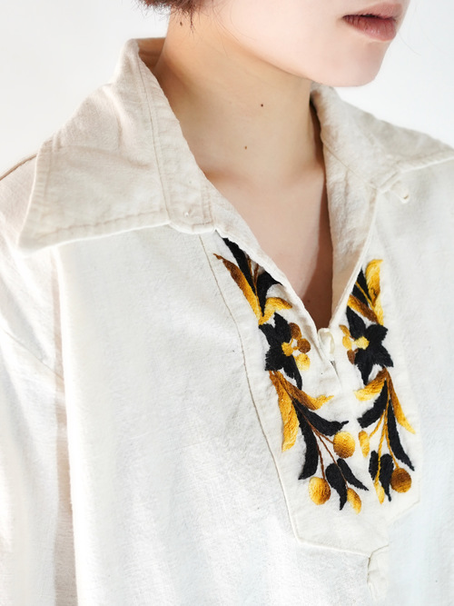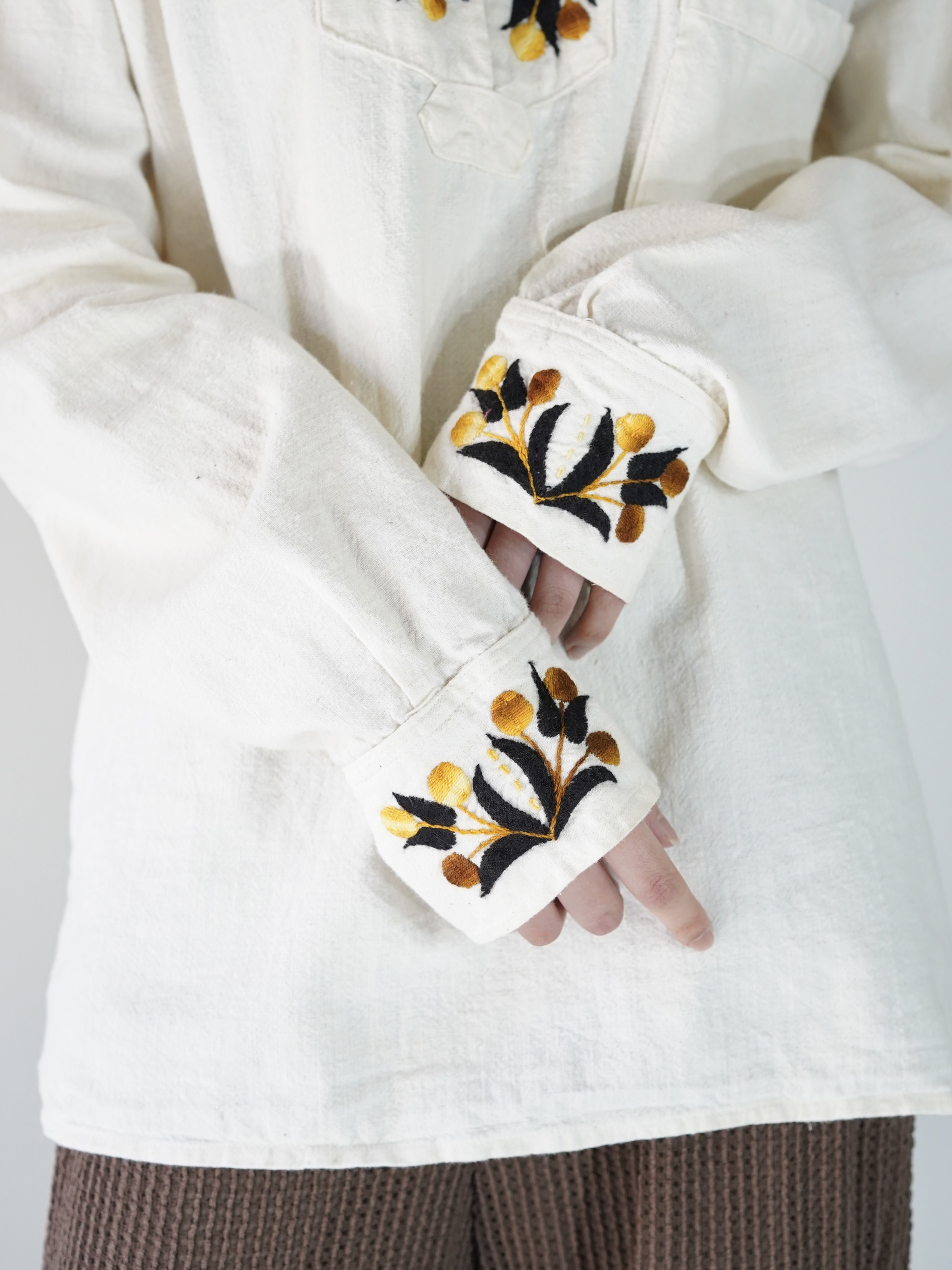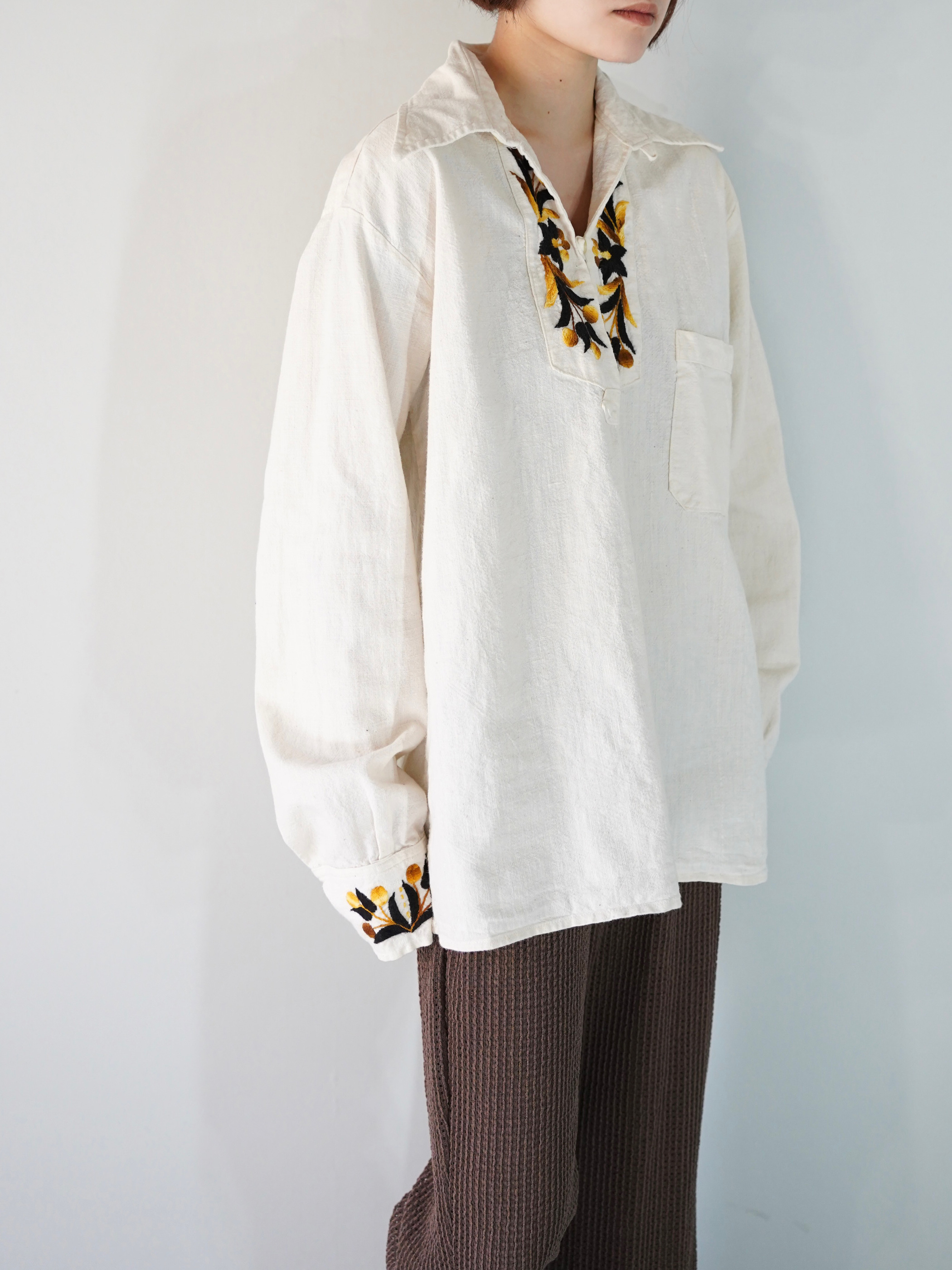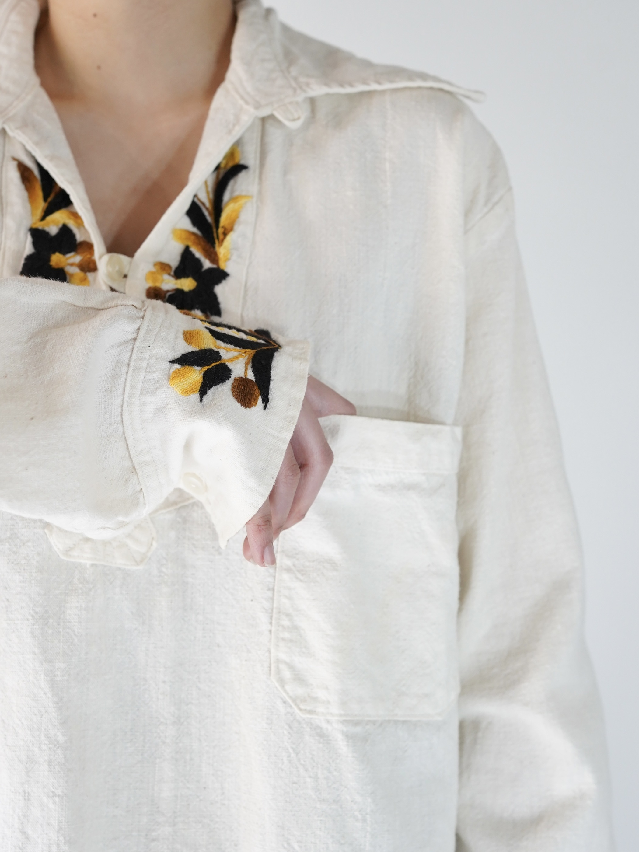 首元と袖口の、程良く主張する花の刺繍が華やかさを足している印象