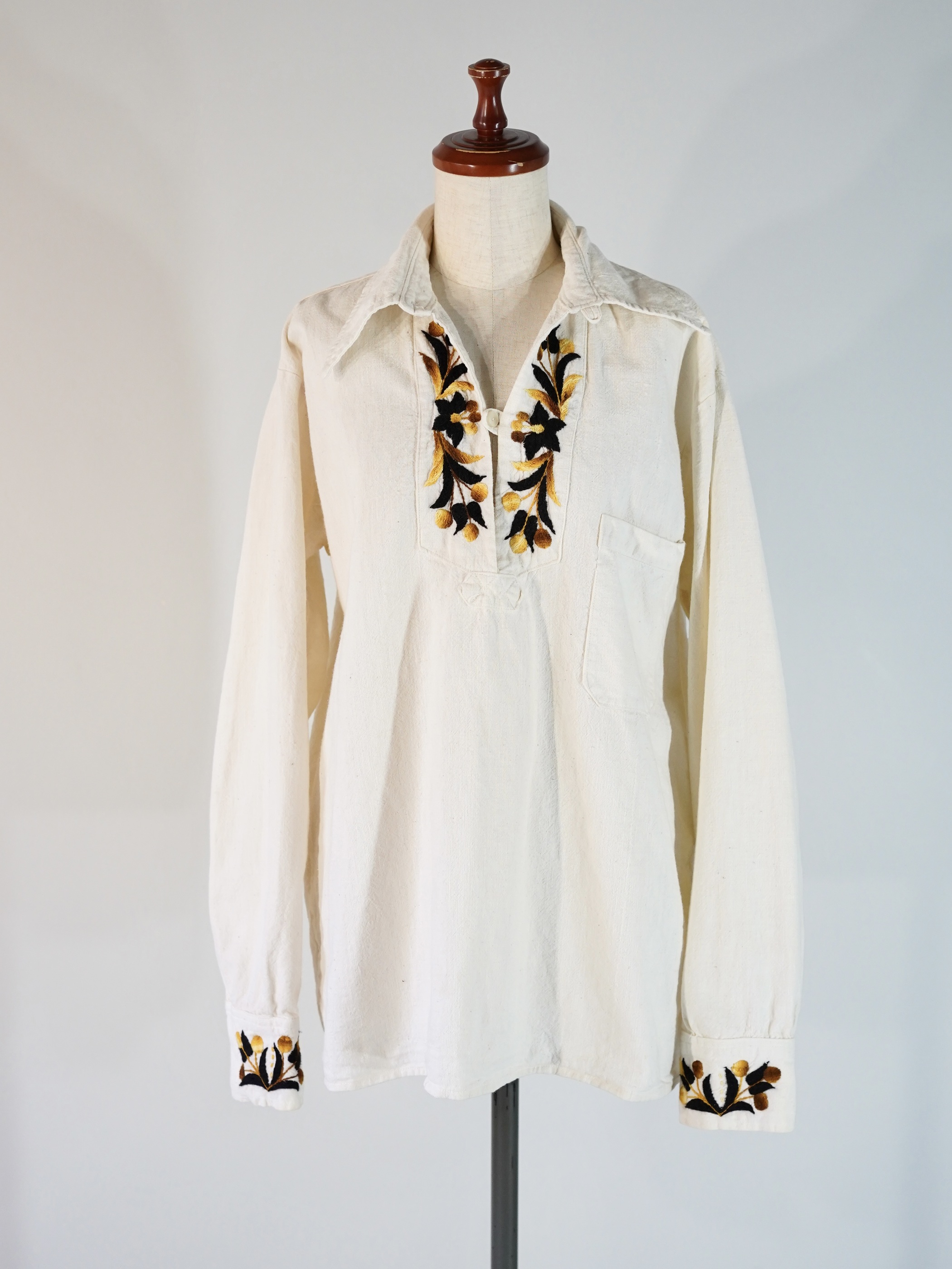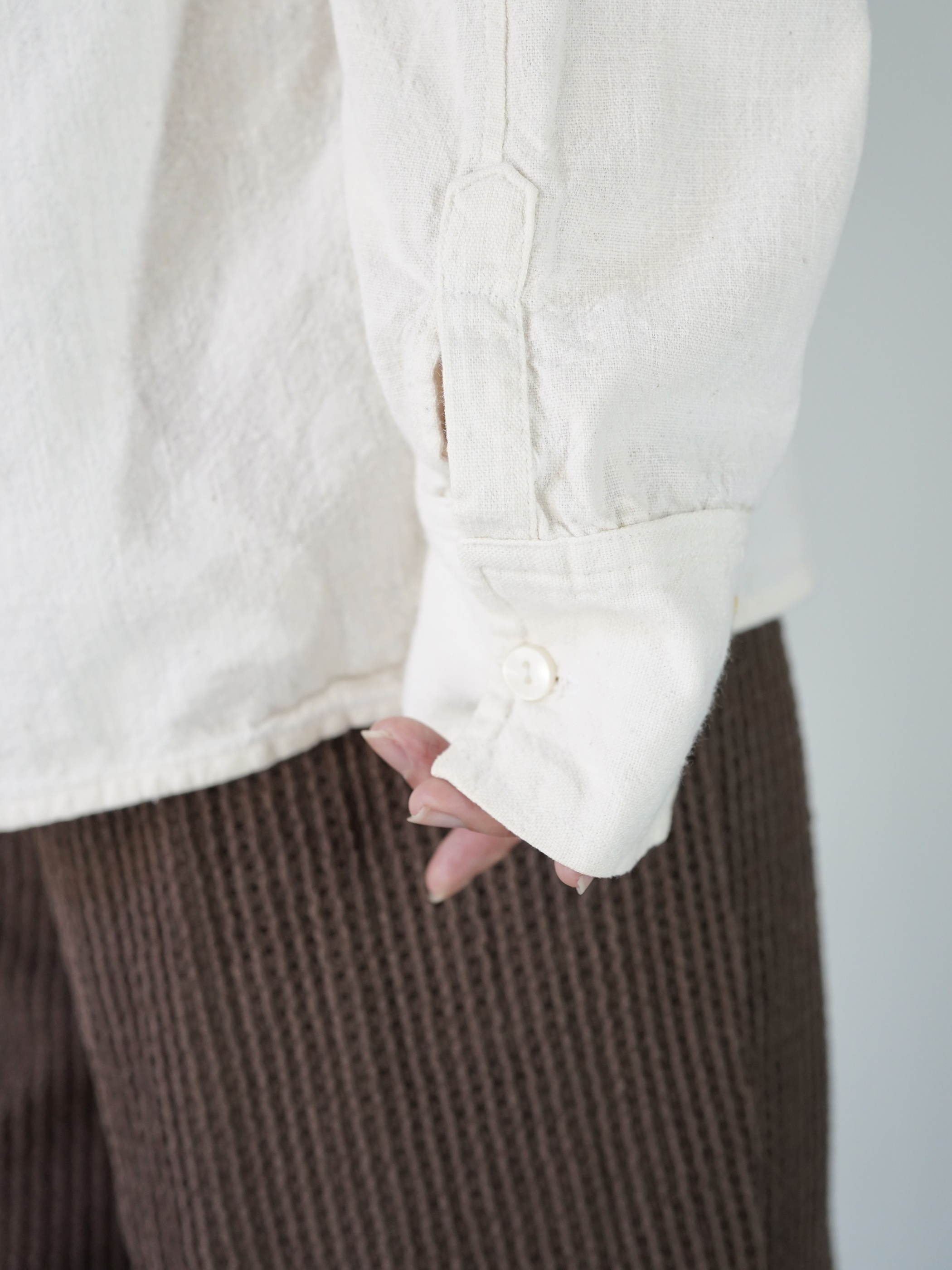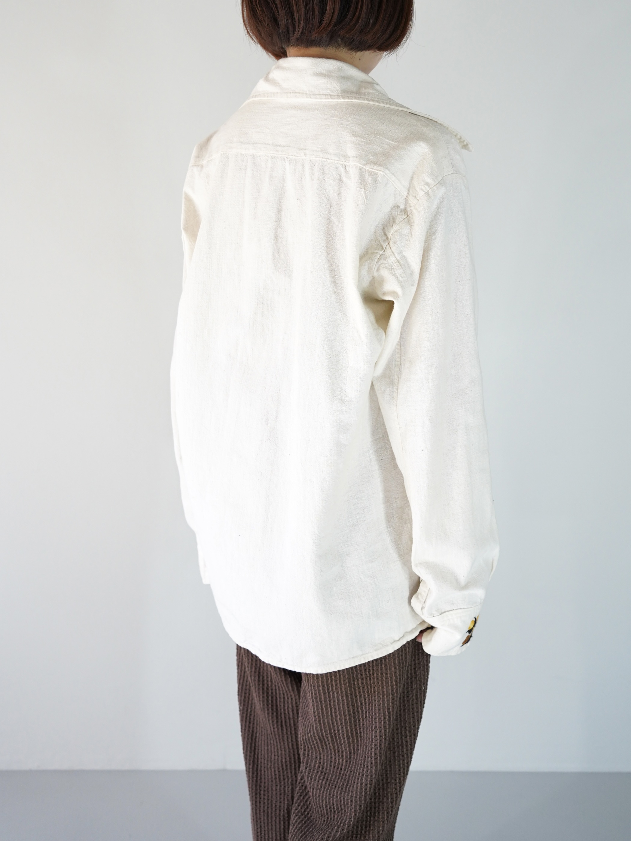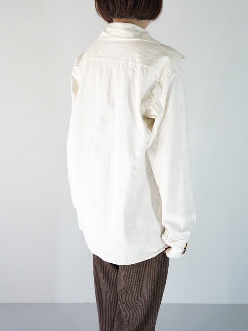 肌触りの良いナチュラルな風合いのコットンをベースにし、70sらしい外側に尖った襟が馴染み 着易さのある1着です。