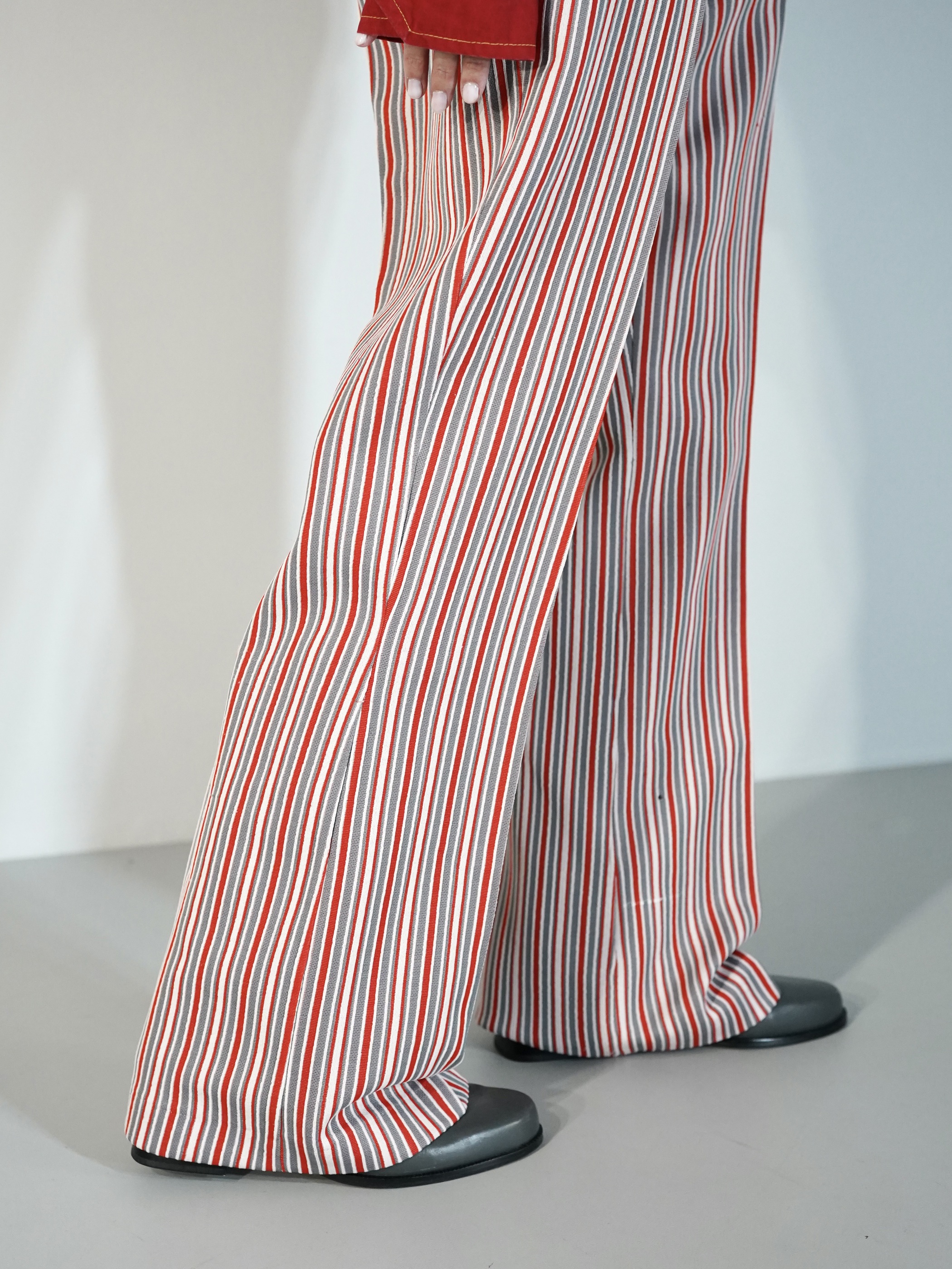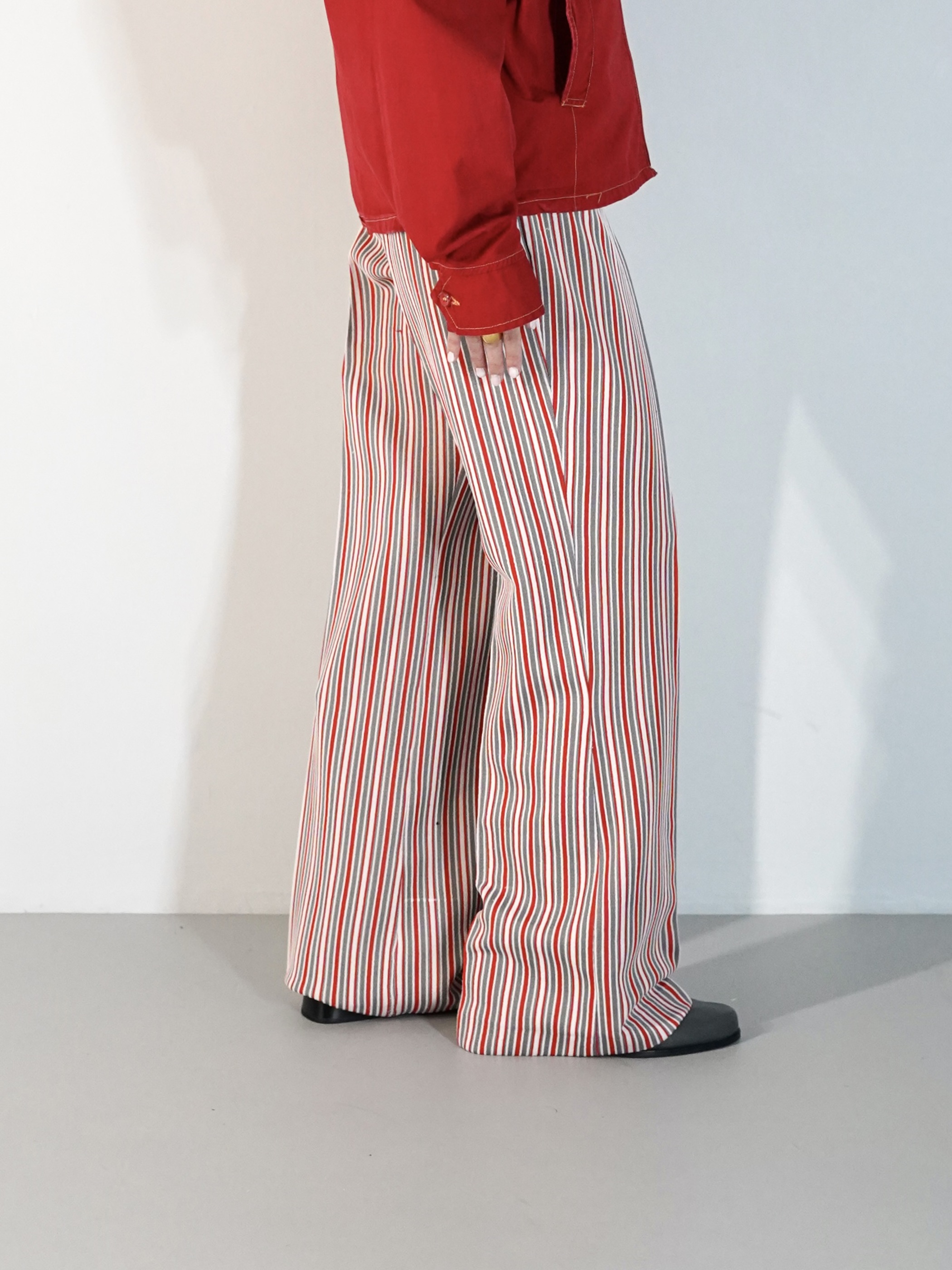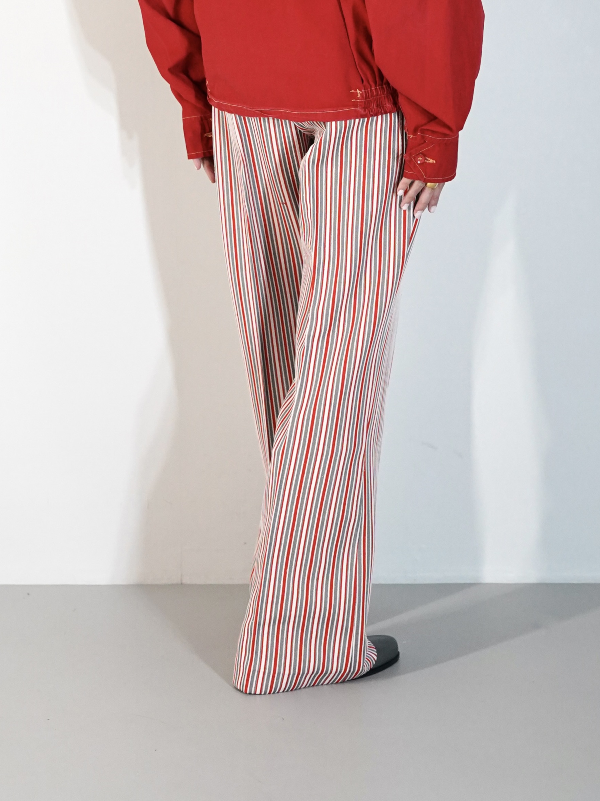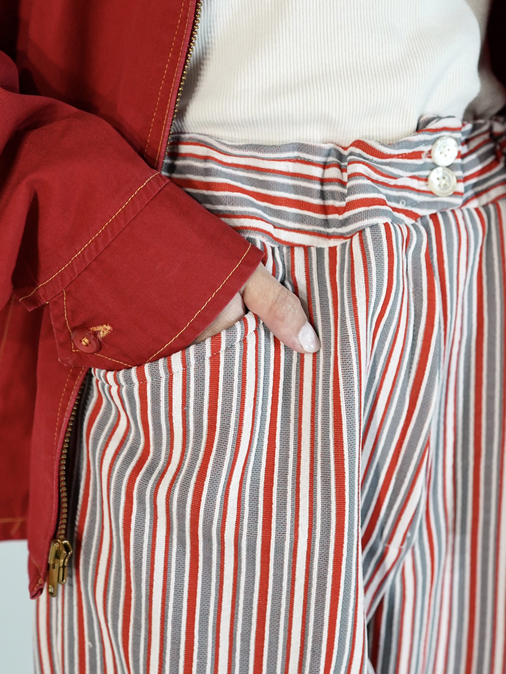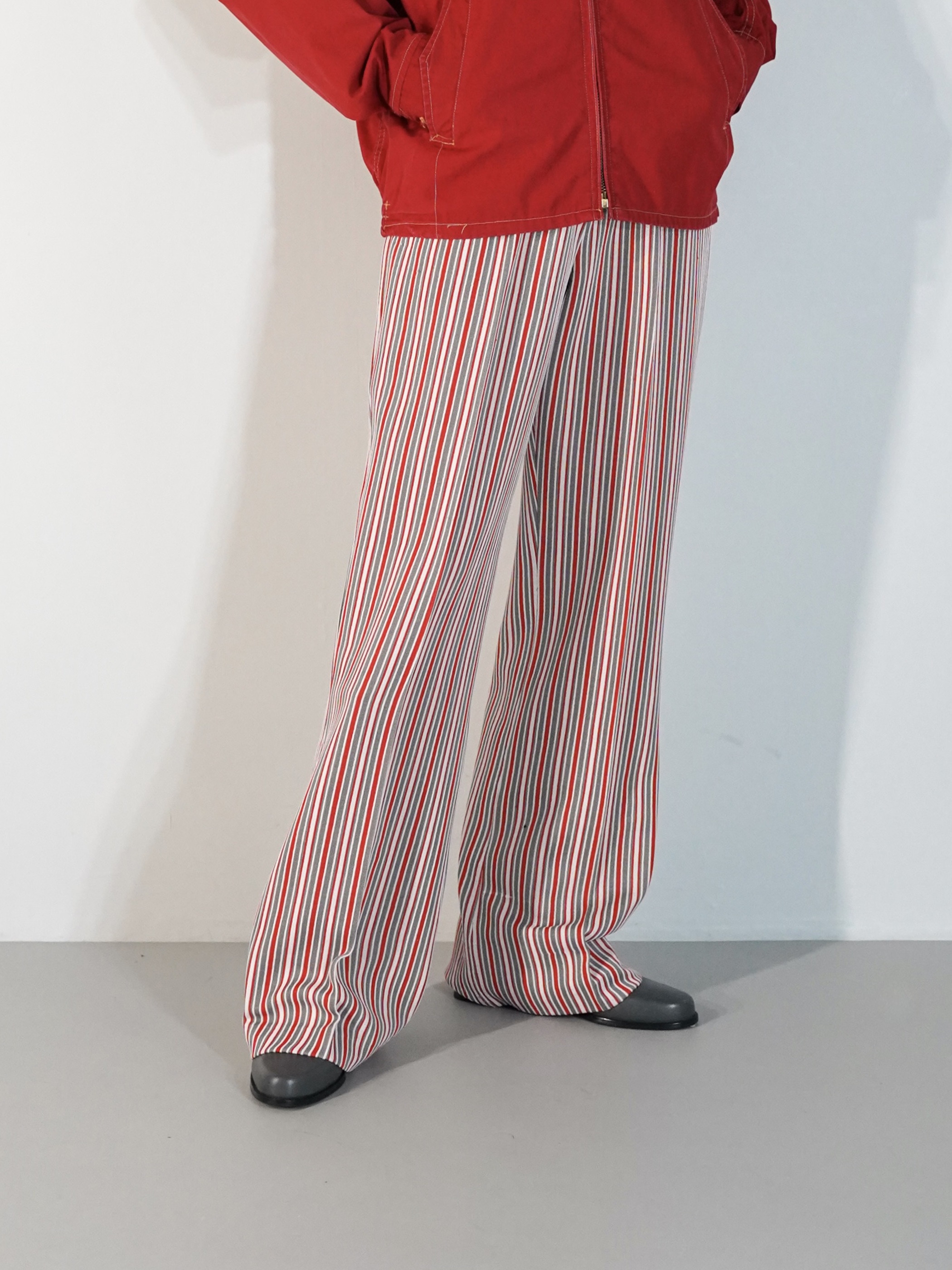 70sのポリパンツにしてはワタリに余裕があり、緩やかに裾に向かって広がるフレアシルエットでお持ちのアイテムに取り入れ易いのではないでしょうか