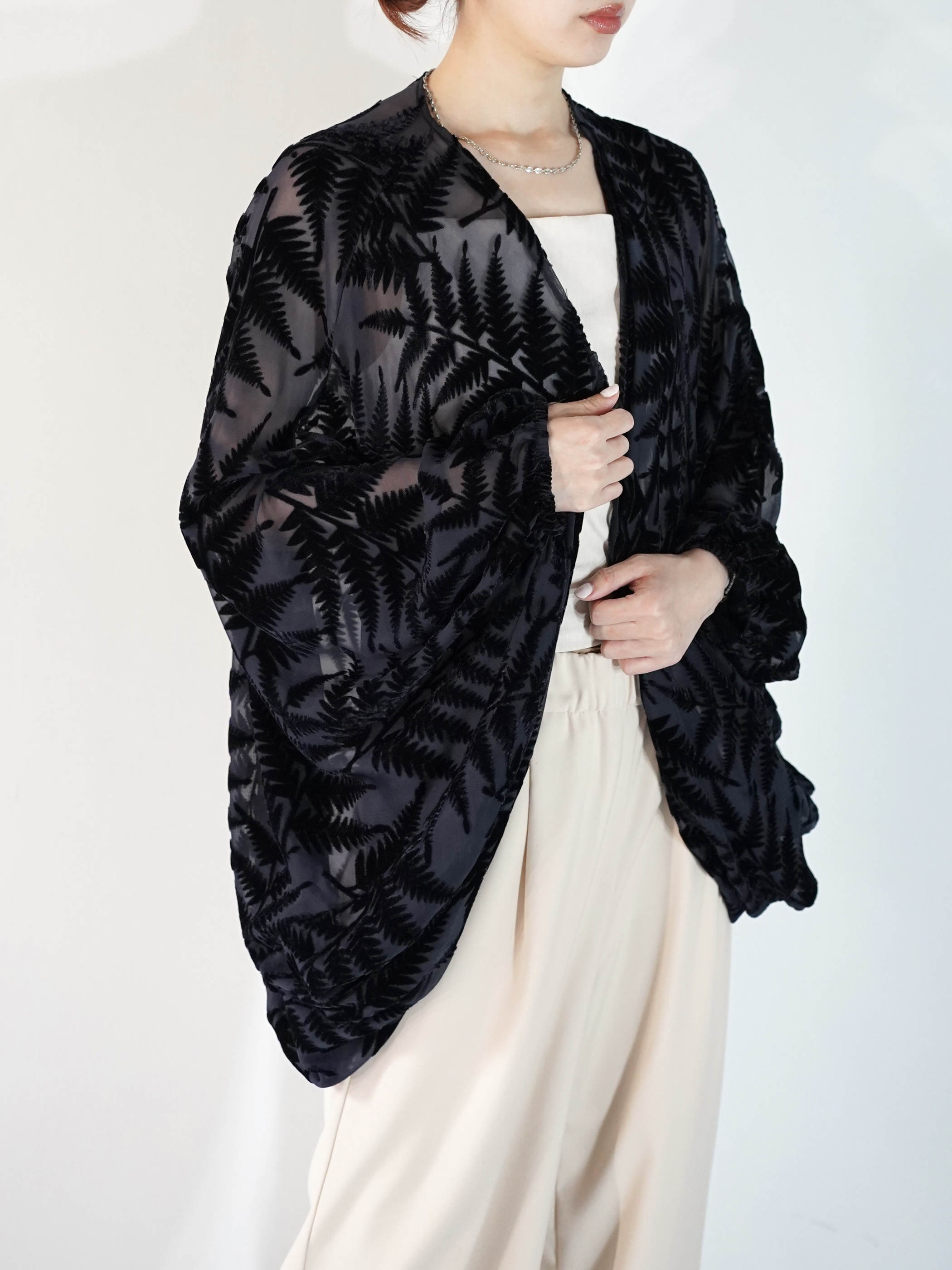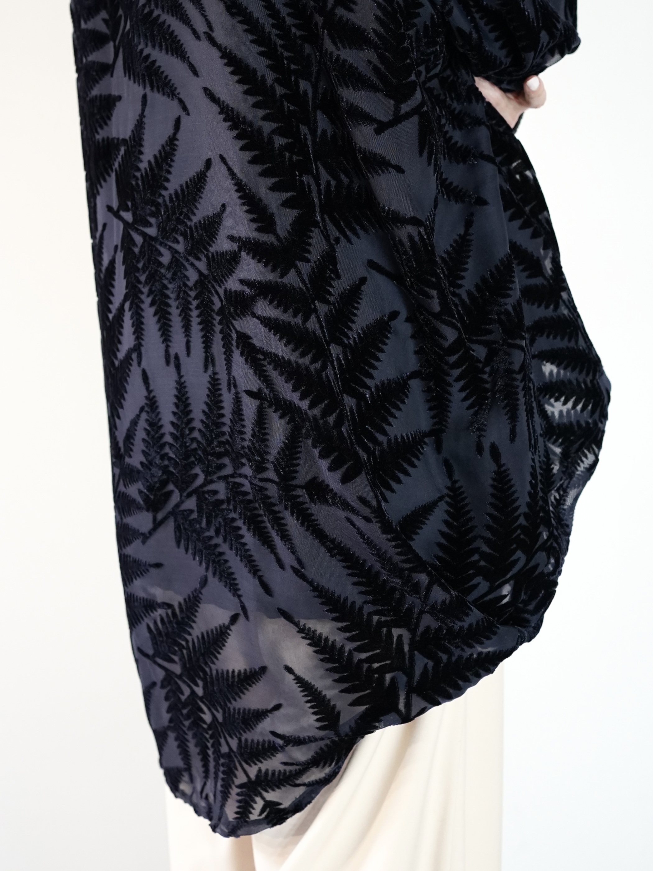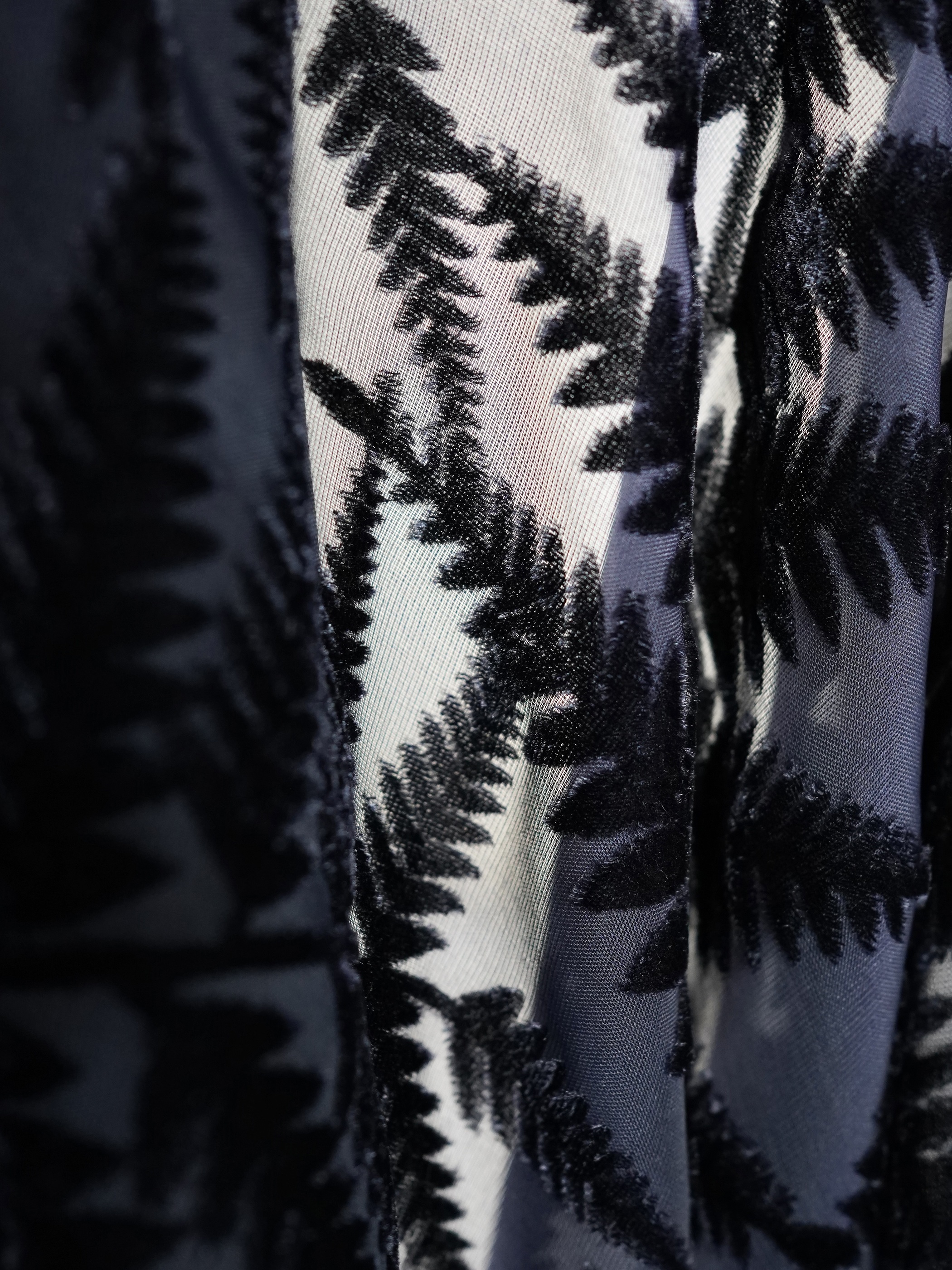 スタイリッシュで透け感のあるシアー素材とベルベット素材の立体のリーフ模様のガウン。
