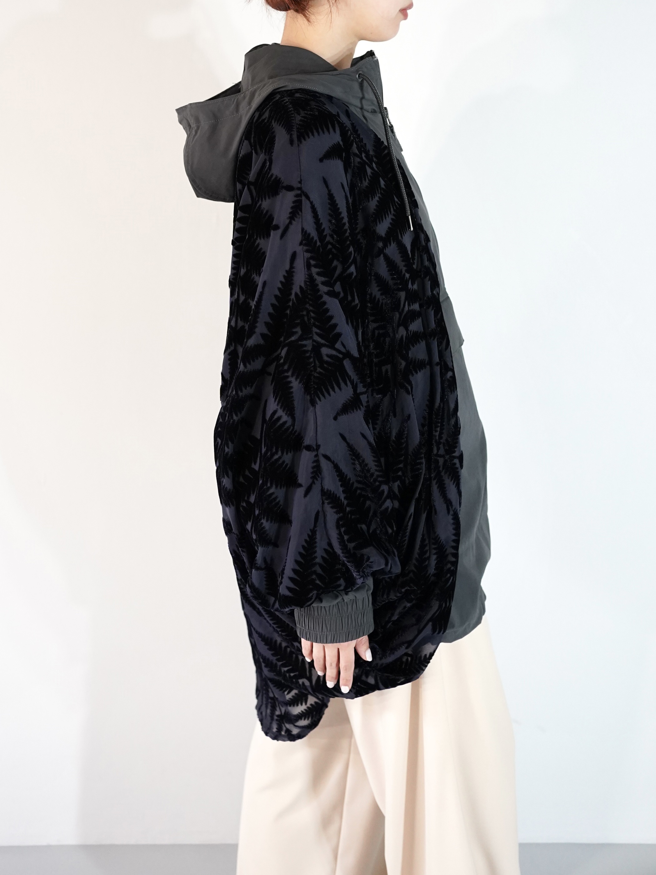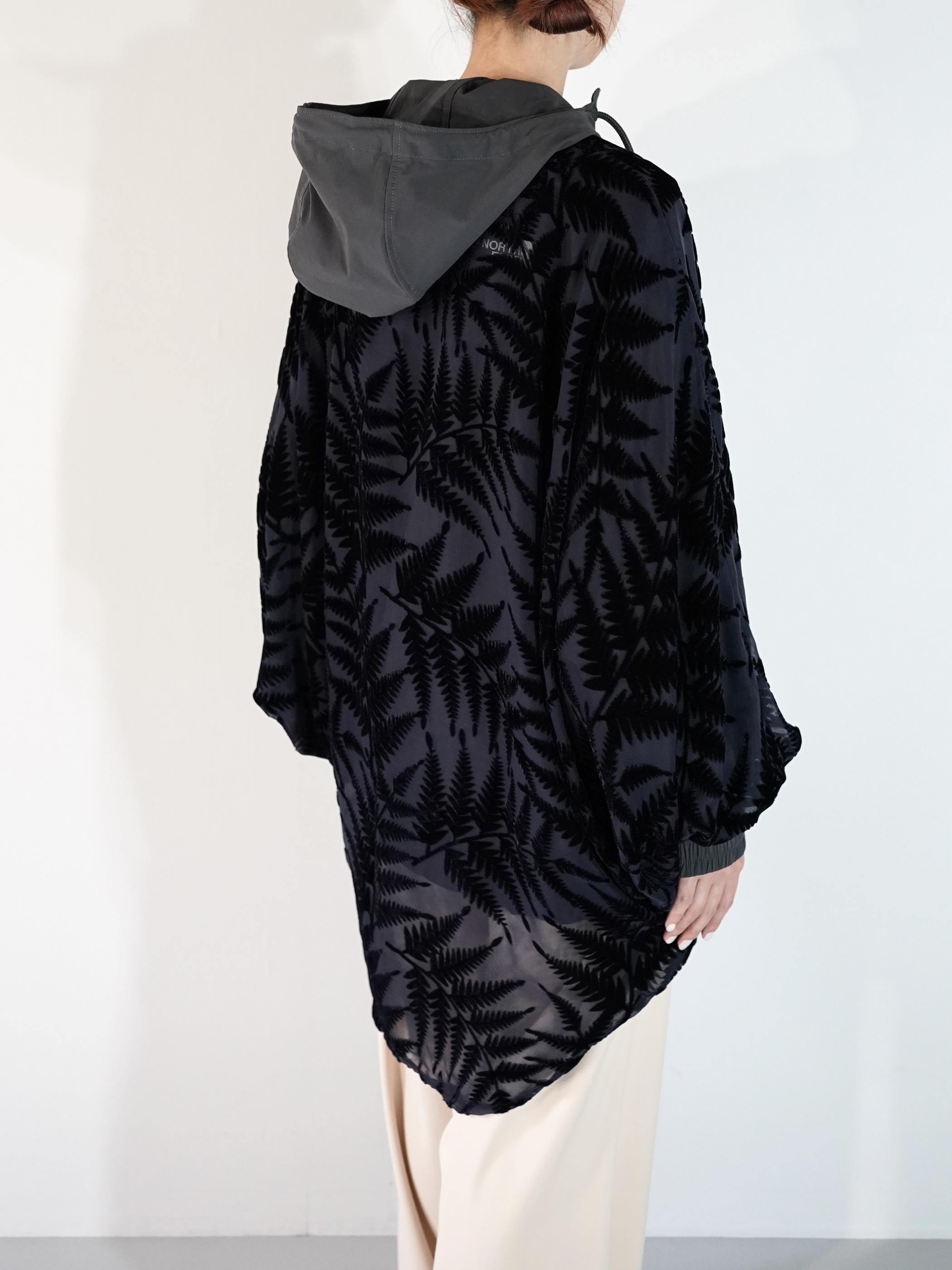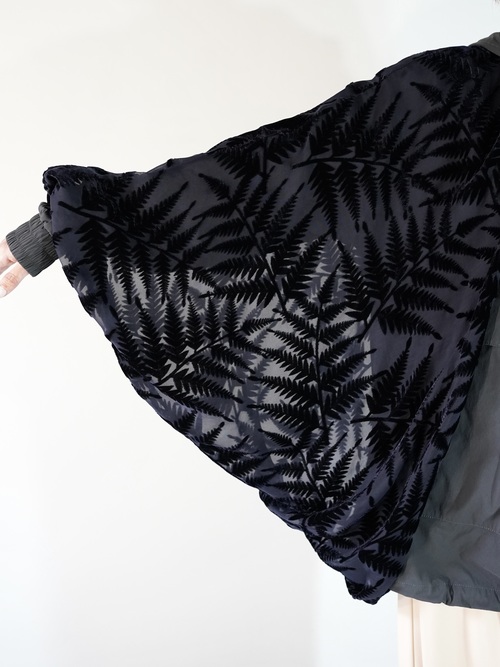 スタイリッシュで透け感のあるシアー素材とベルベット素材の立体のリーフ模様のガウン。