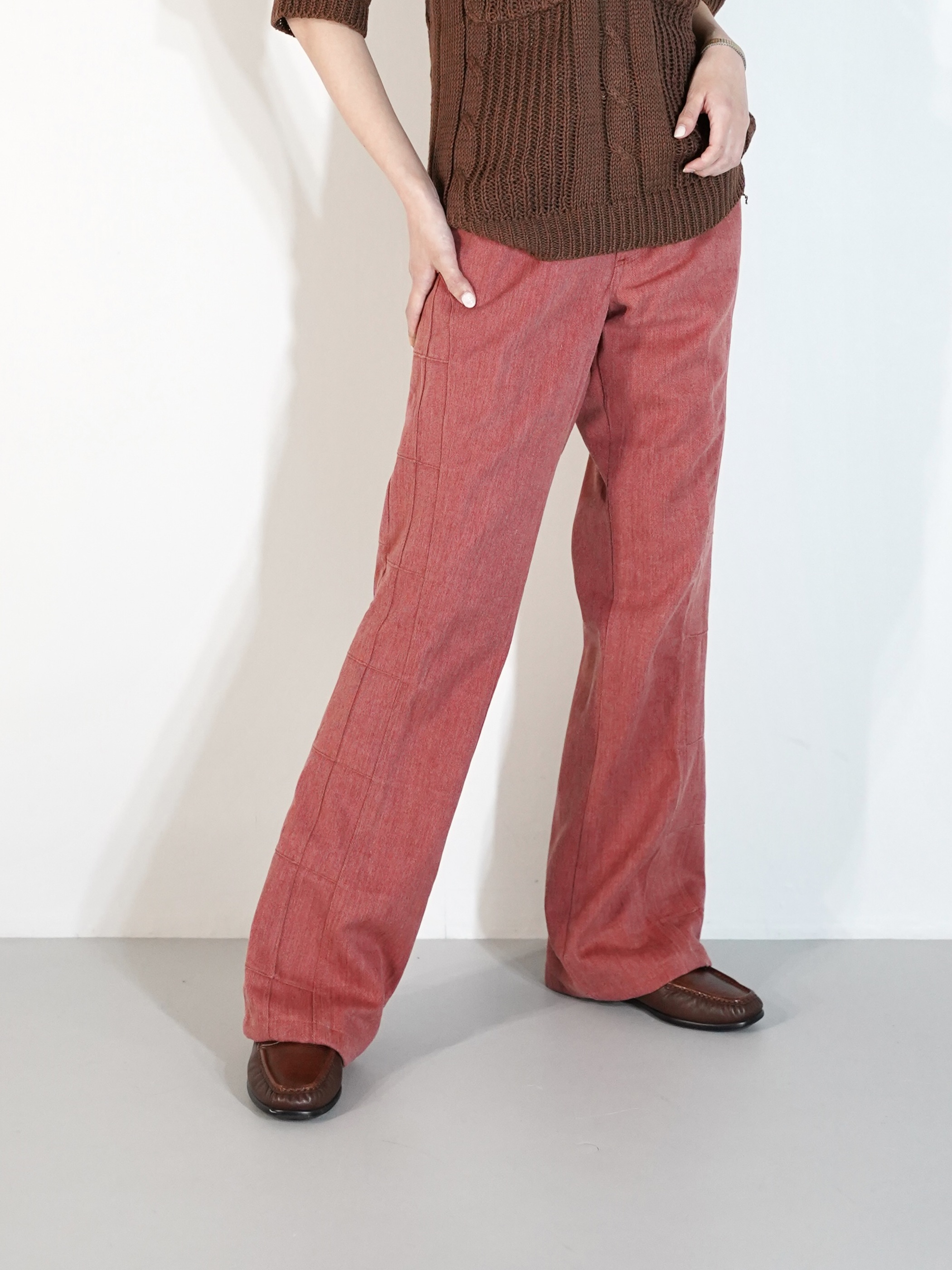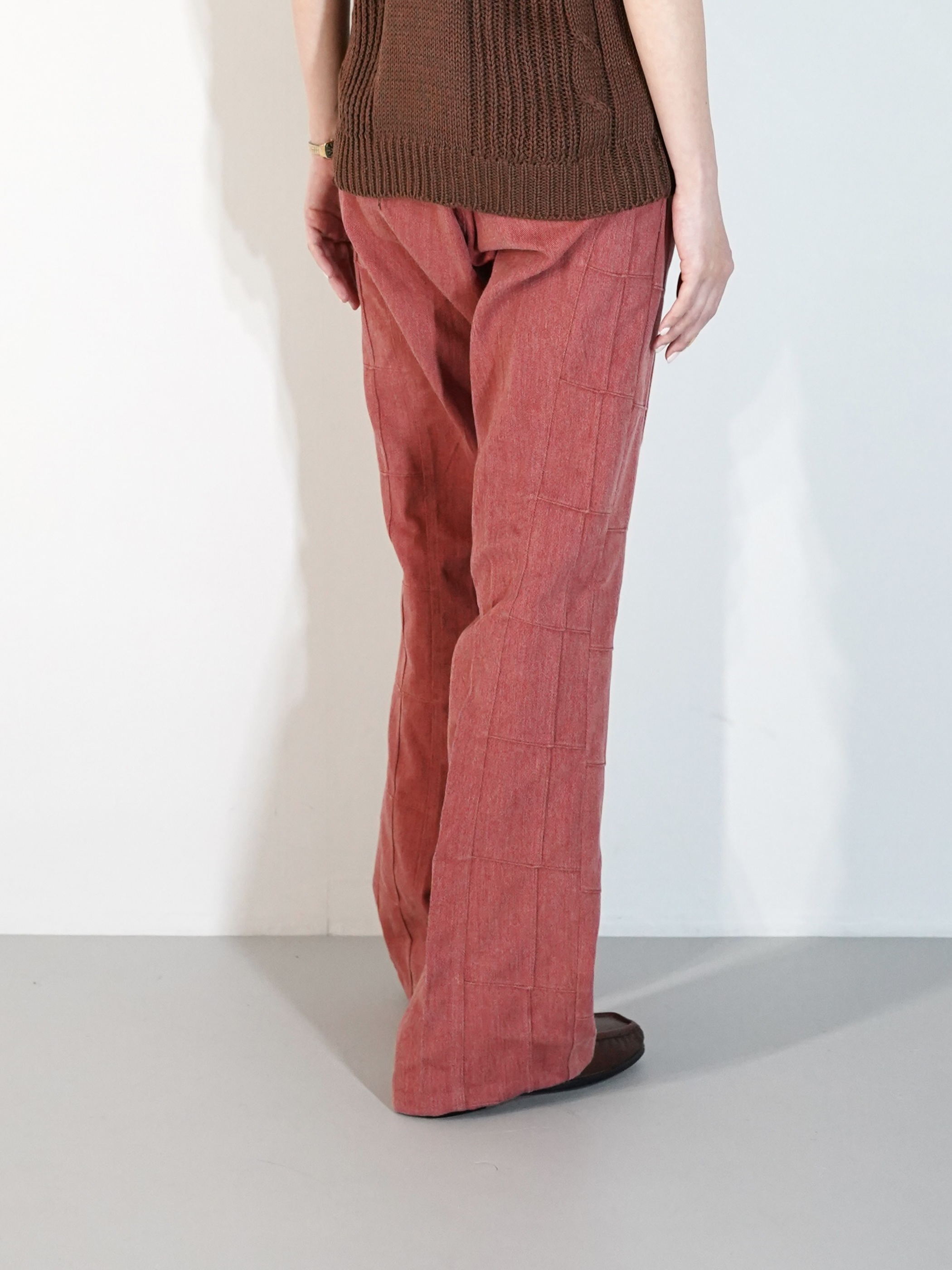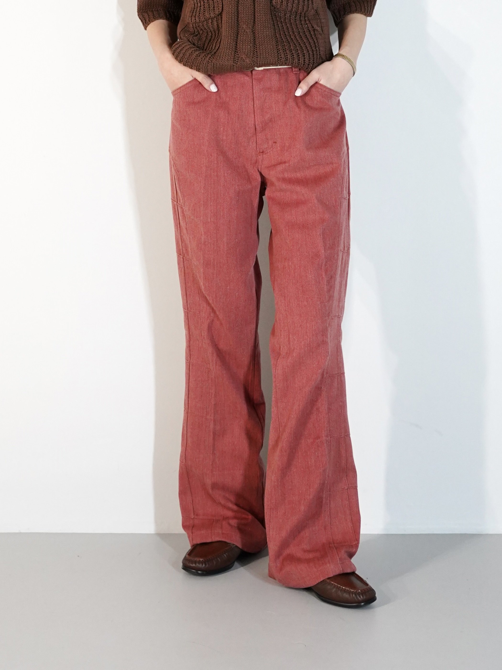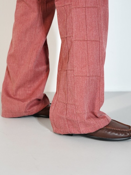 サイド部分に遊び心のあるデザインが施された、雰囲気があるフレアパンツ。