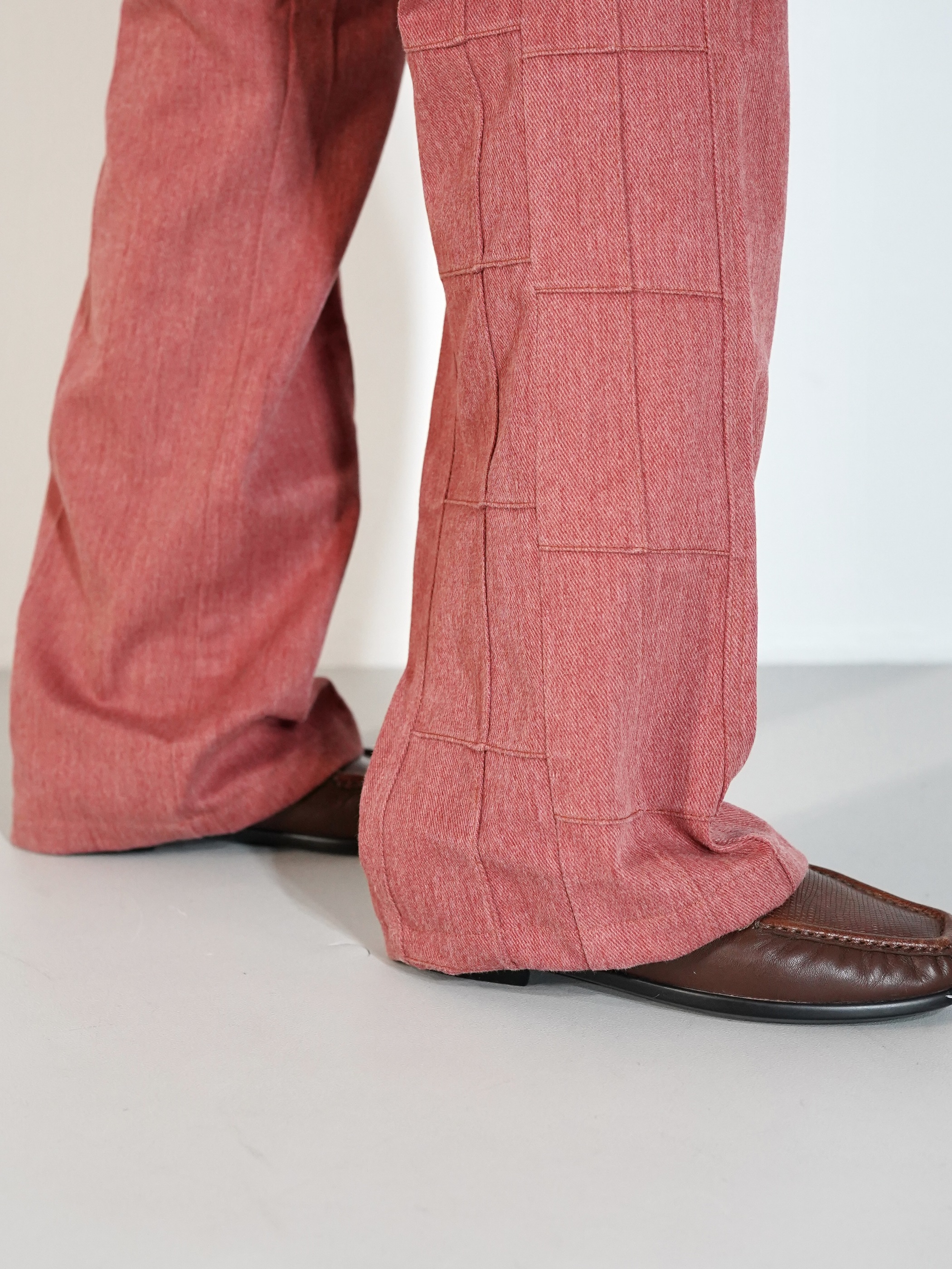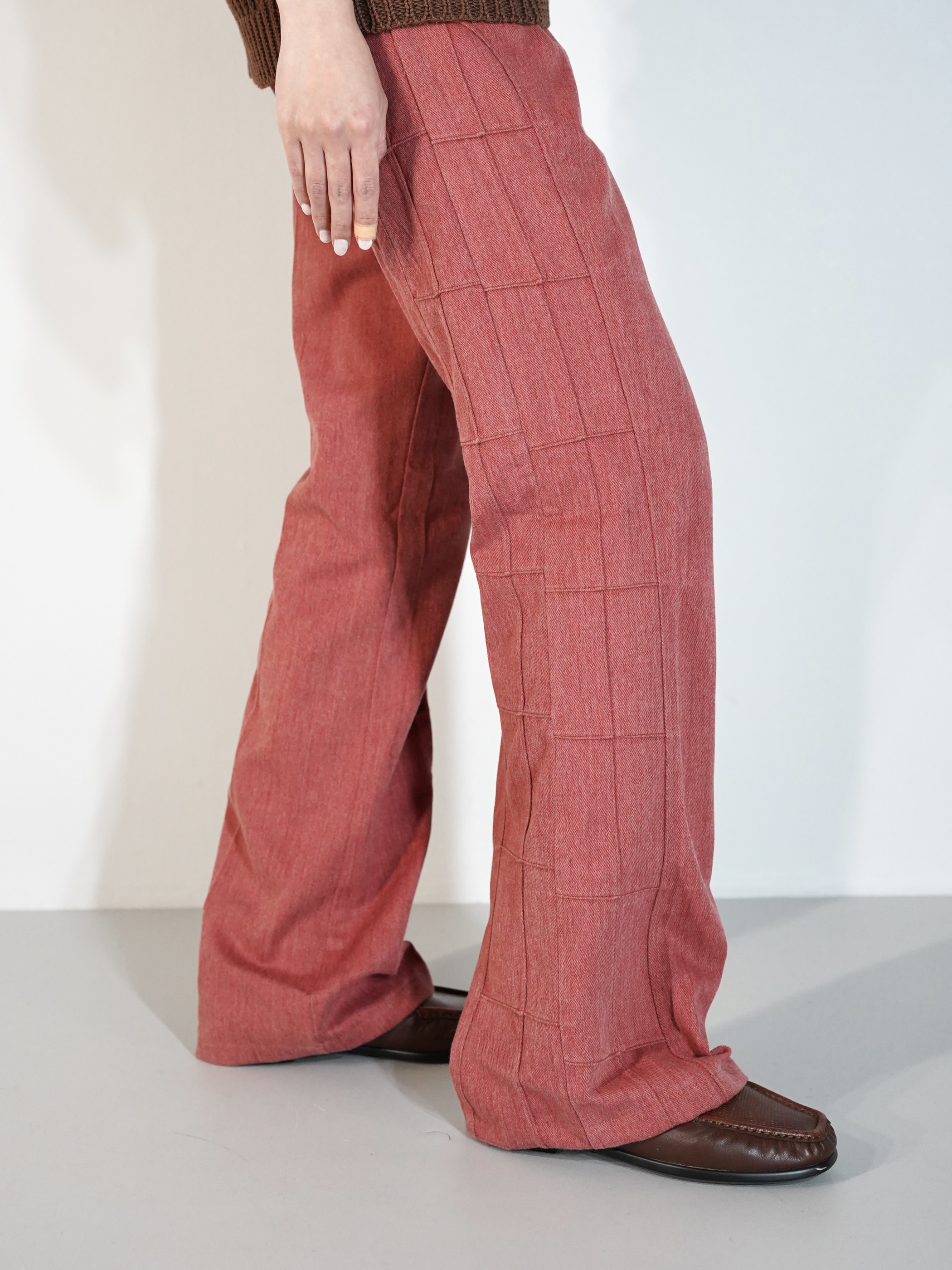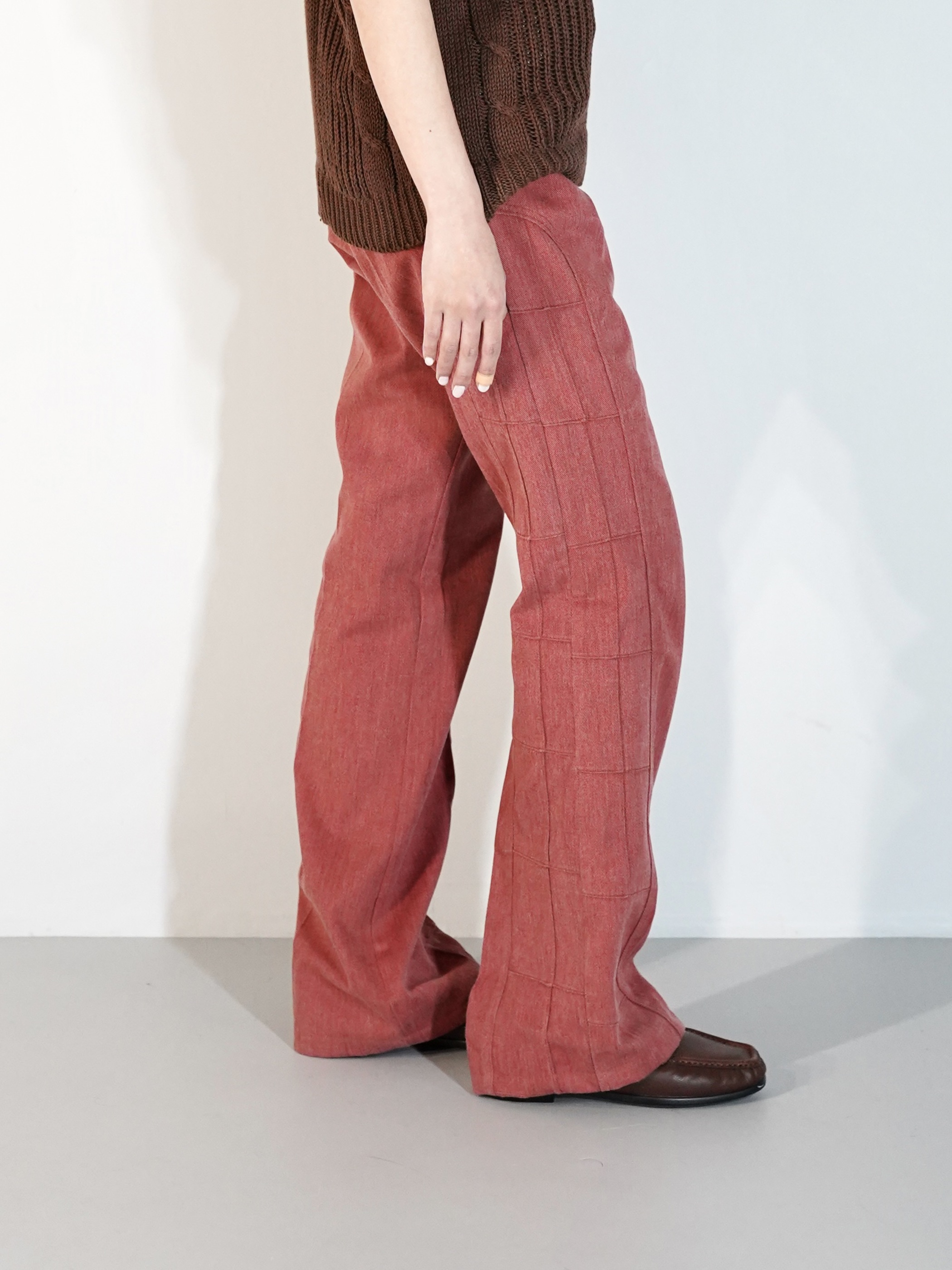 サイド部分に遊び心のあるデザインが施された、雰囲気があるフレアパンツ。