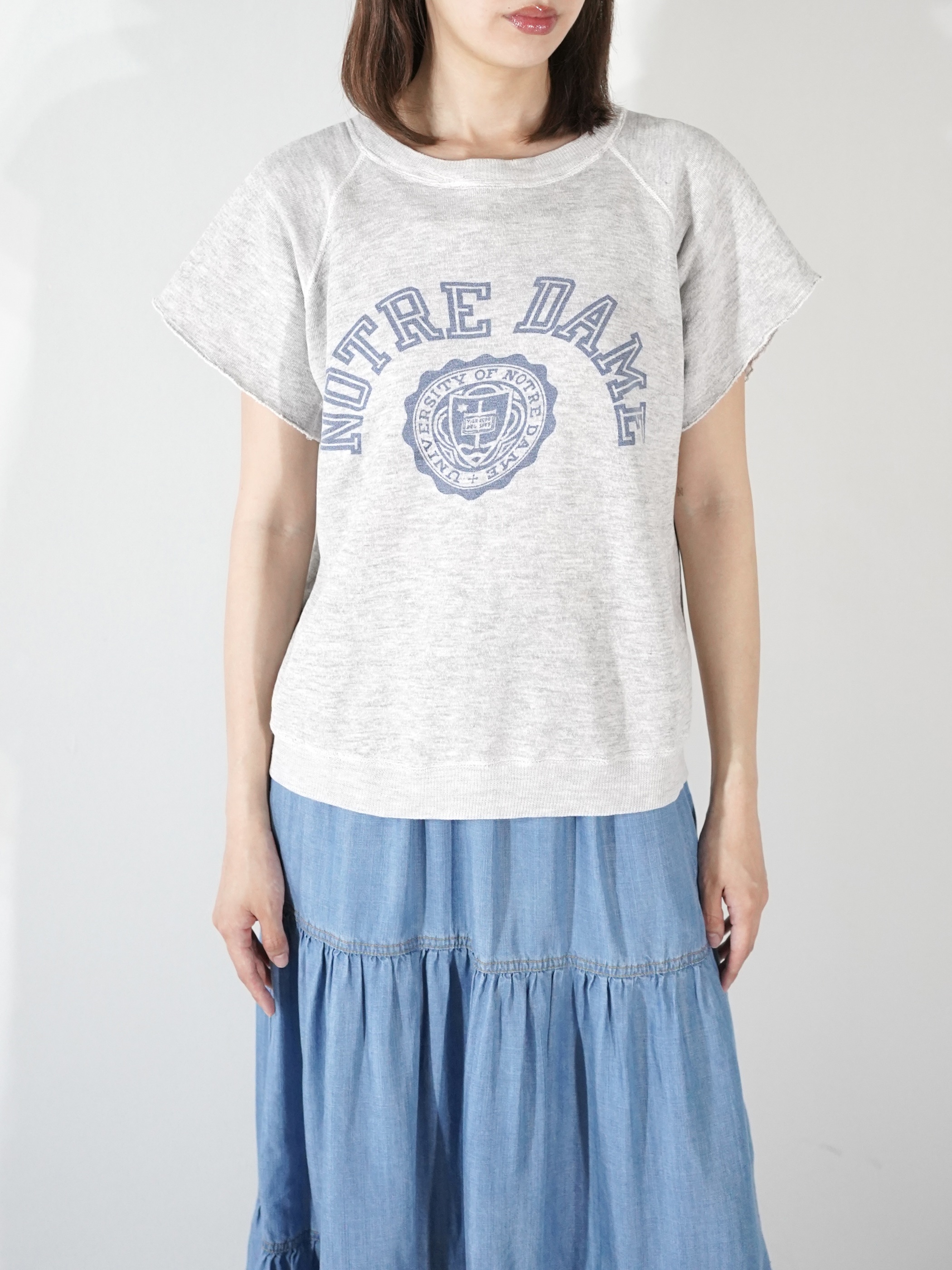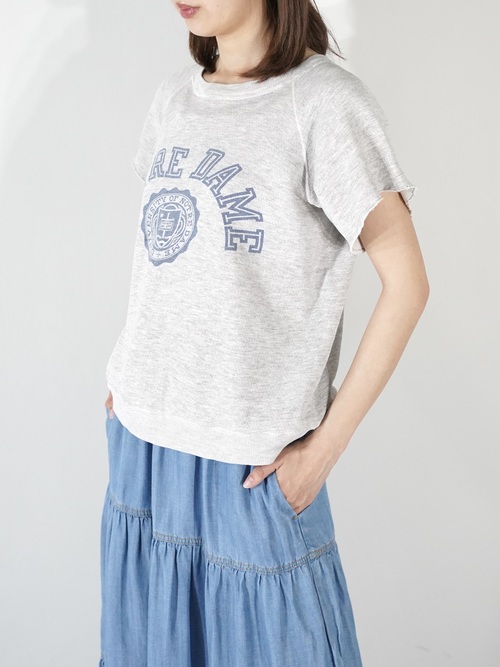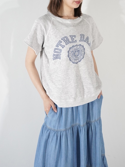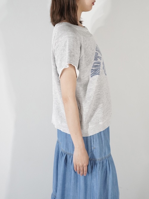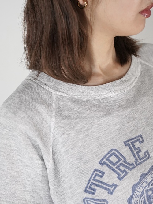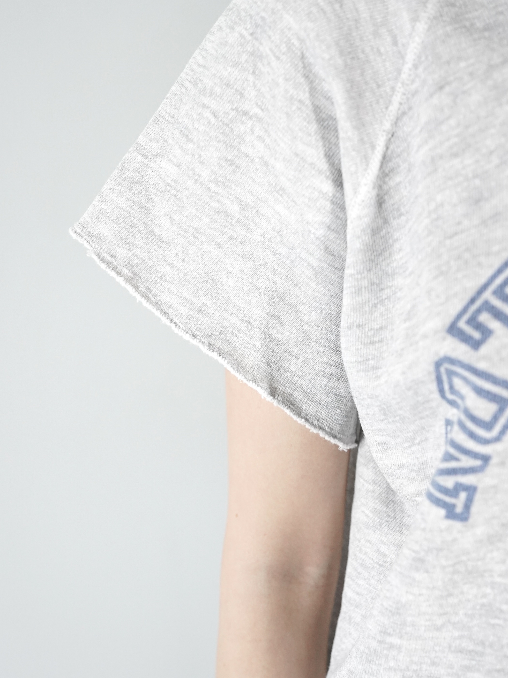杢グレーボディに馴染むような柔らかいカレッジプリント
