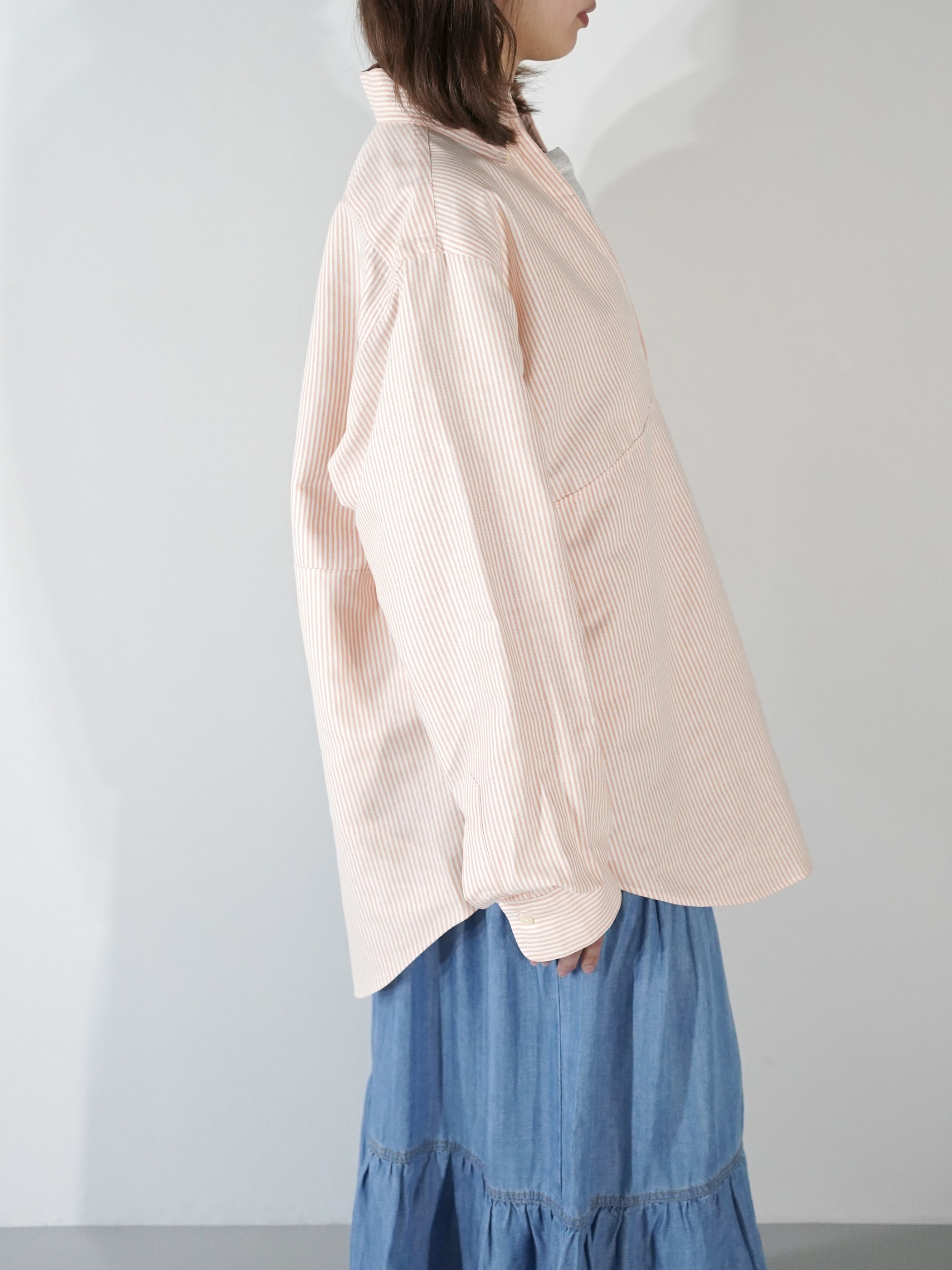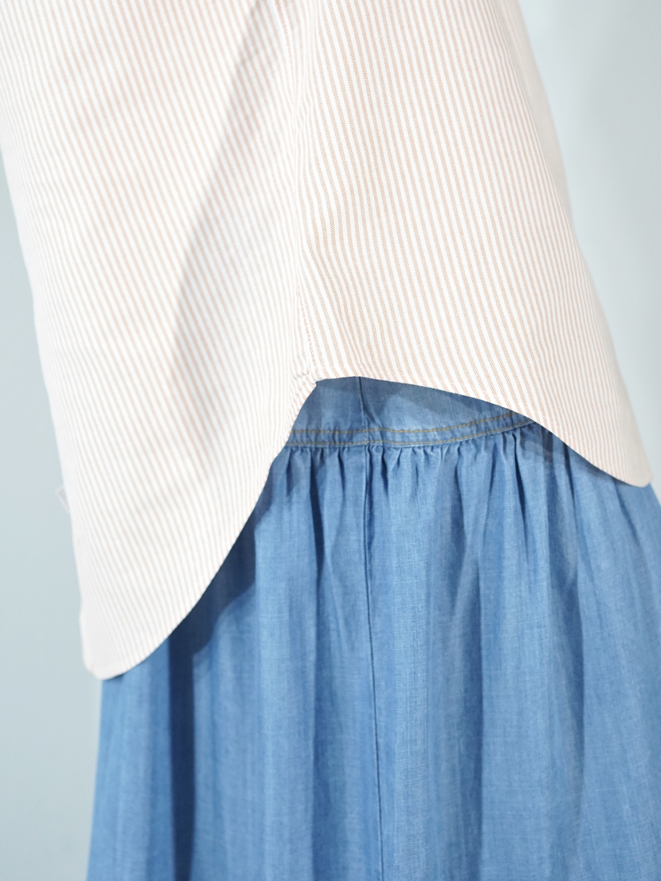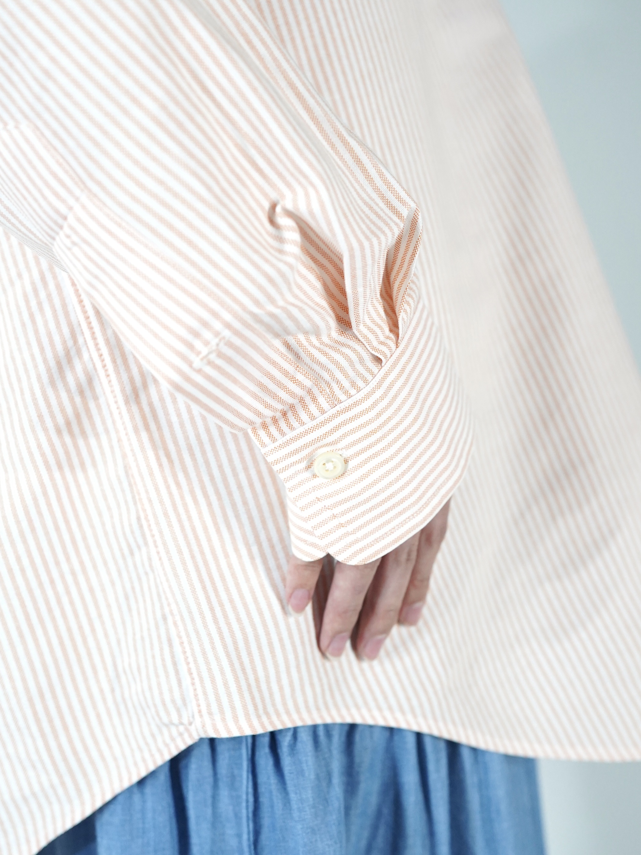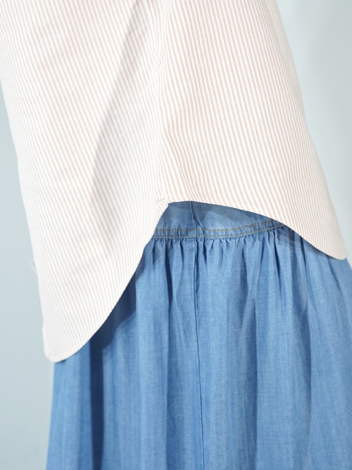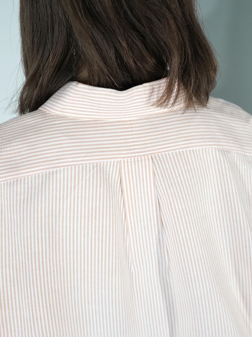 柔和なカラーリングのピンストライプなのも良く、インナーには大ぶりな柄物を合わせても良さそう