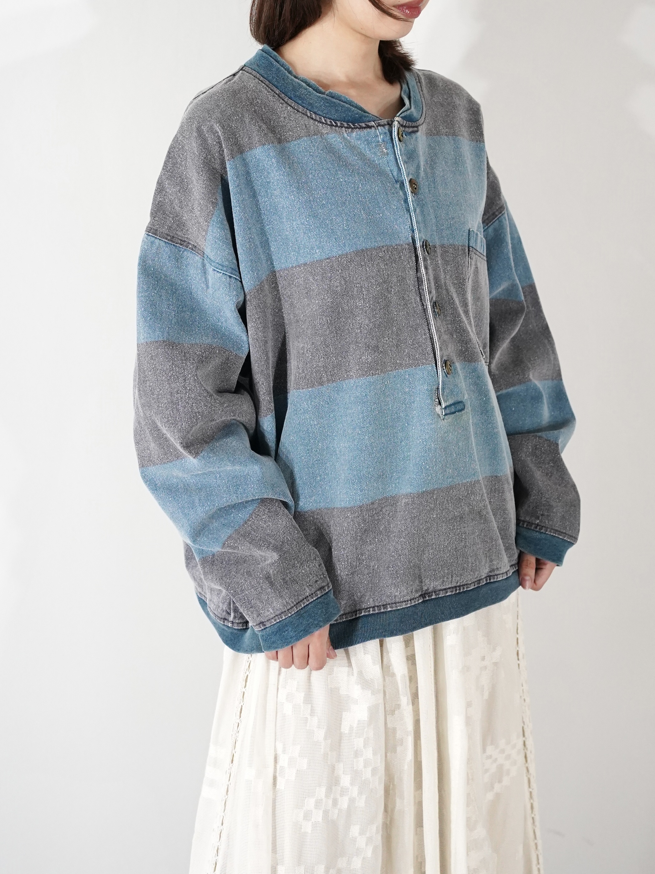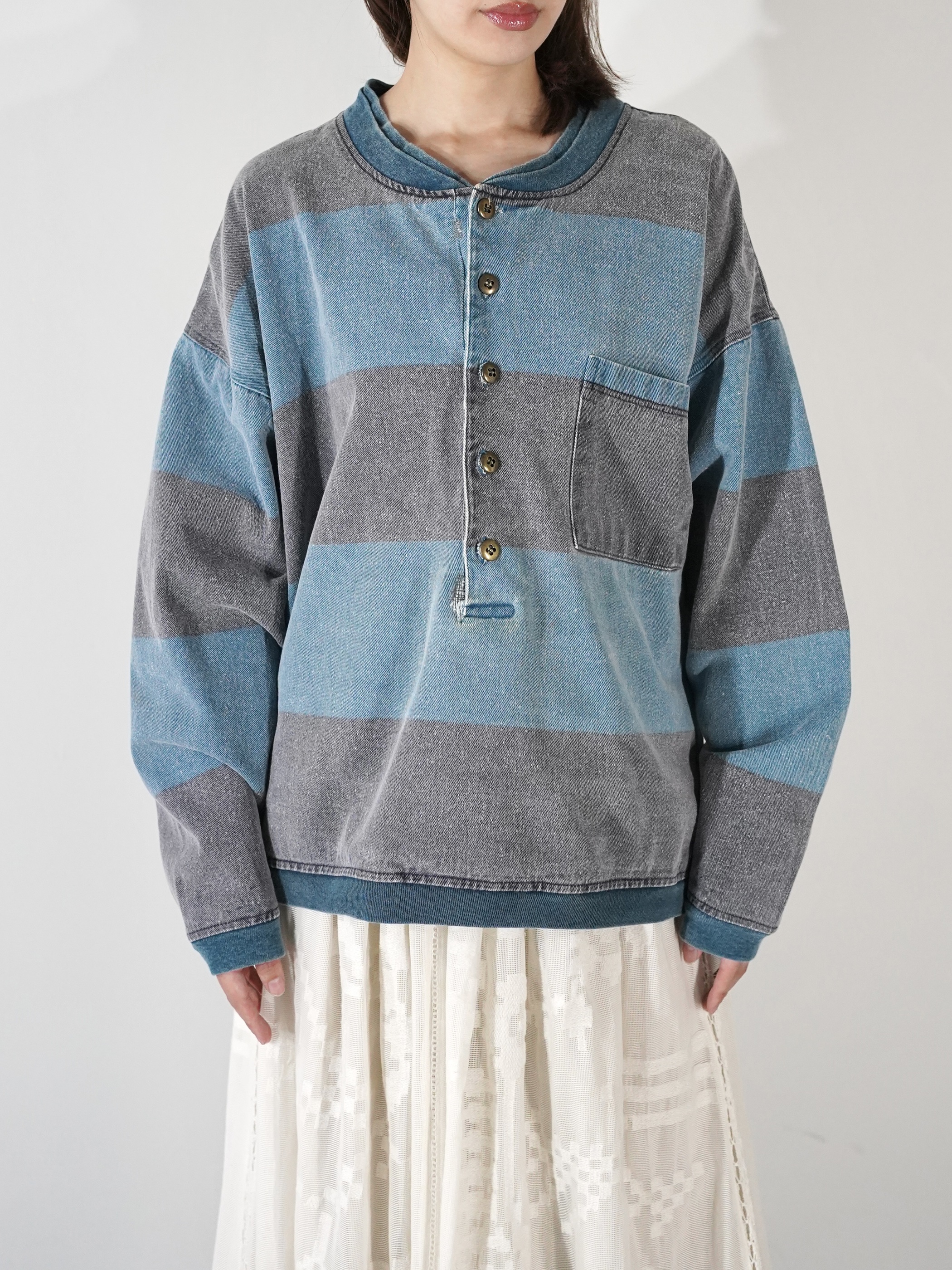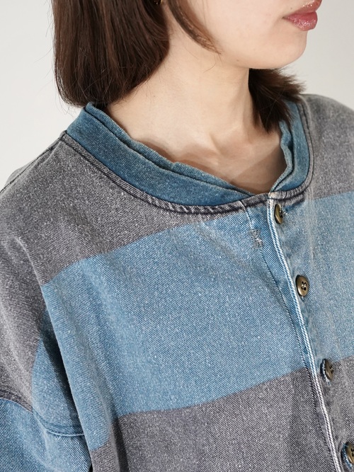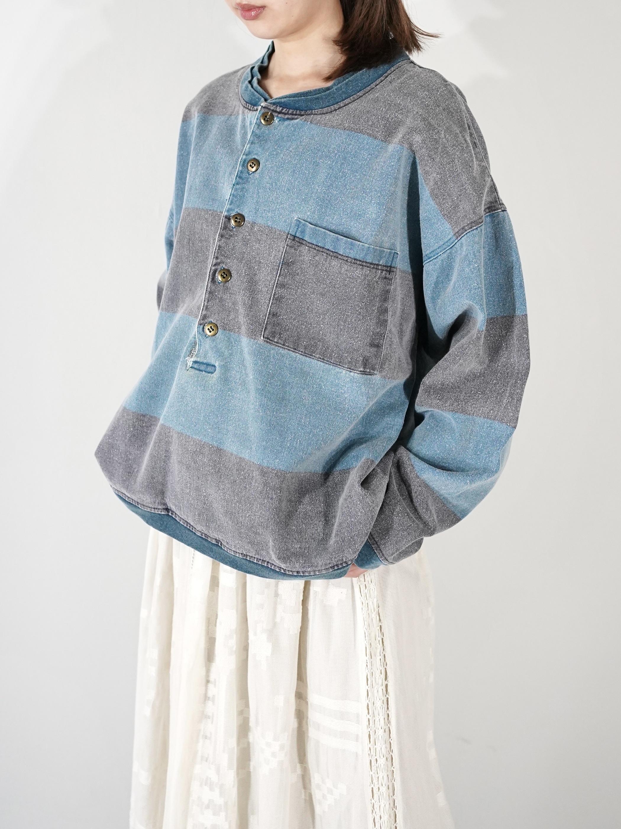 1990s 2tone Border Denim Henry Neck Tops