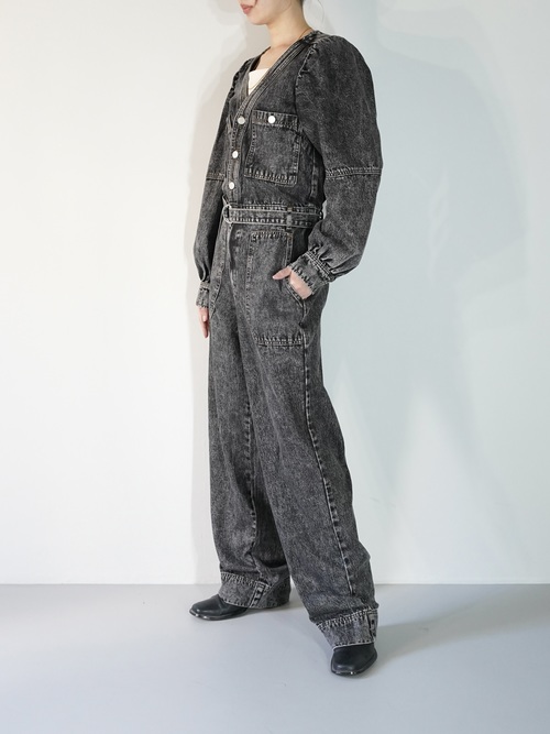 同系色のコットン切り替えが特徴的で袖や、フロントなど部分的なドットボタンもモダンな雰囲気