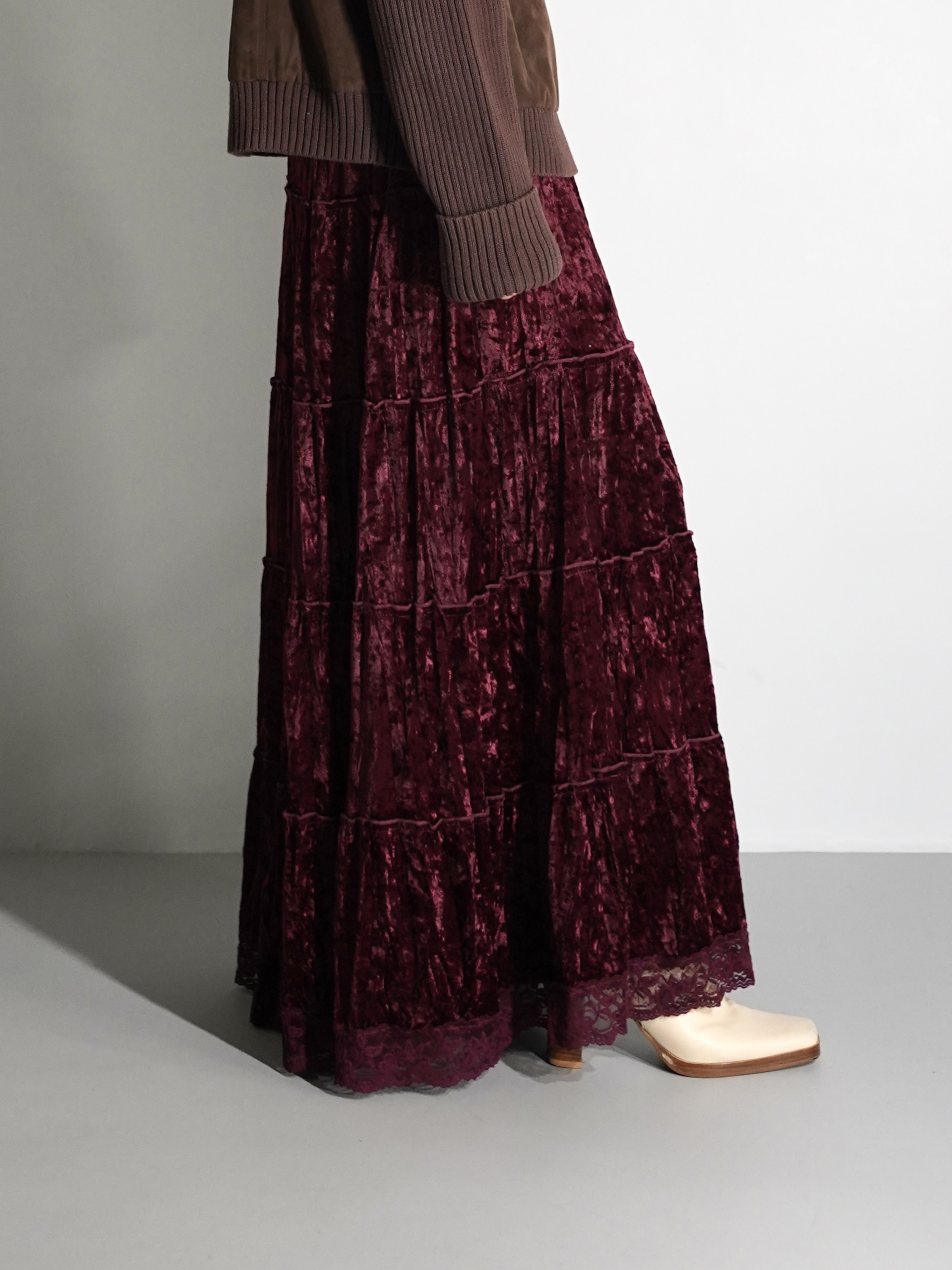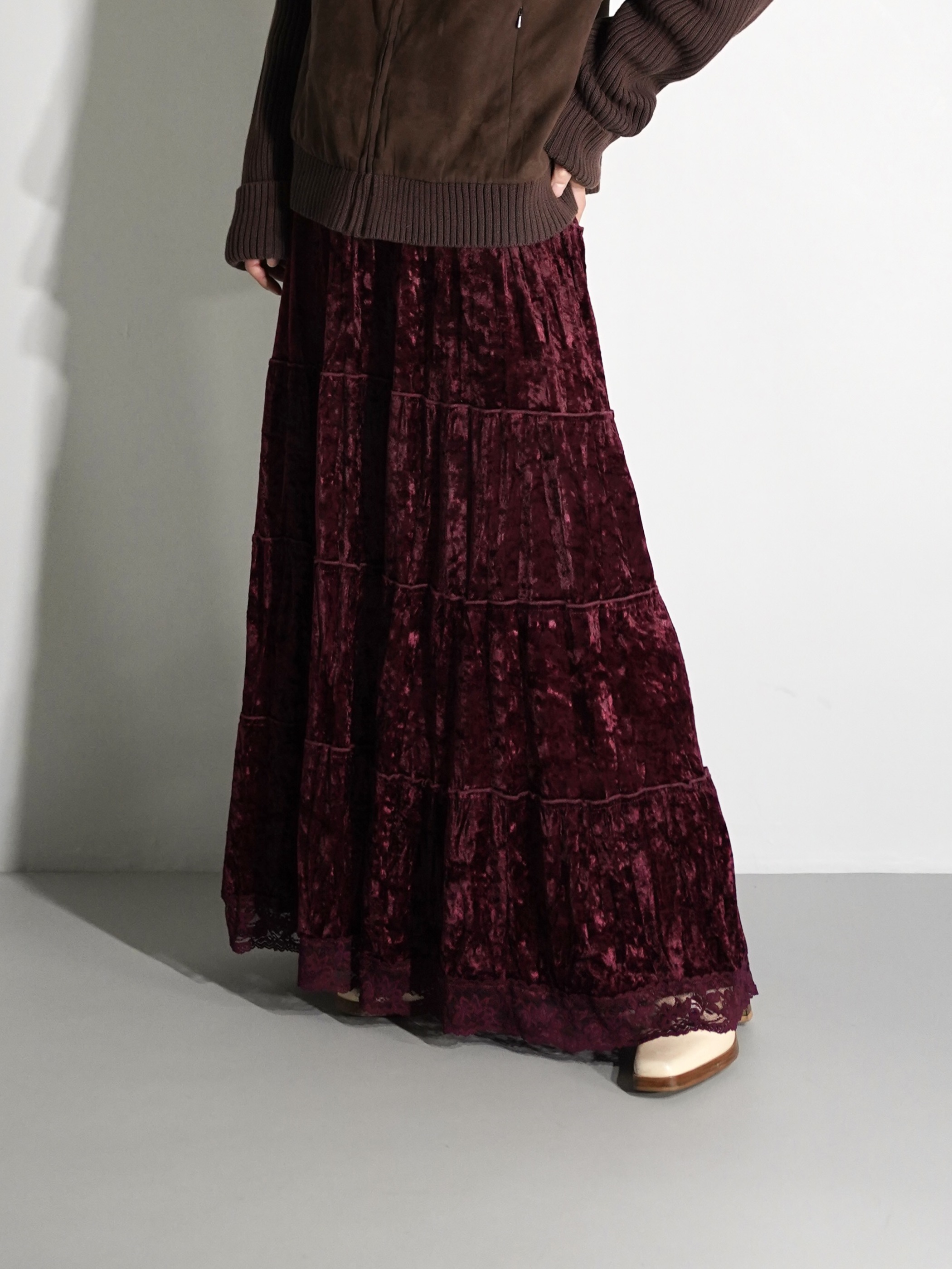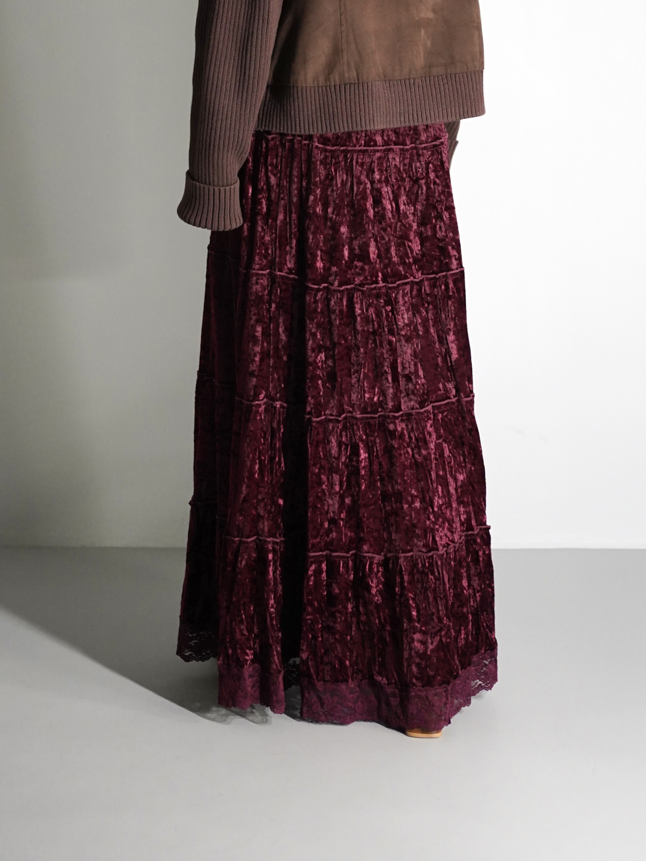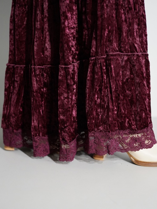 Lace Hem Crushed Velour Tiered Skirt