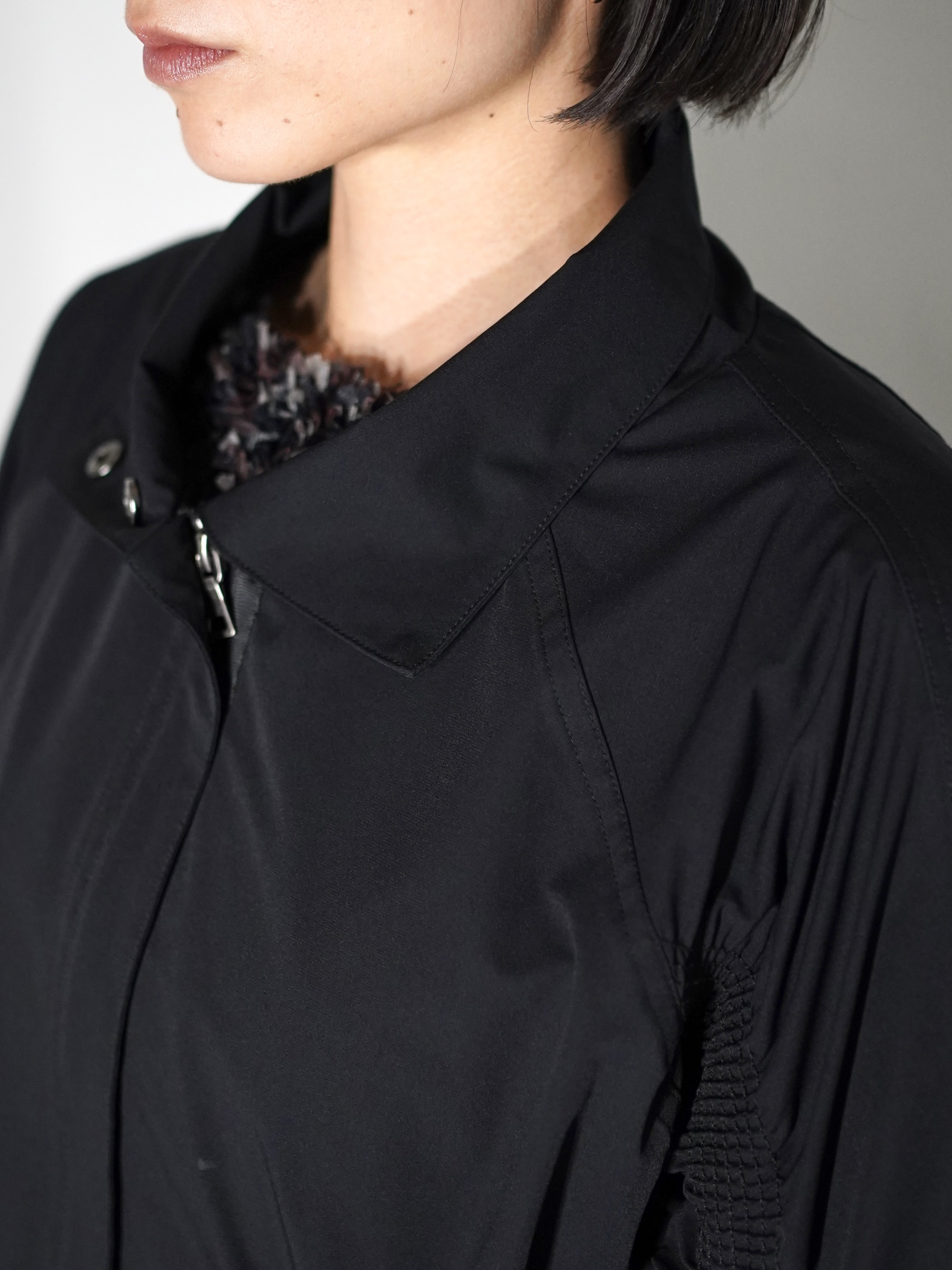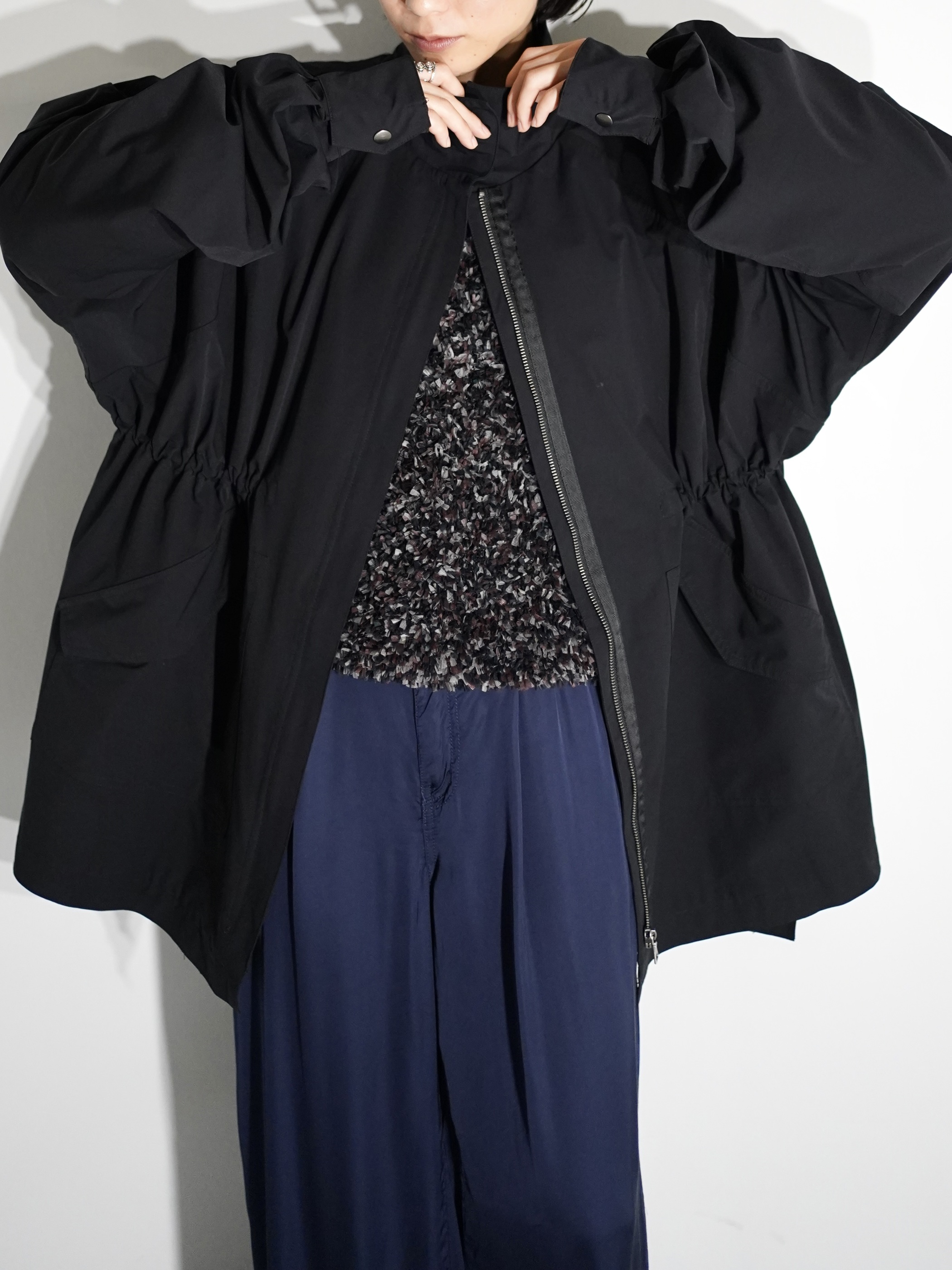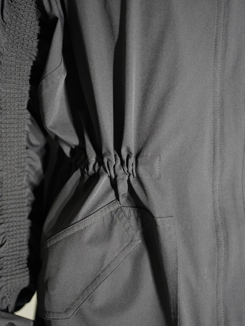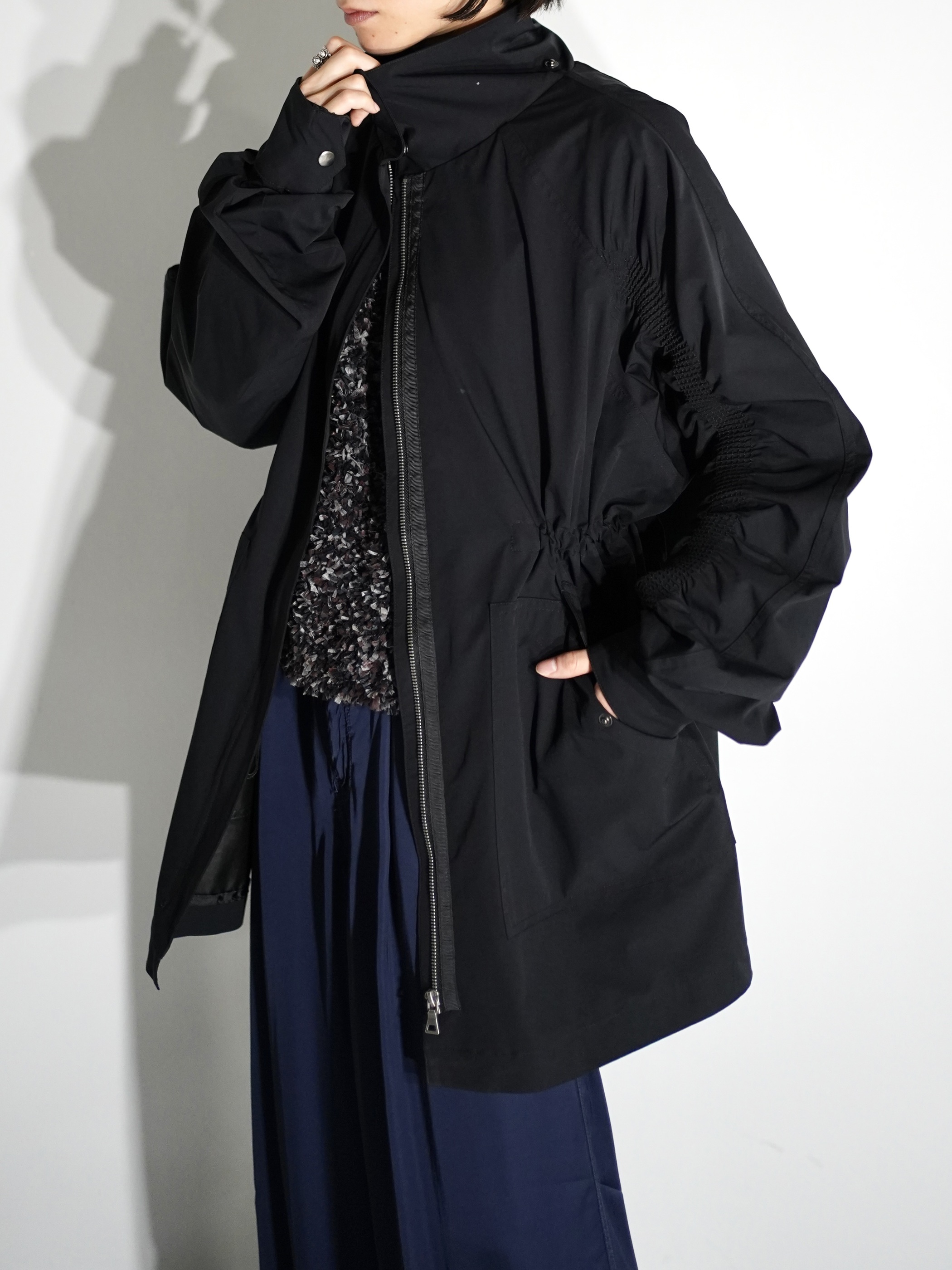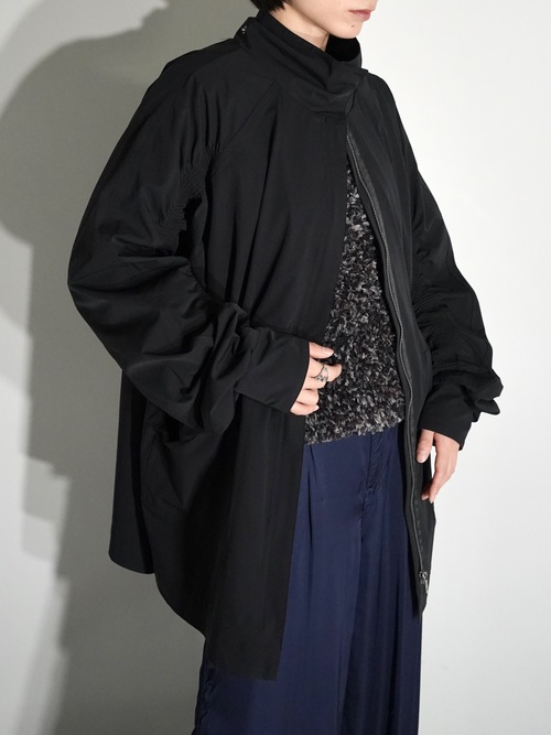 袖内側にシャーリング加工が施され、細かなギャザーのデザインが効いたハーフコート