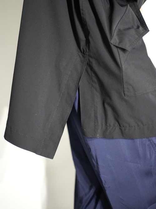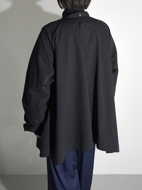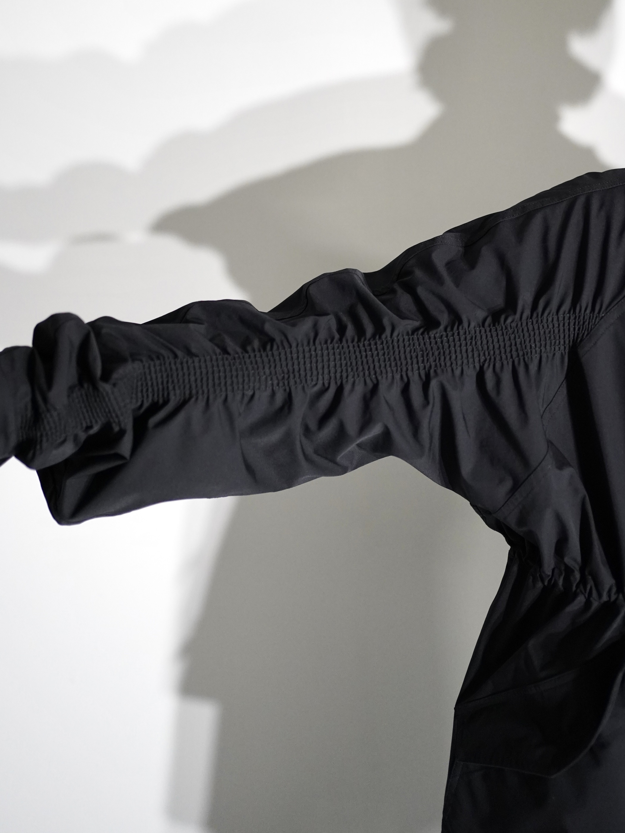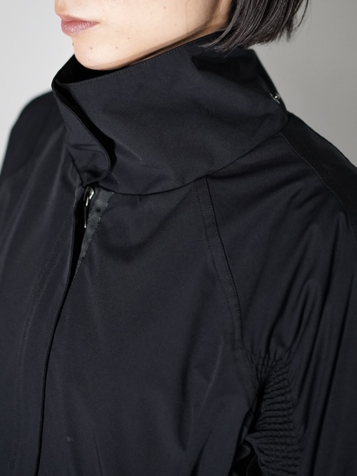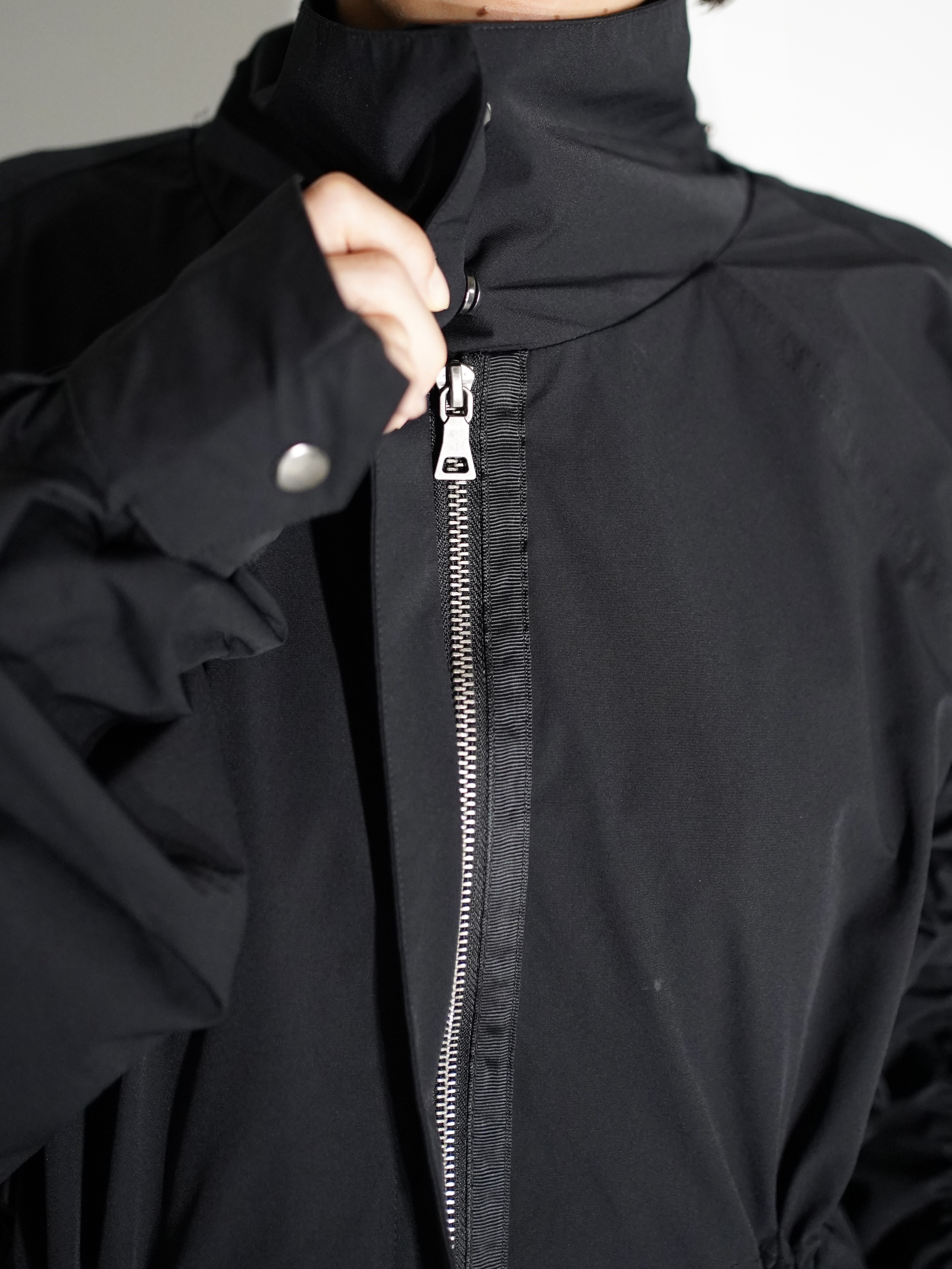 袖内側にシャーリング加工が施され、細かなギャザーのデザインが効いたハーフコート