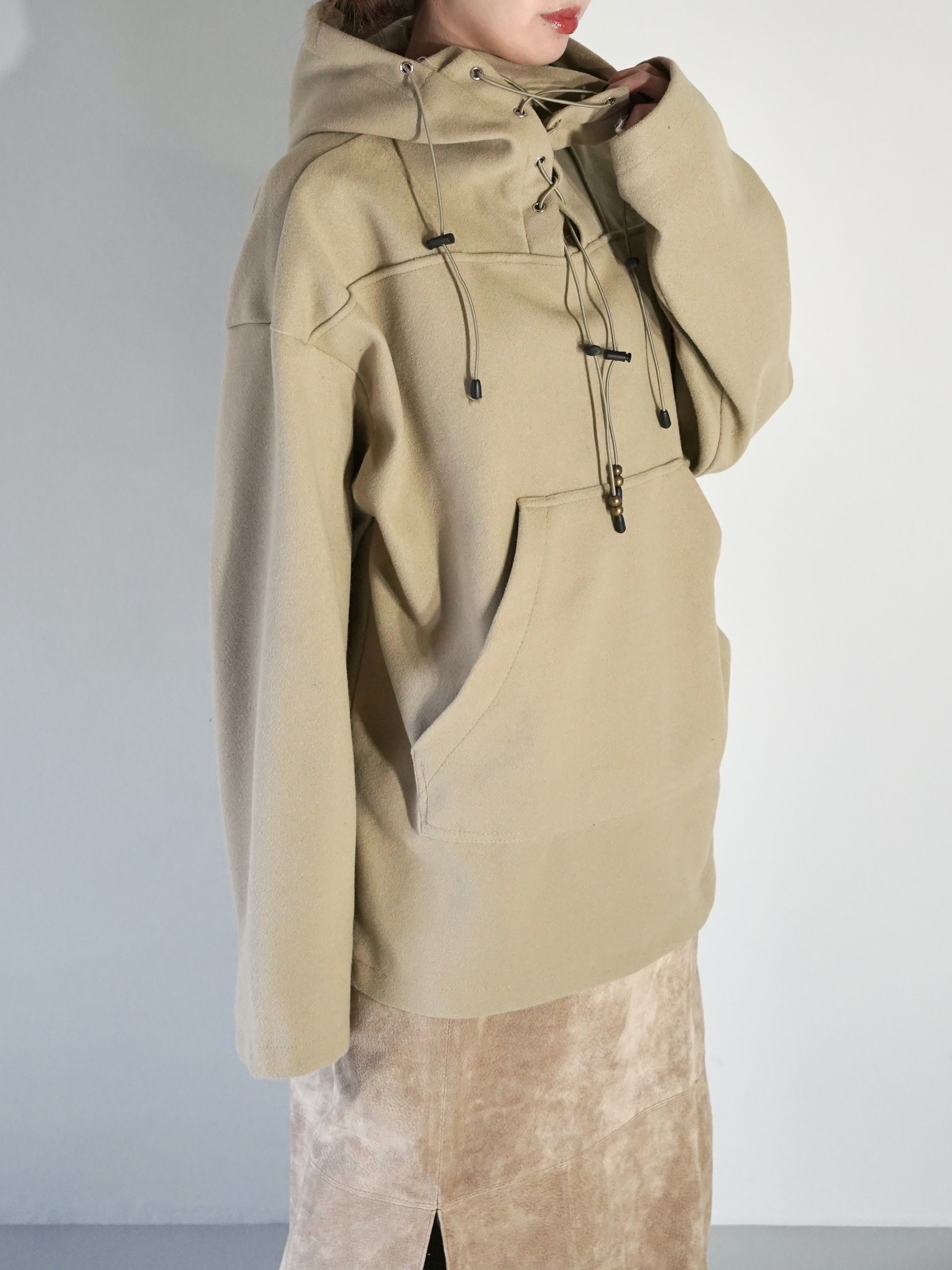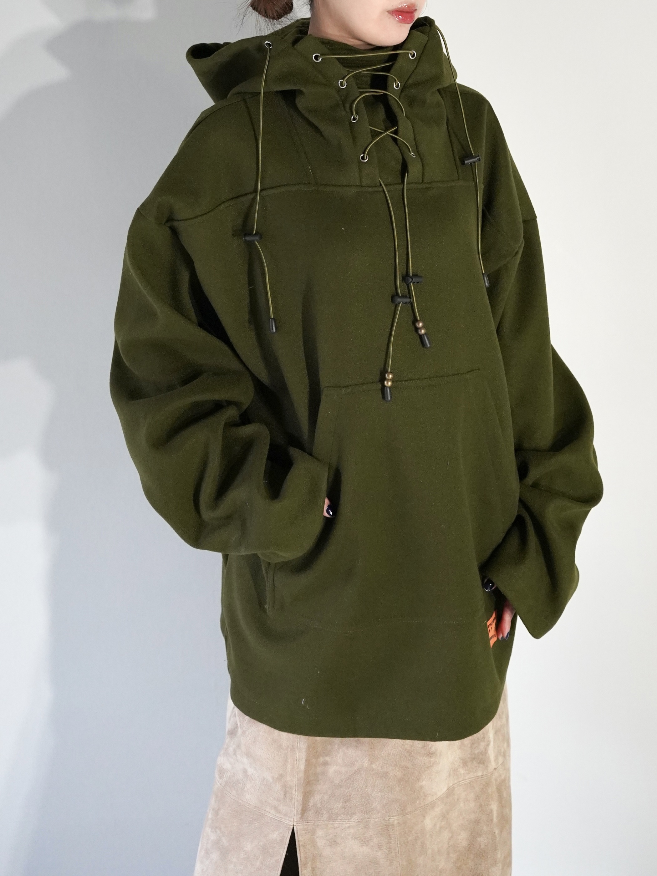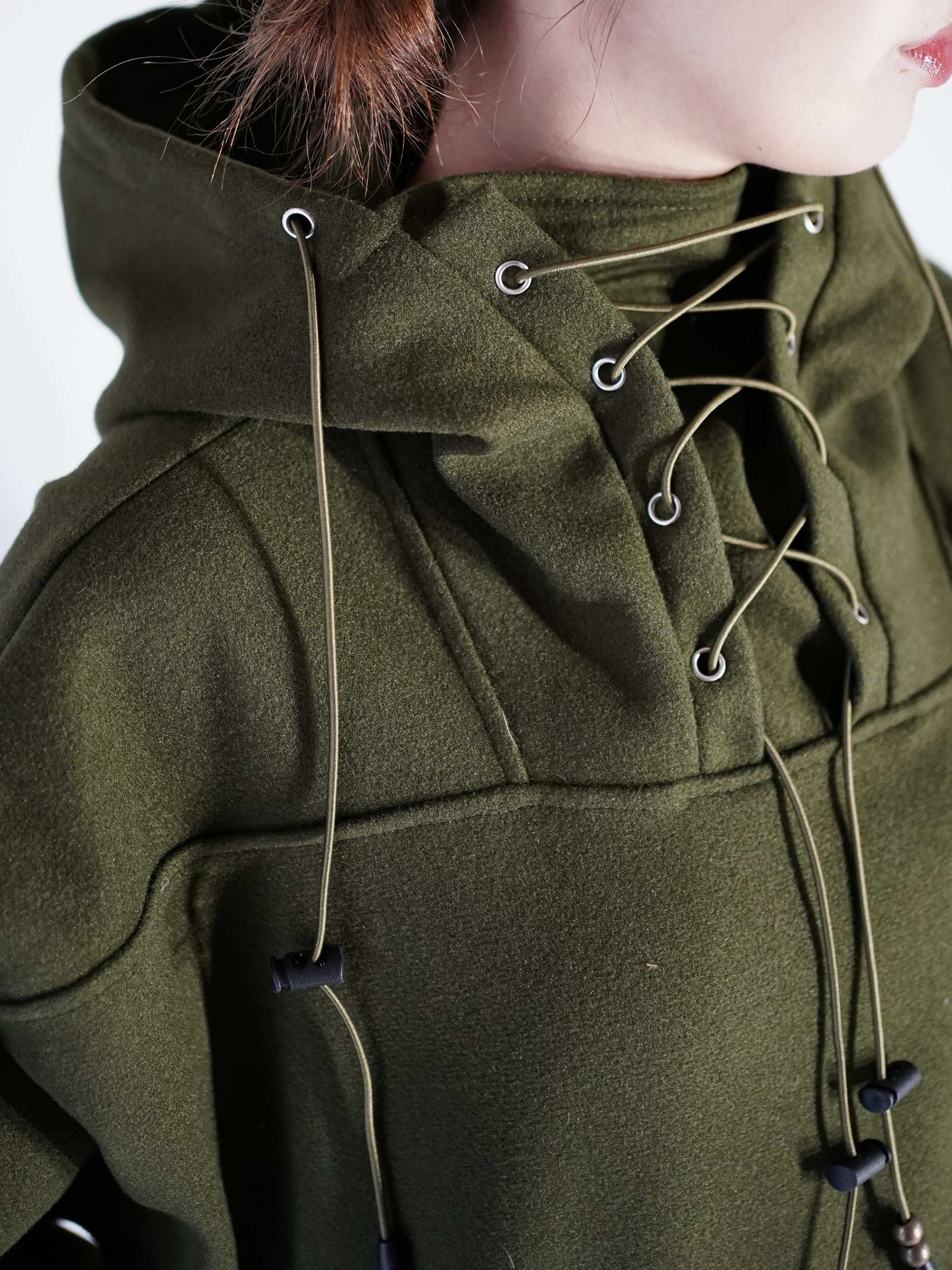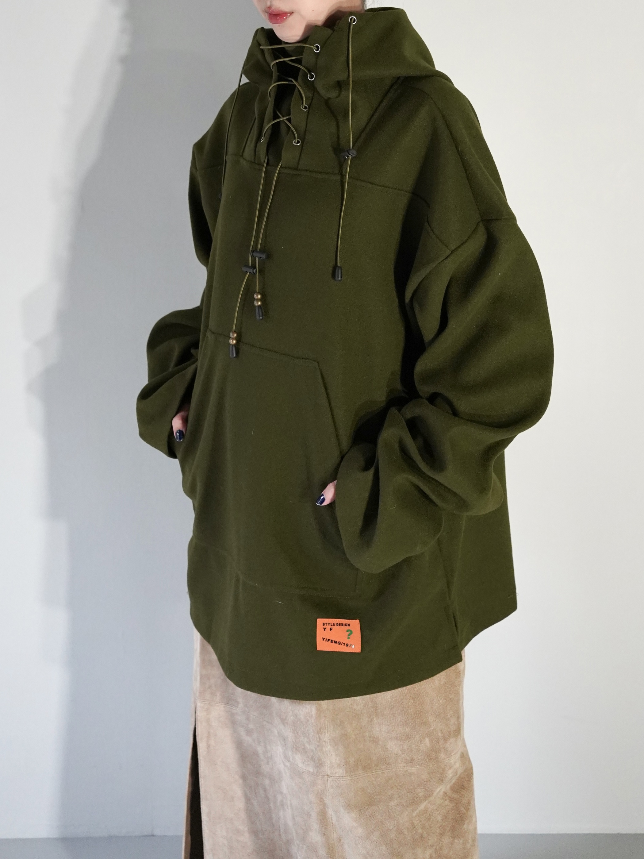 ハイネック仕様のレースアップが目を引くフーディートップス