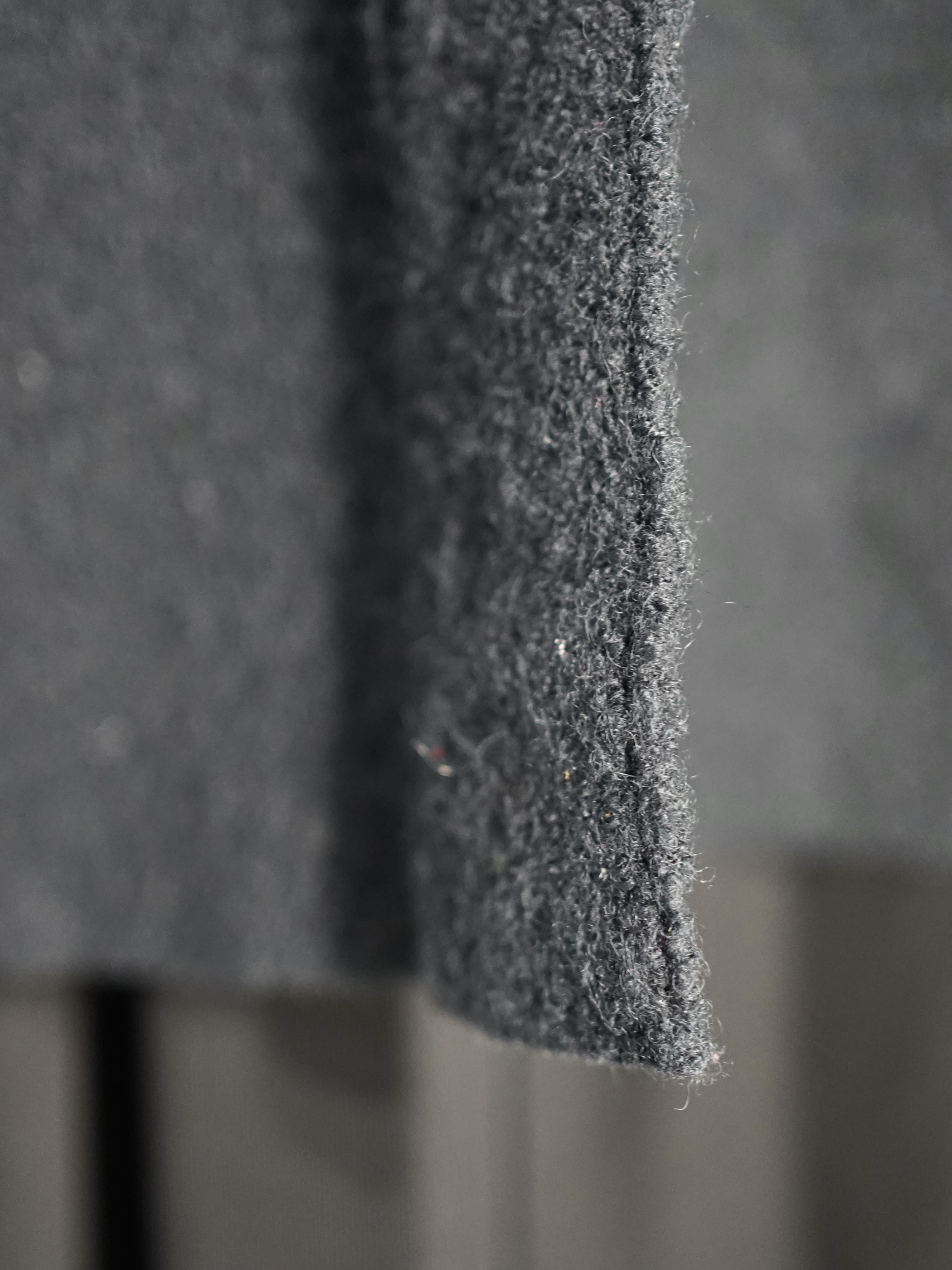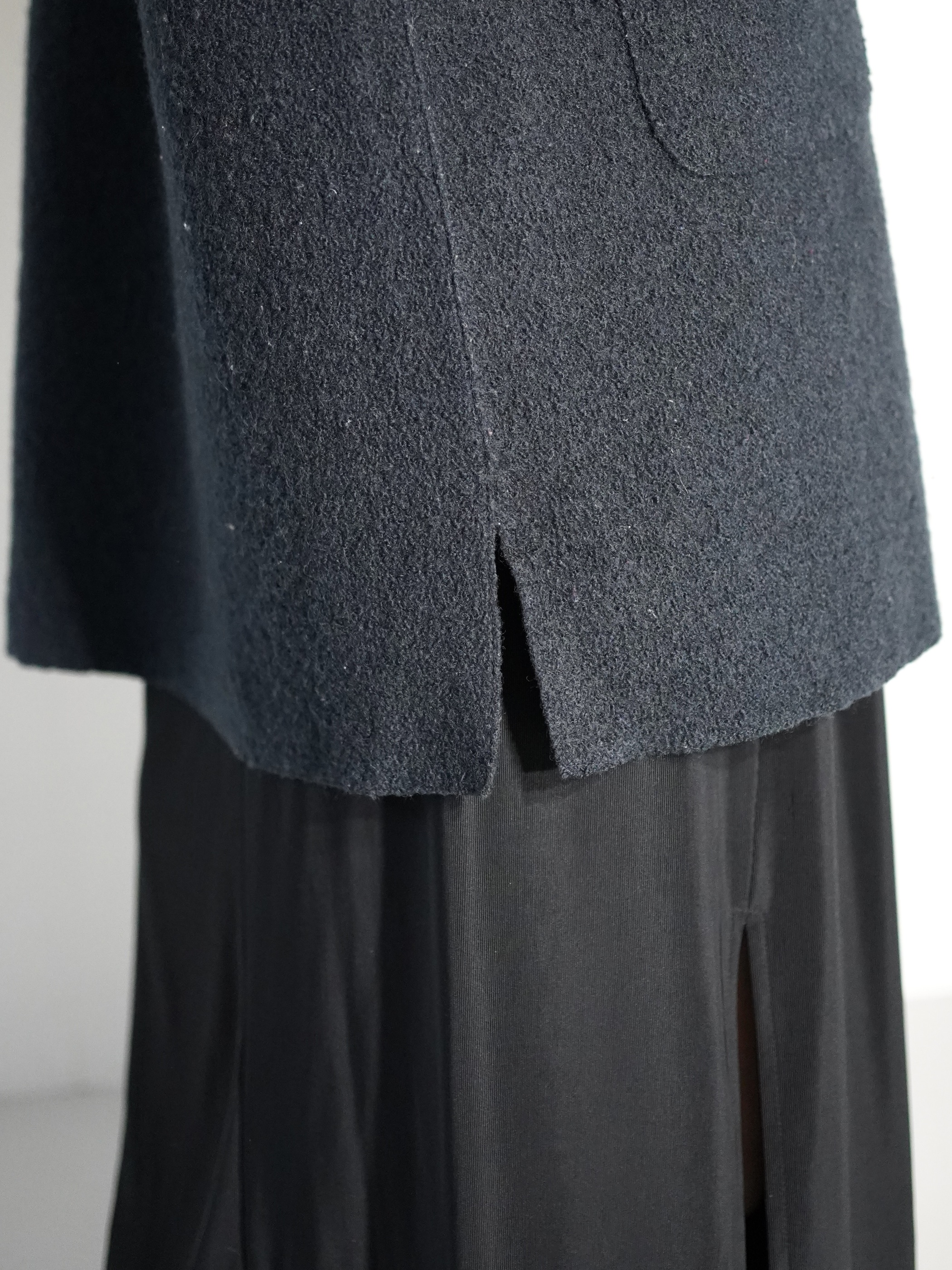 スナップボタン仕様、裏地無し仕立て。チェスターコートよりは軽さ・ラフさを重んじた印象