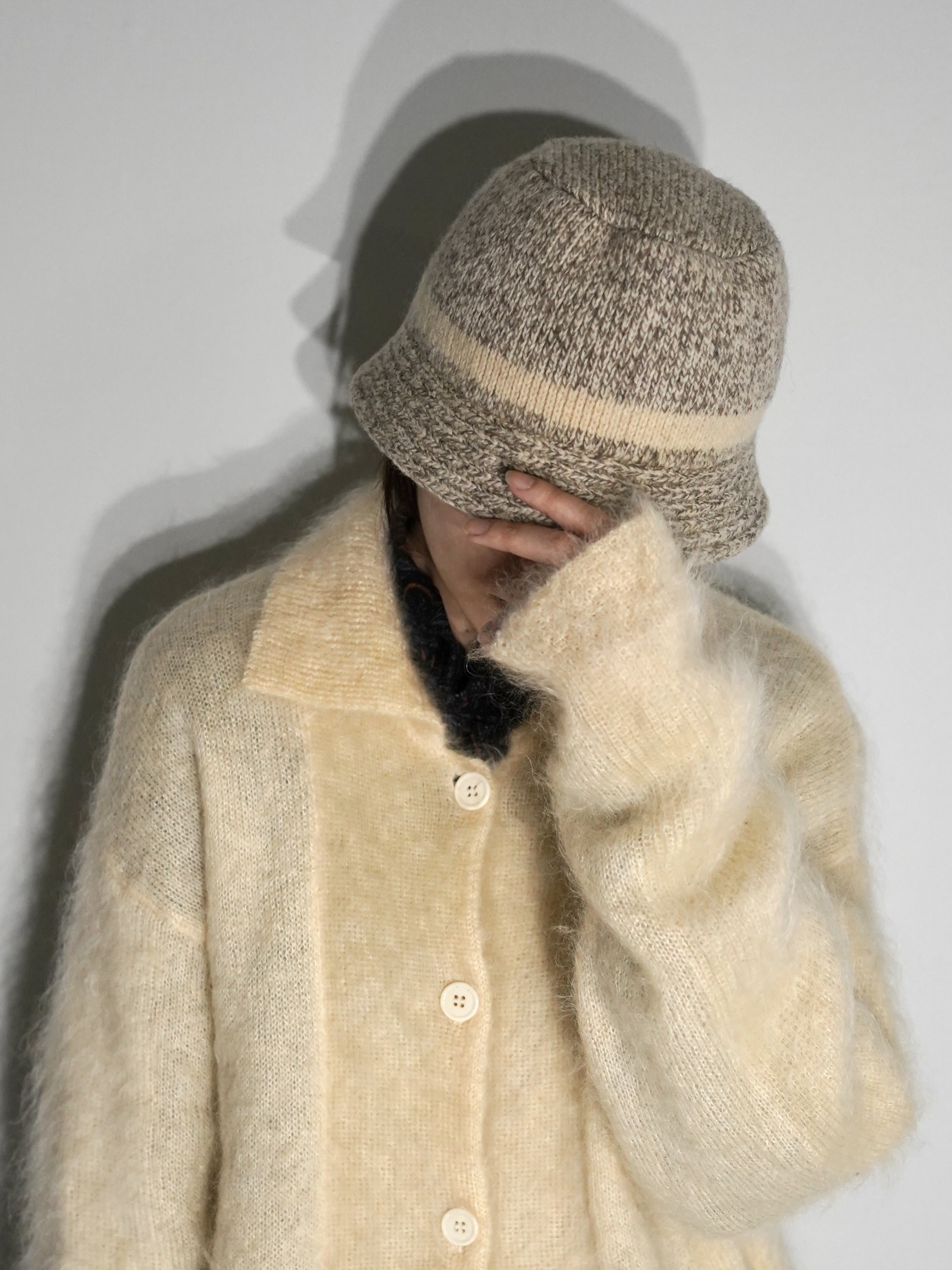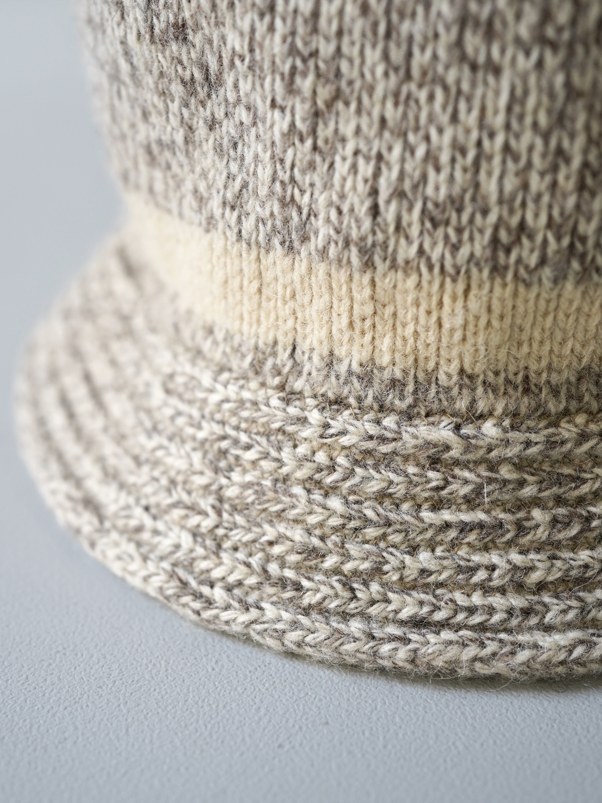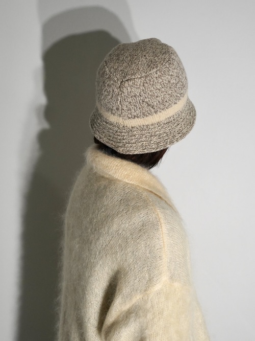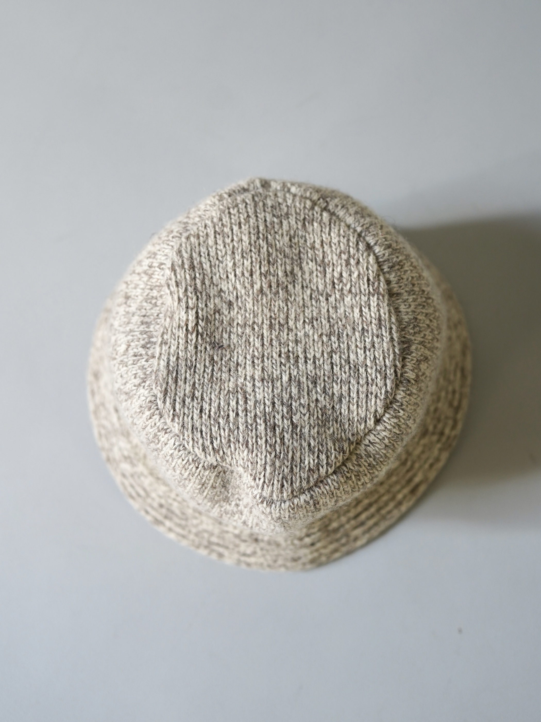 ベージュ〜ブラウンの色でできたメランジ織りのバケットハット。
