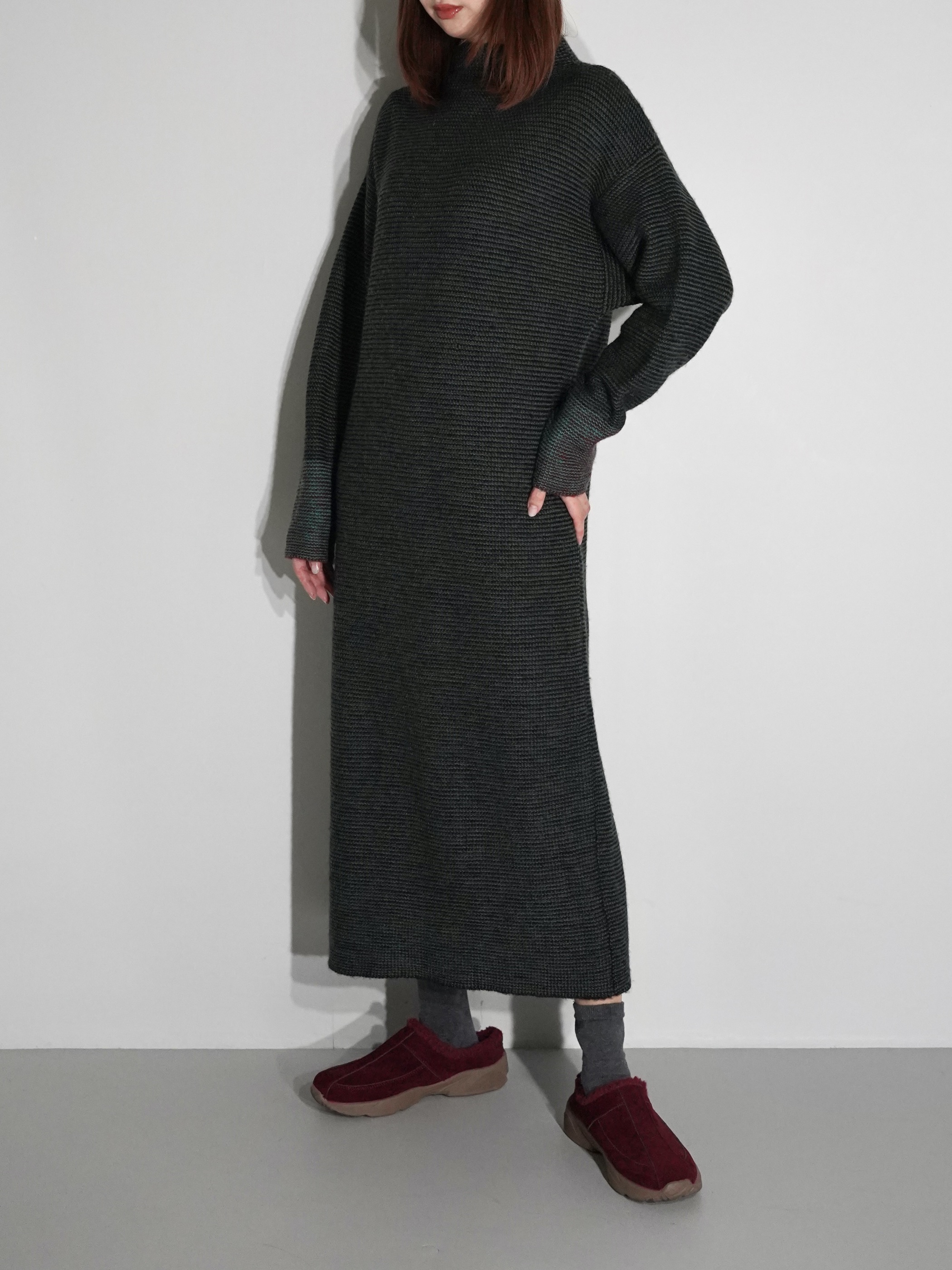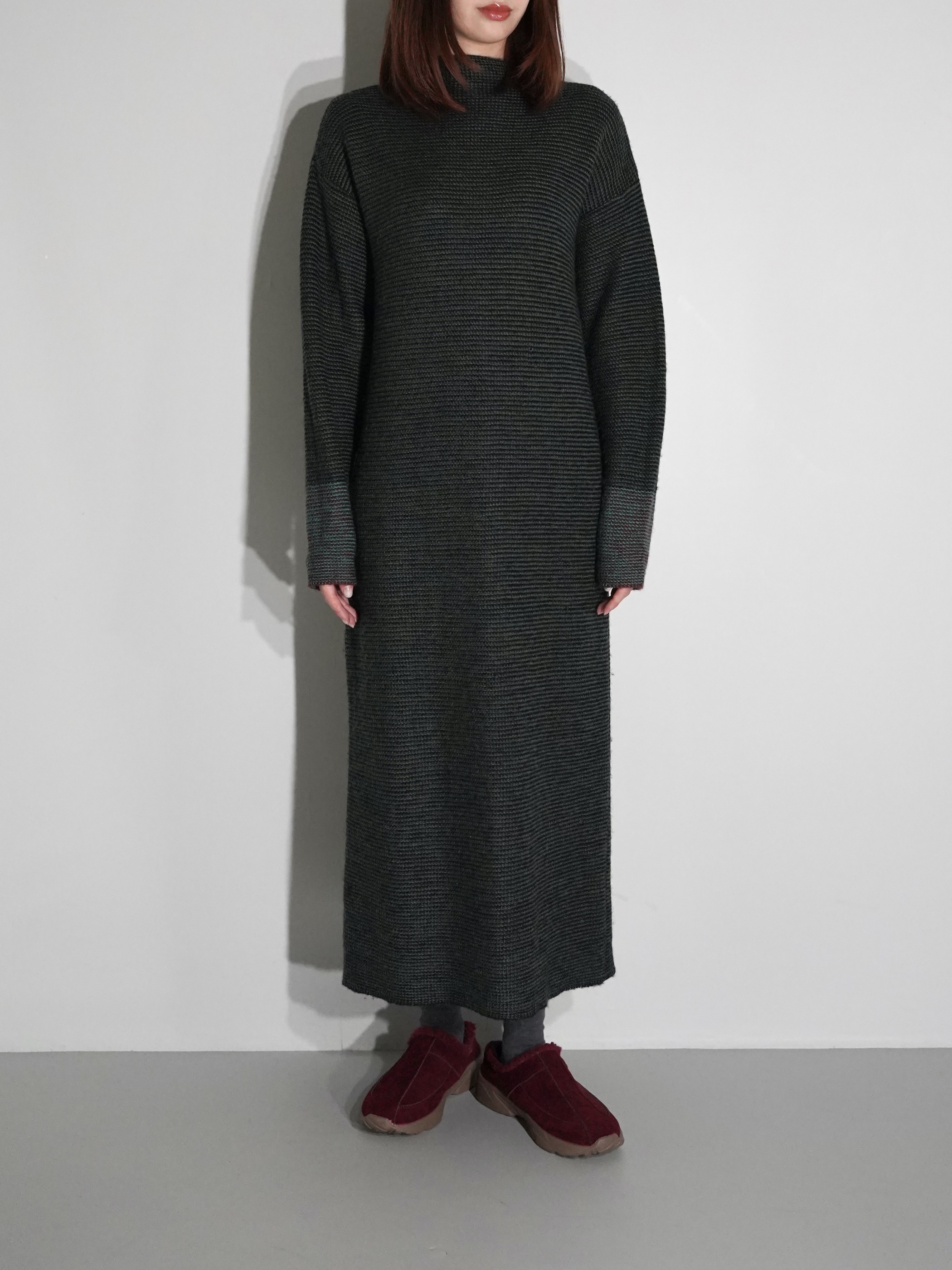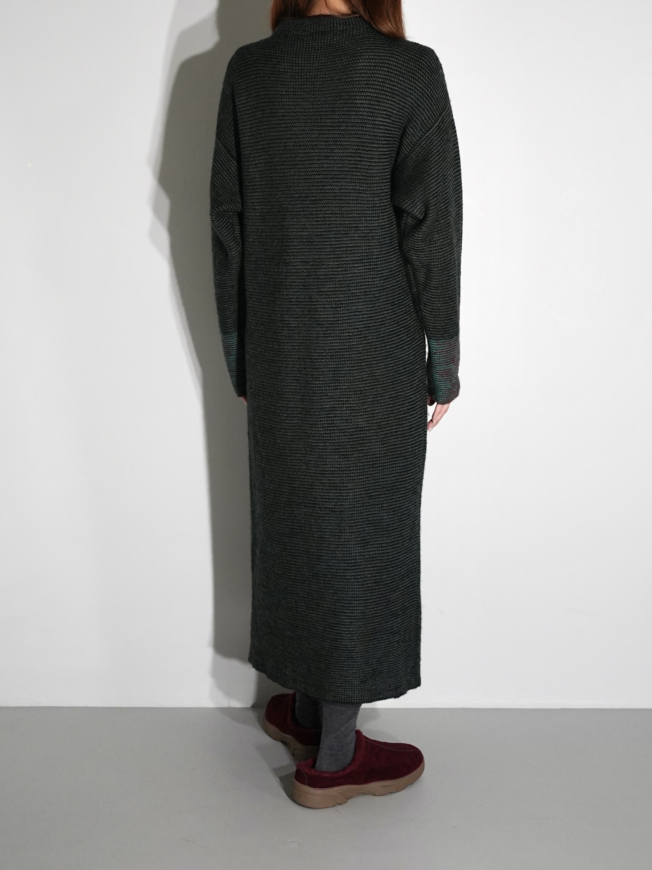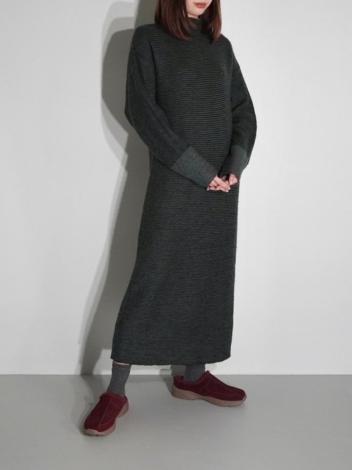 黒と深いグリーンにて2色の糸でボーダー状にて編み込まれたニットワンピース