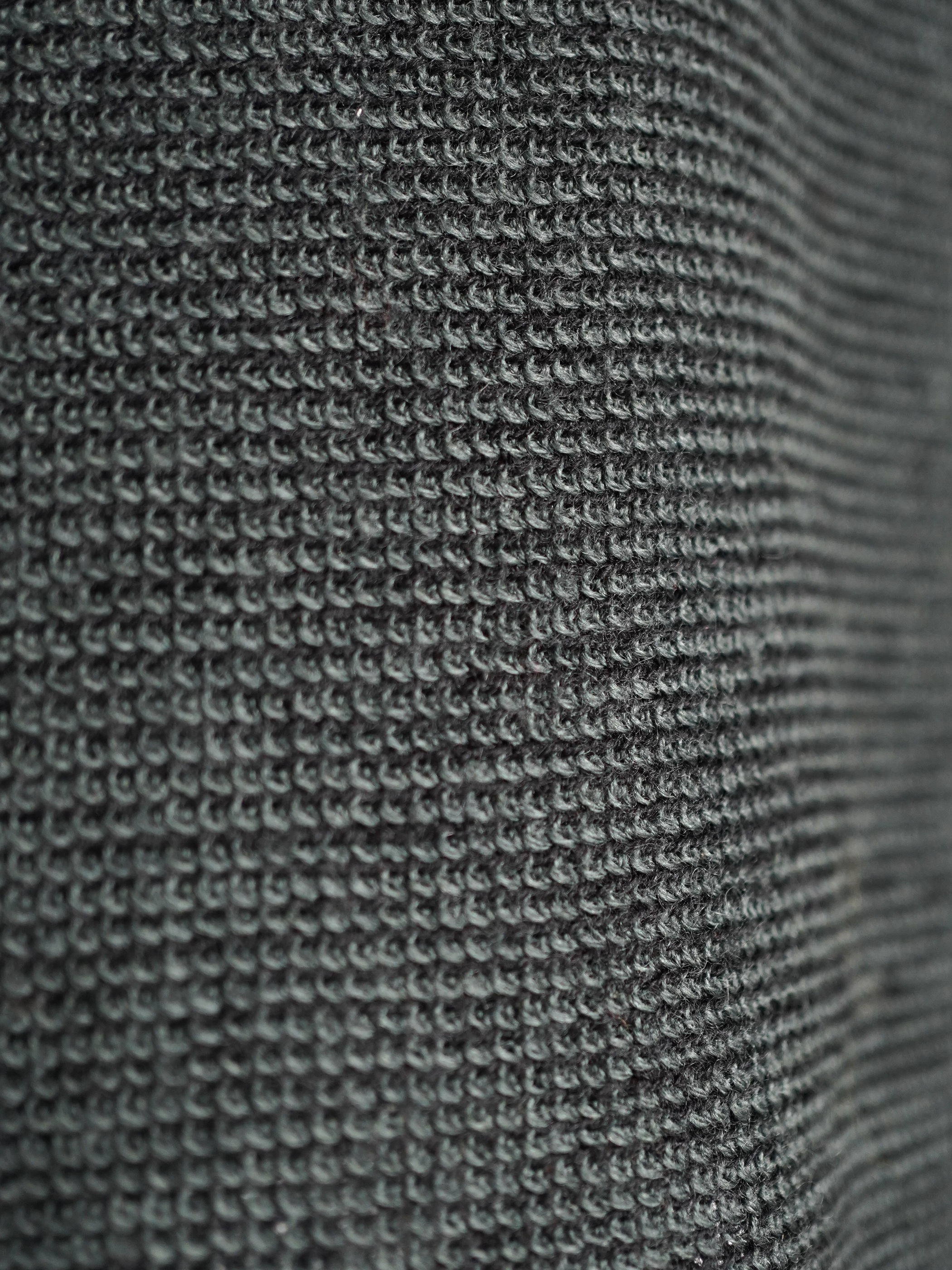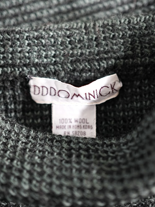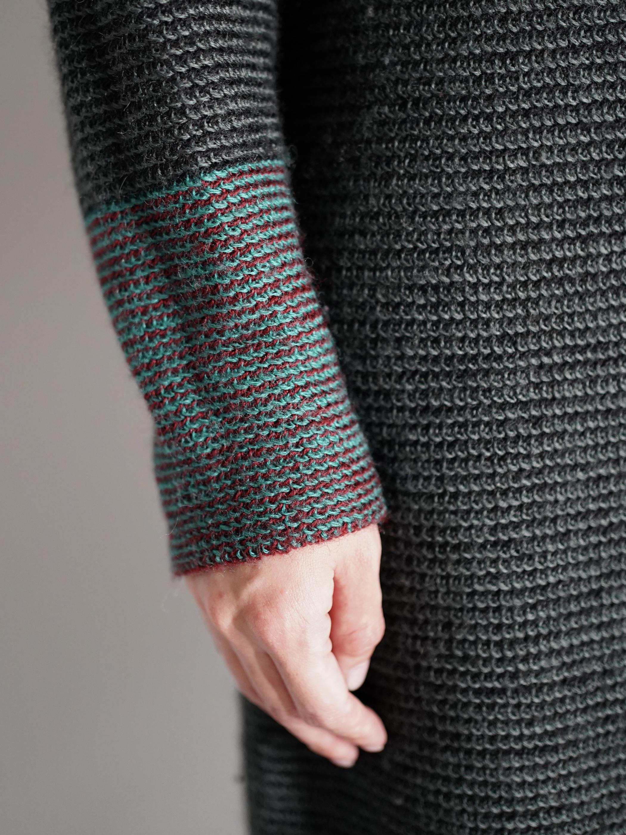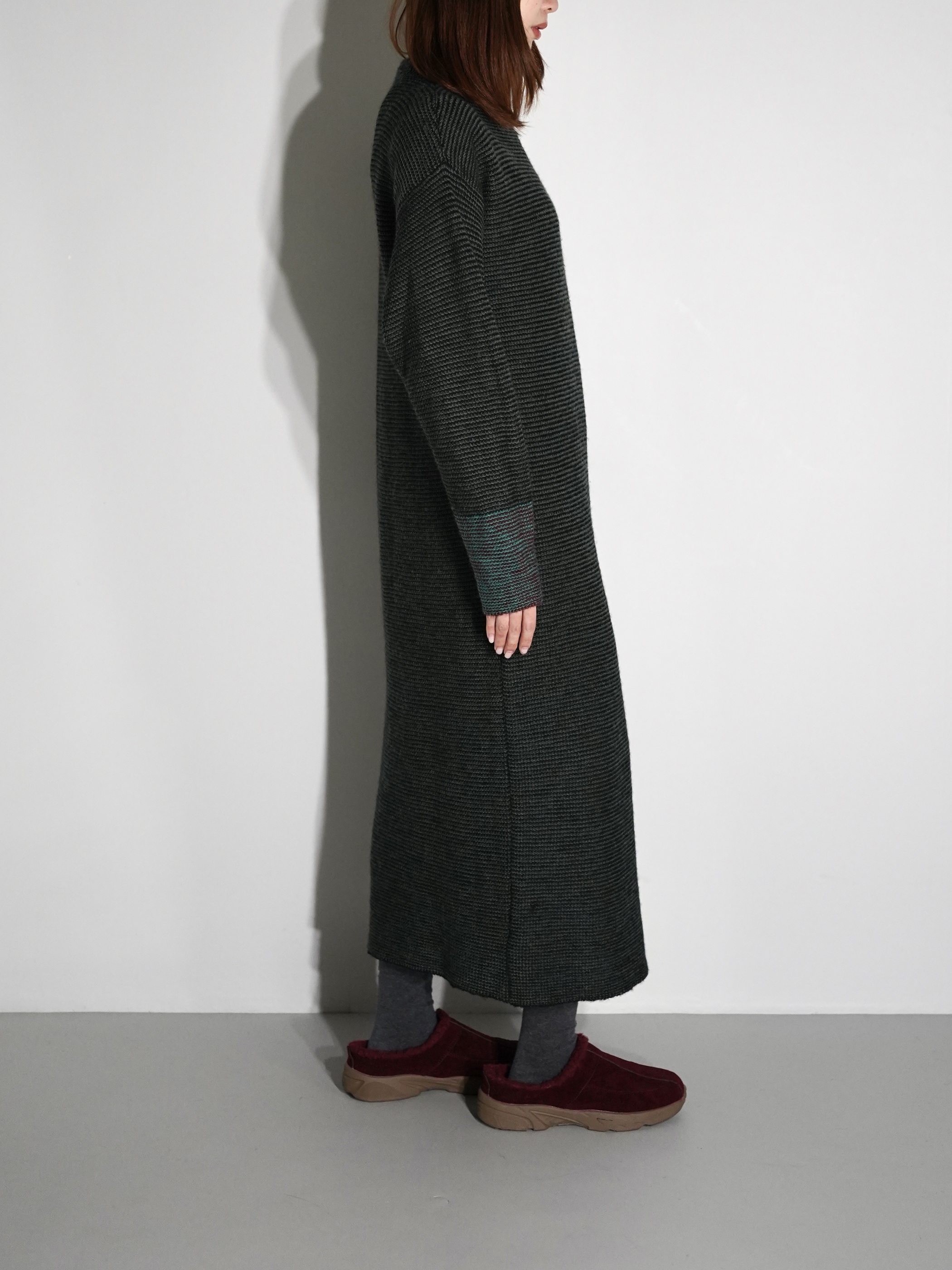 黒と深いグリーンにて2色の糸でボーダー状にて編み込まれたニットワンピース
