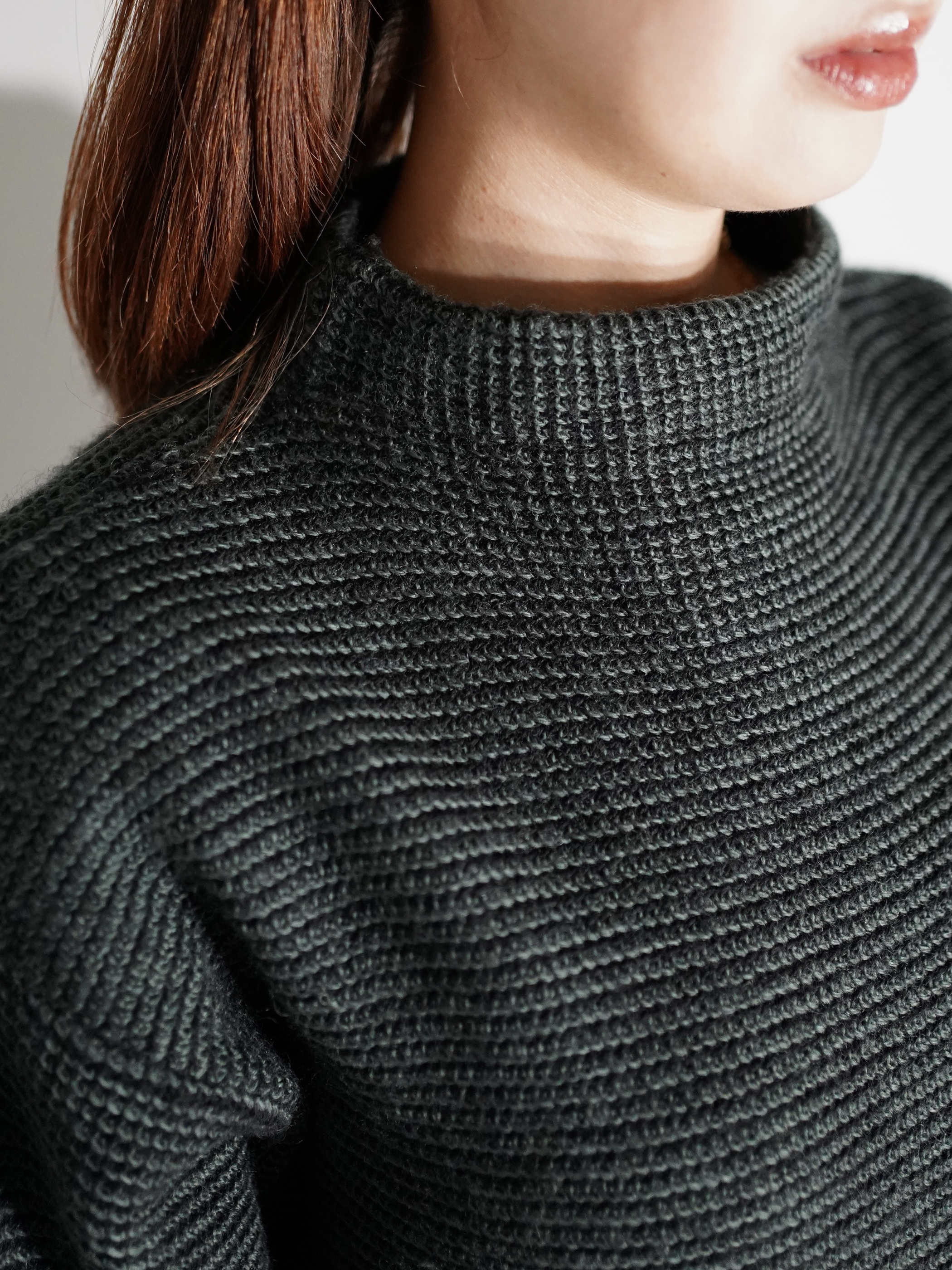 襟元は浅めでゆとりあるモックネックデザインのため快適