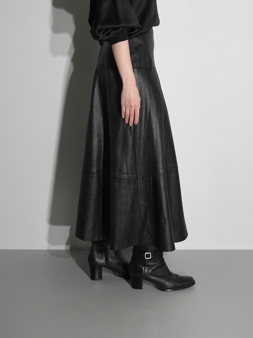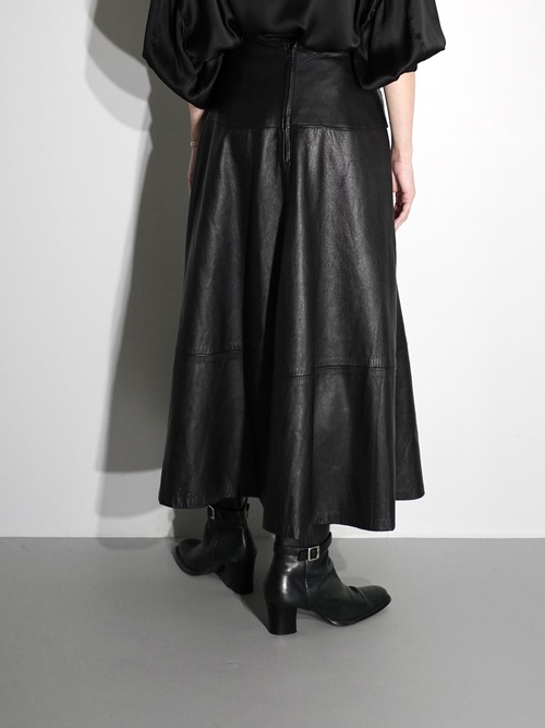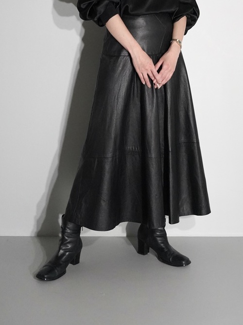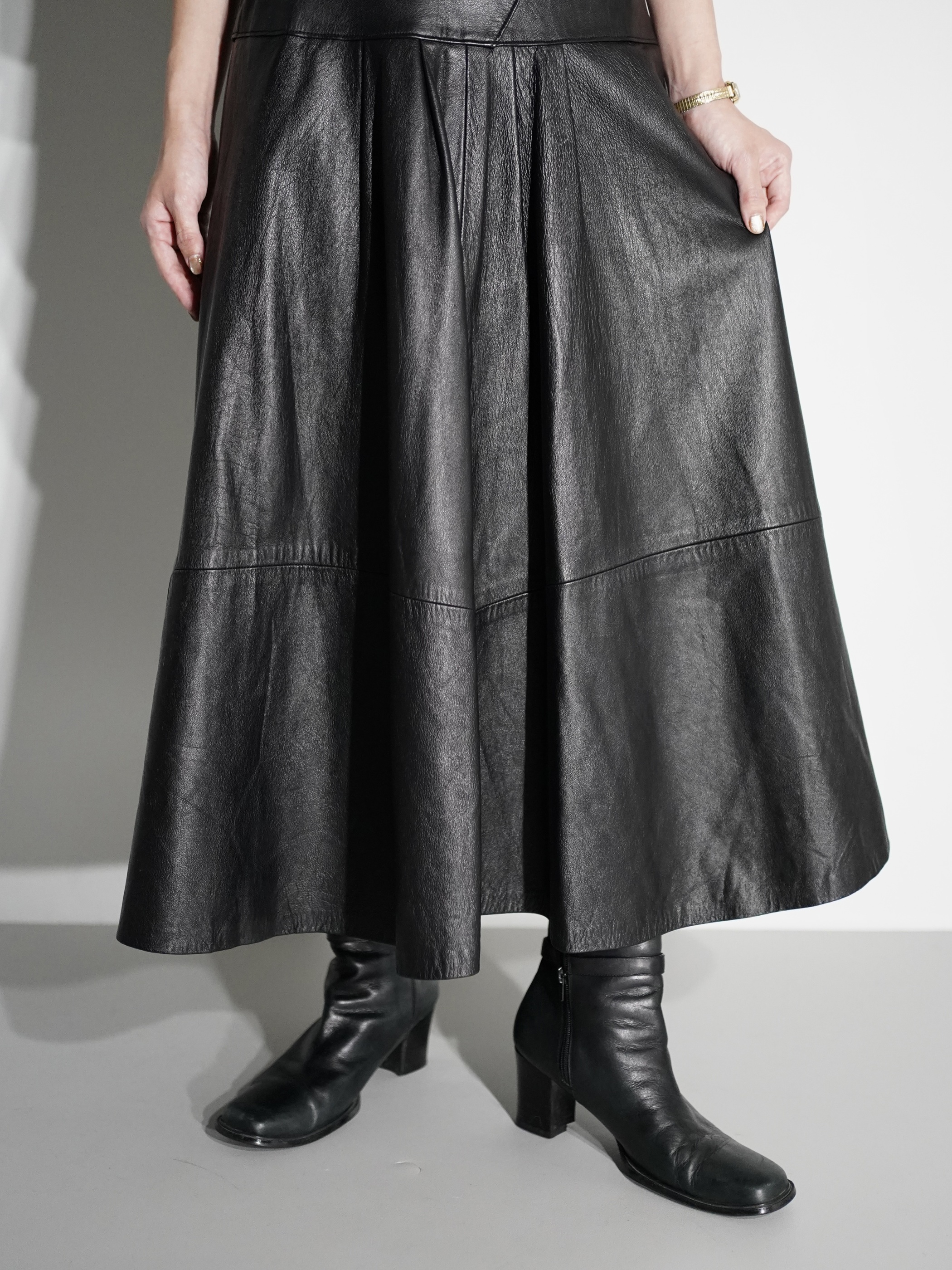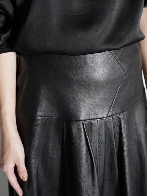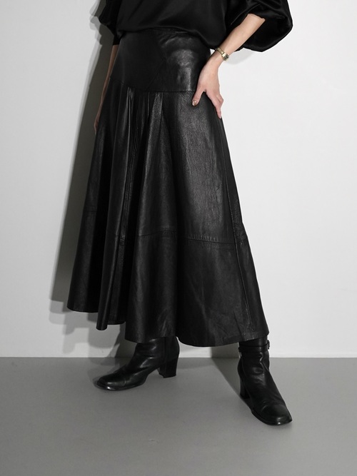 フロントに4本タックが入り、クラシカルなフレアシルエットのレザースカート