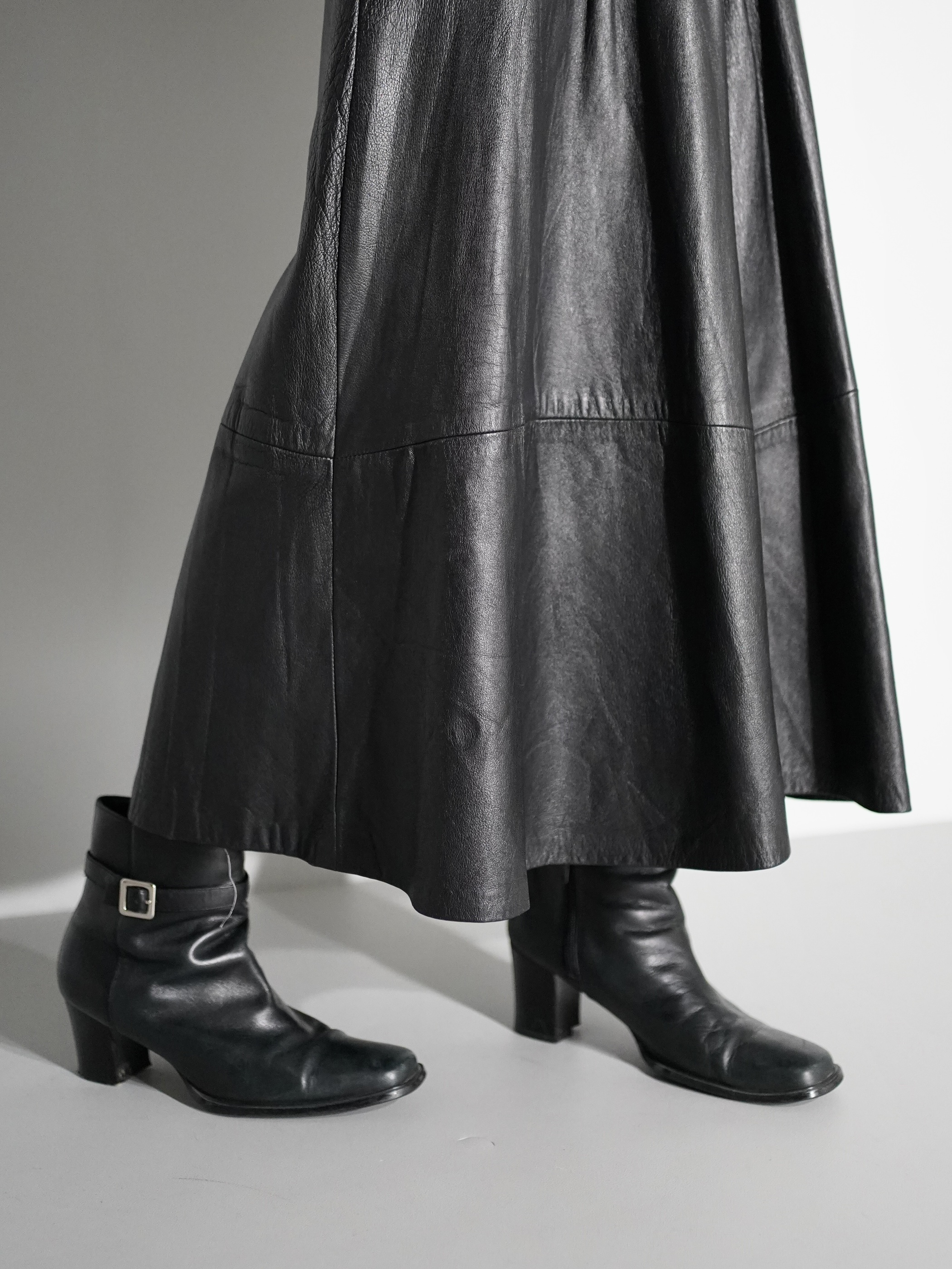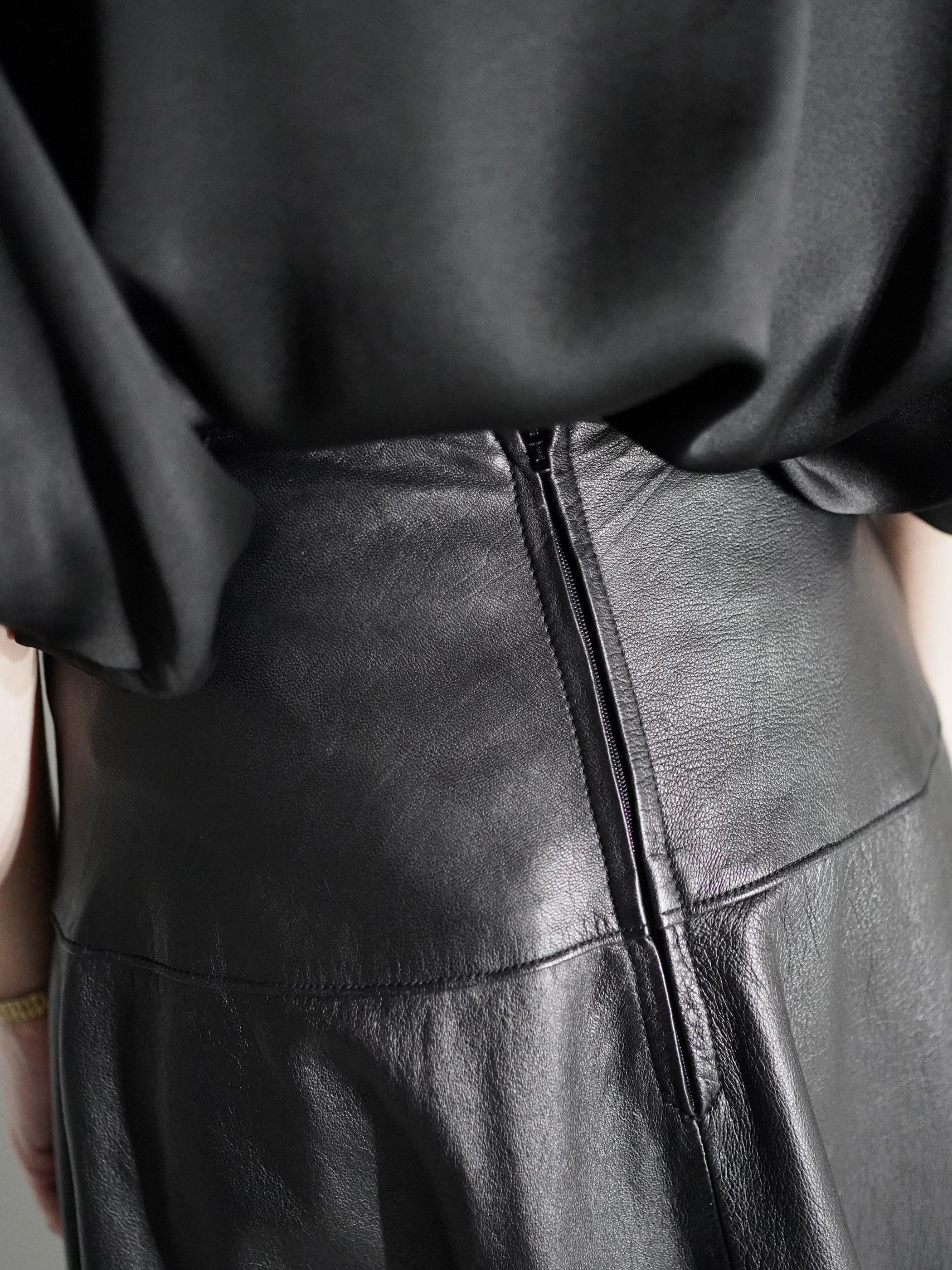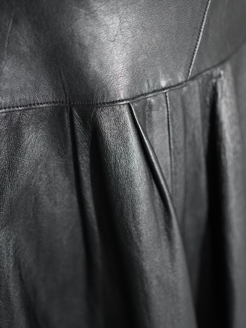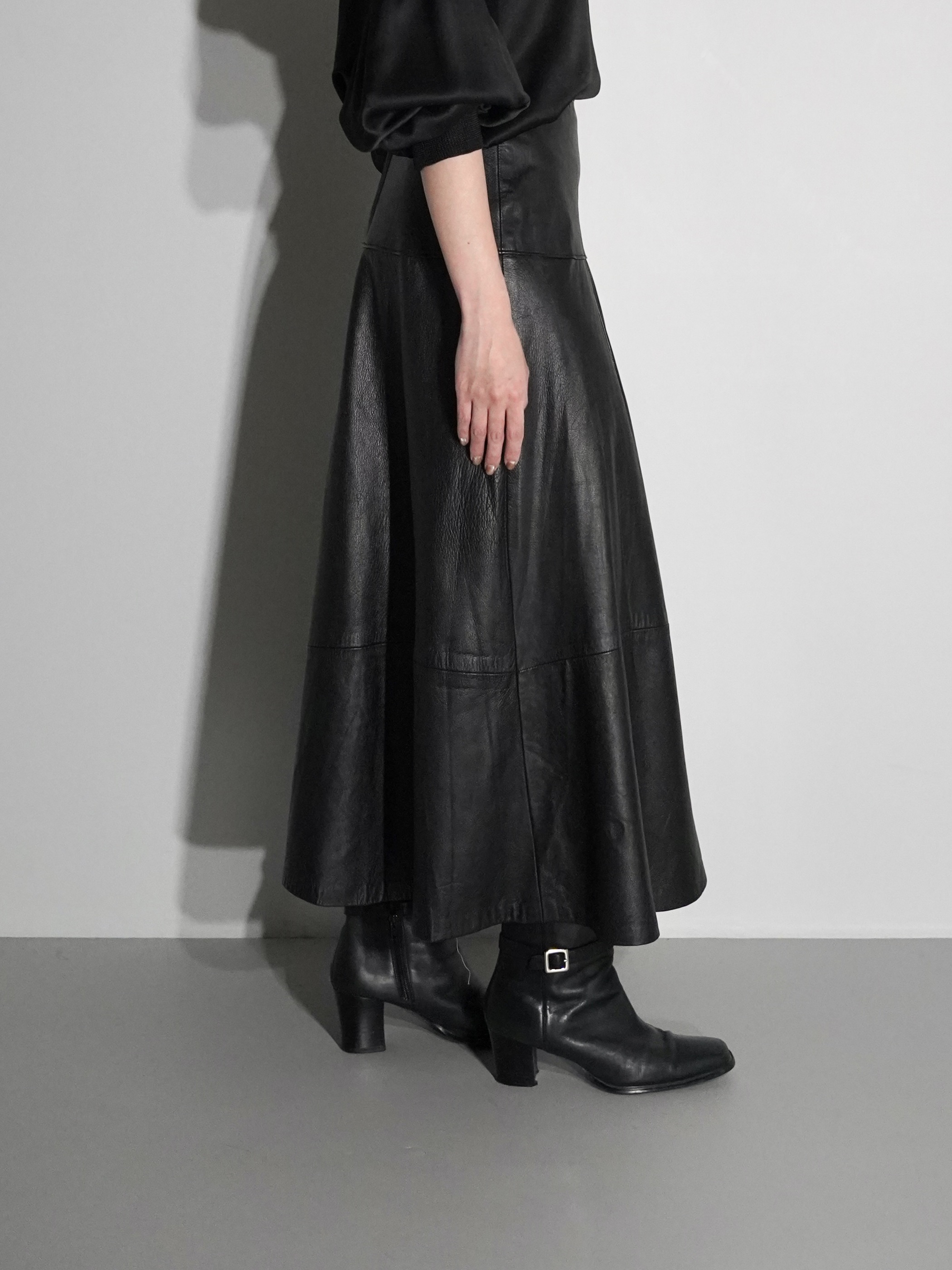 フロントに4本タックが入り、クラシカルなフレアシルエットのレザースカート