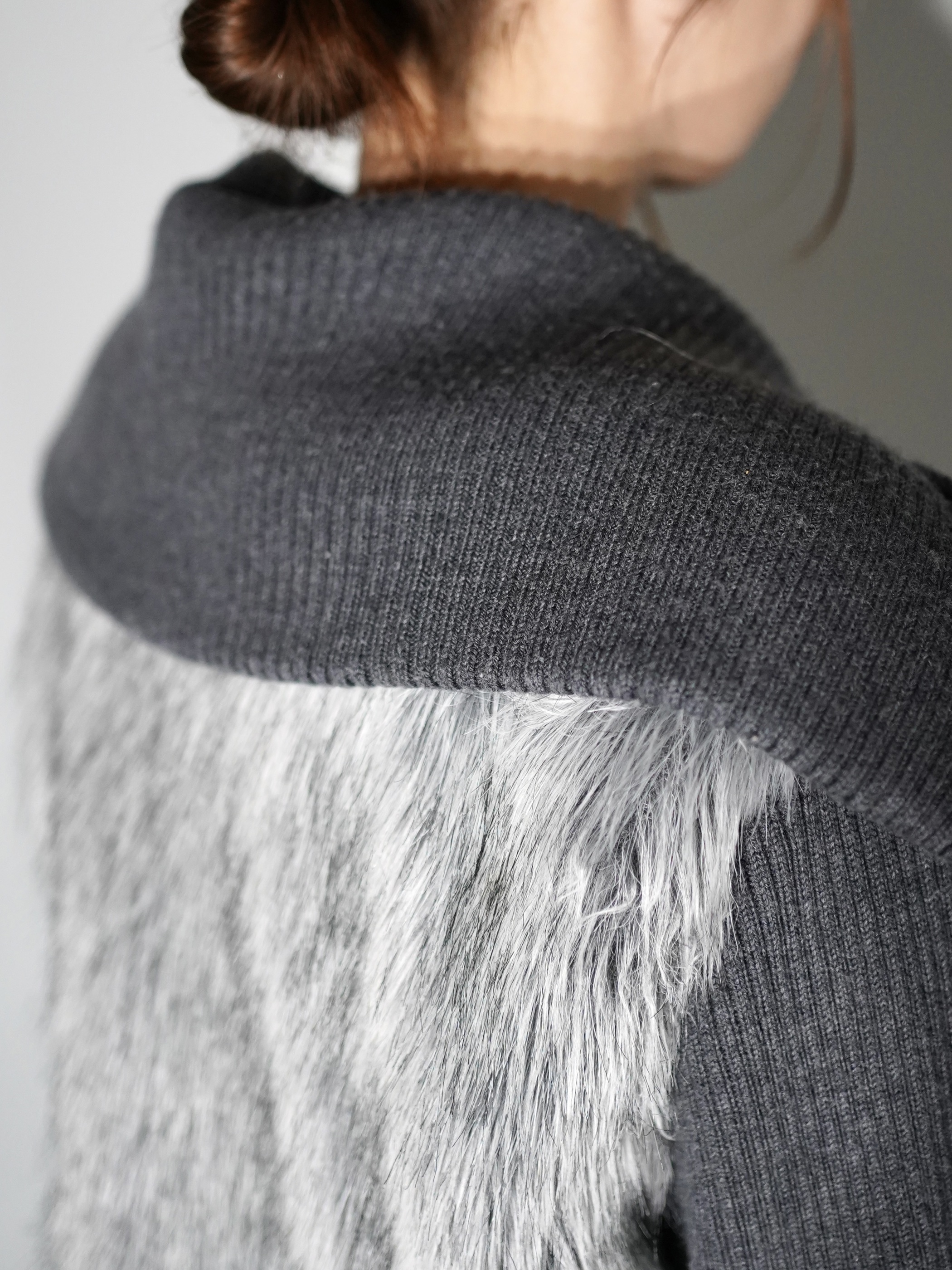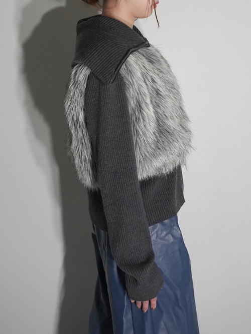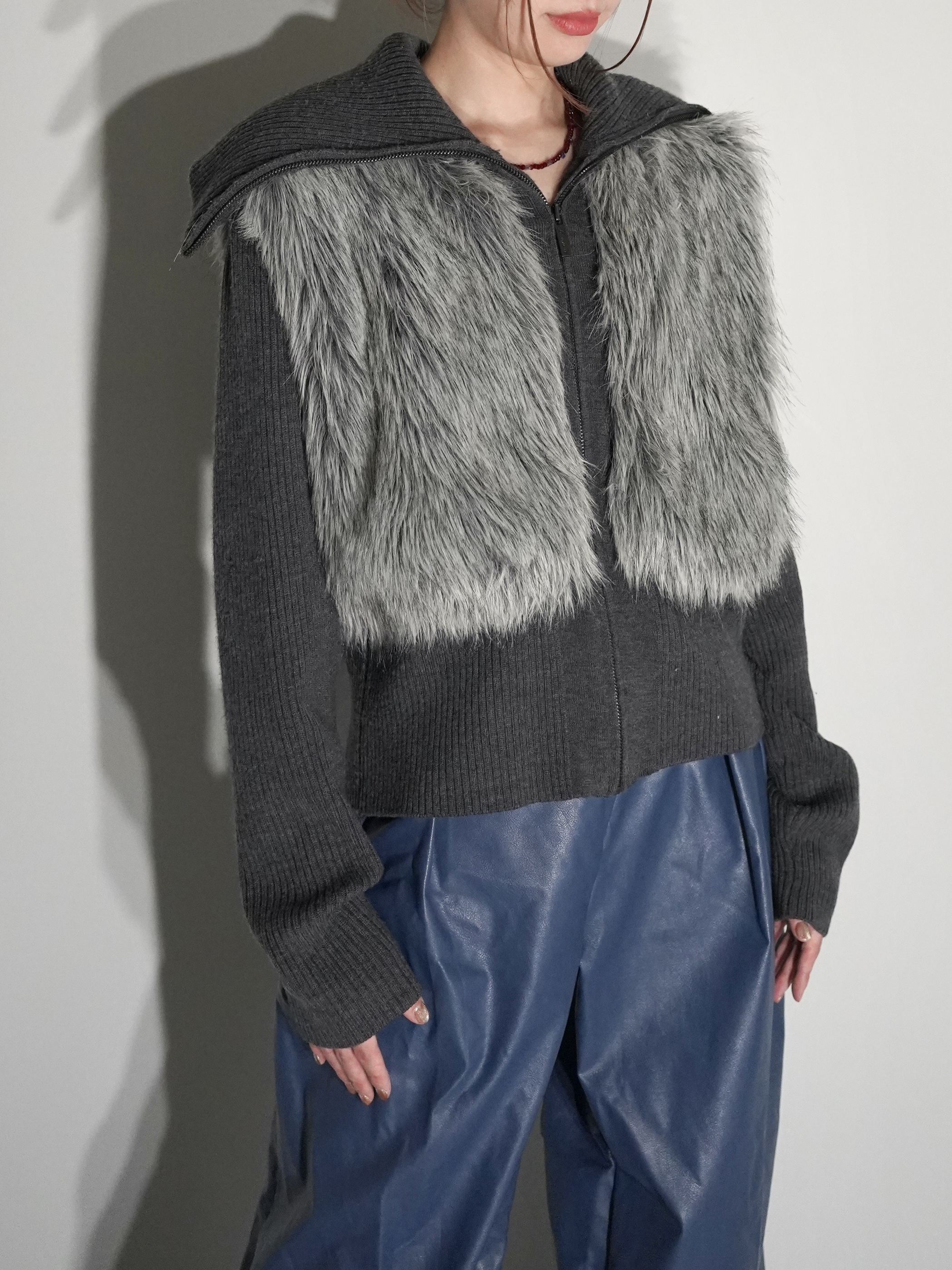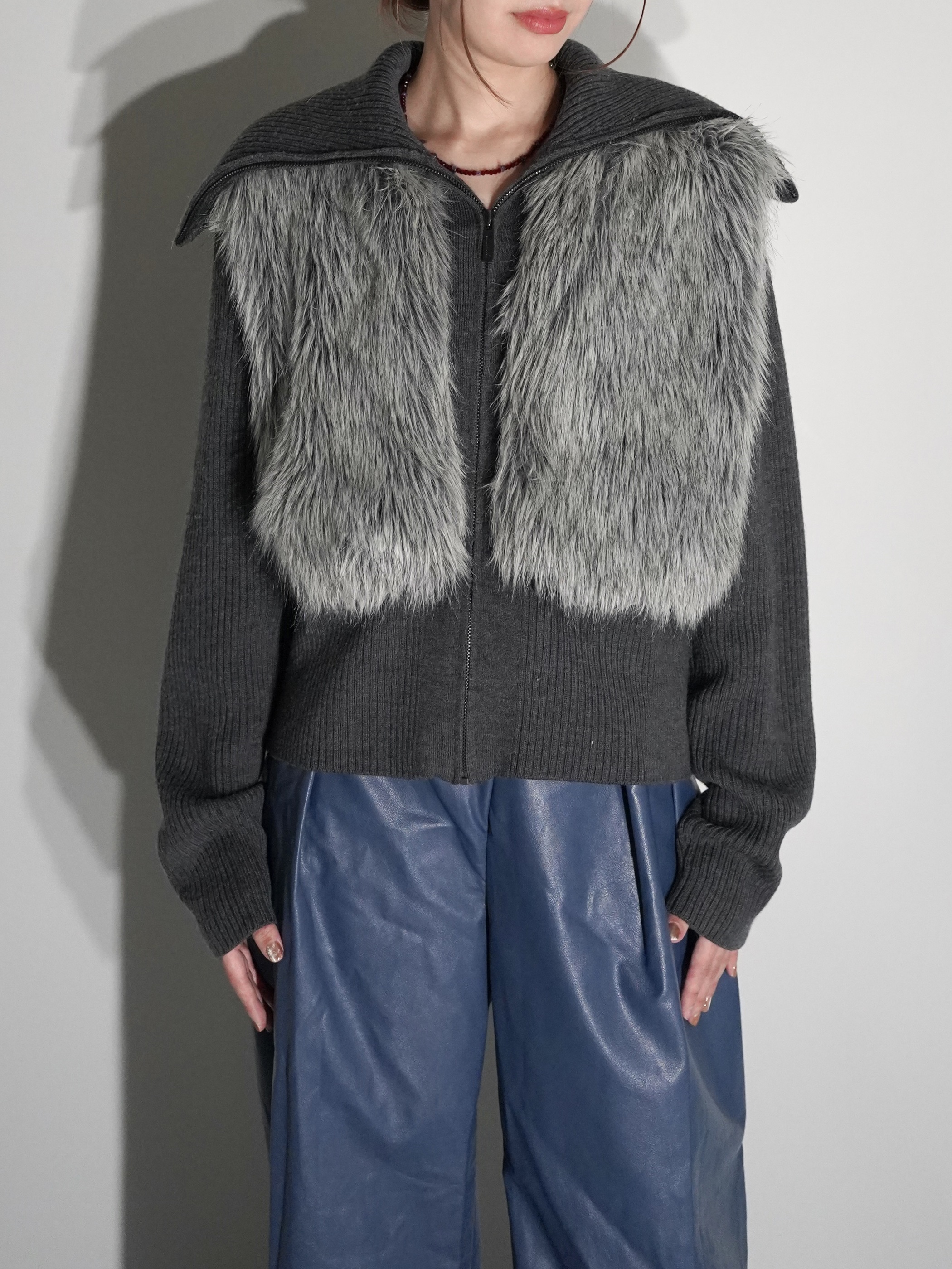 短丈のファーベストをレイヤードしているかの様なデザインのリブニットジャケット