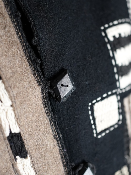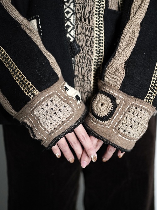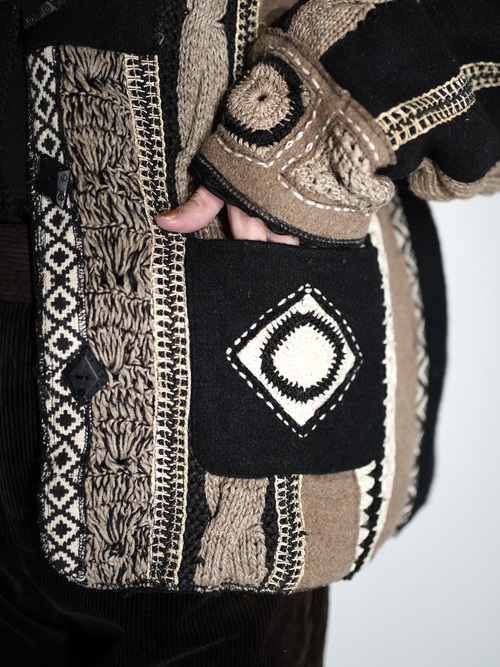 ウール生地やニット、刺繍を組み合わせたアシンメトリーデザインのジャケット。