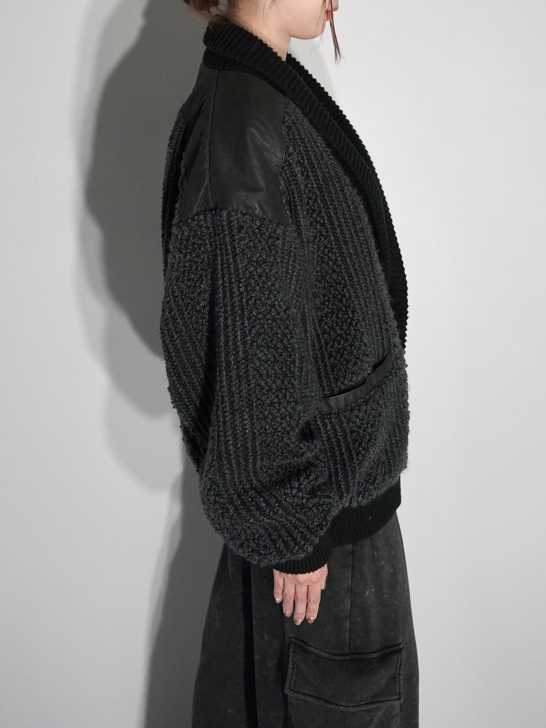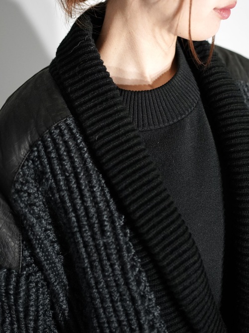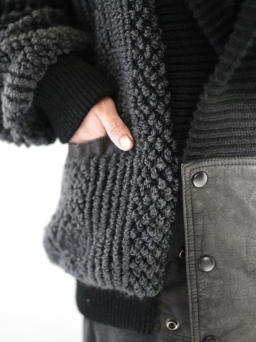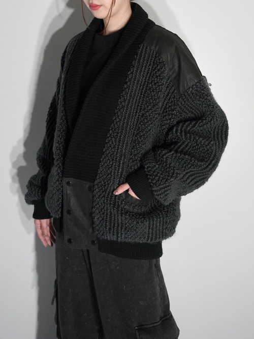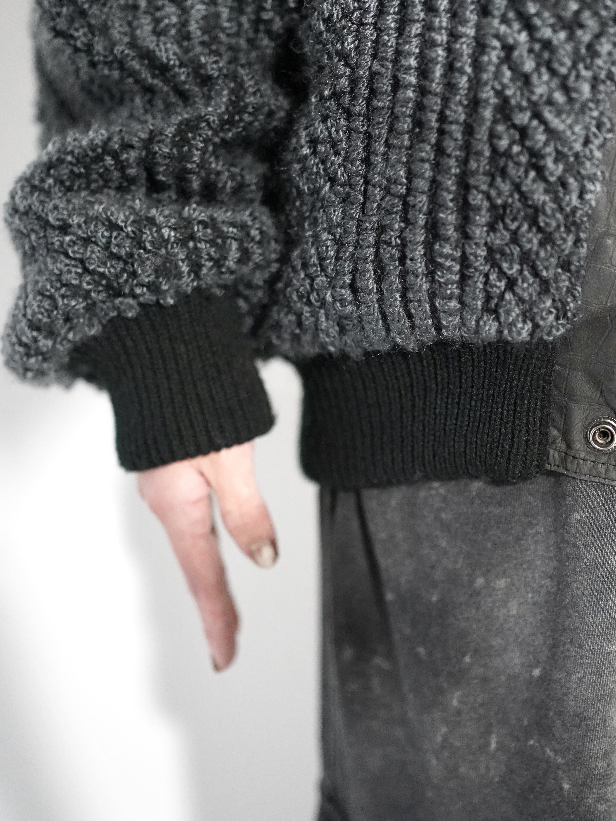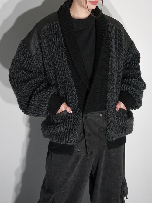グレーと黒の太目の毛糸でループ状に編みされており、凸凹感を演出。またショールカラー部分は厚みのあるニット地(黒)にて素材での切り替えも何気に良い。