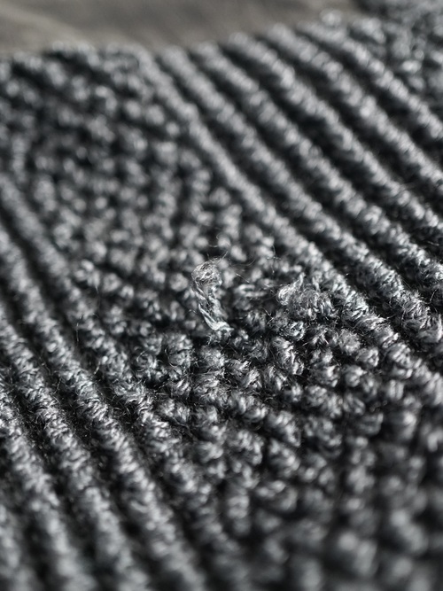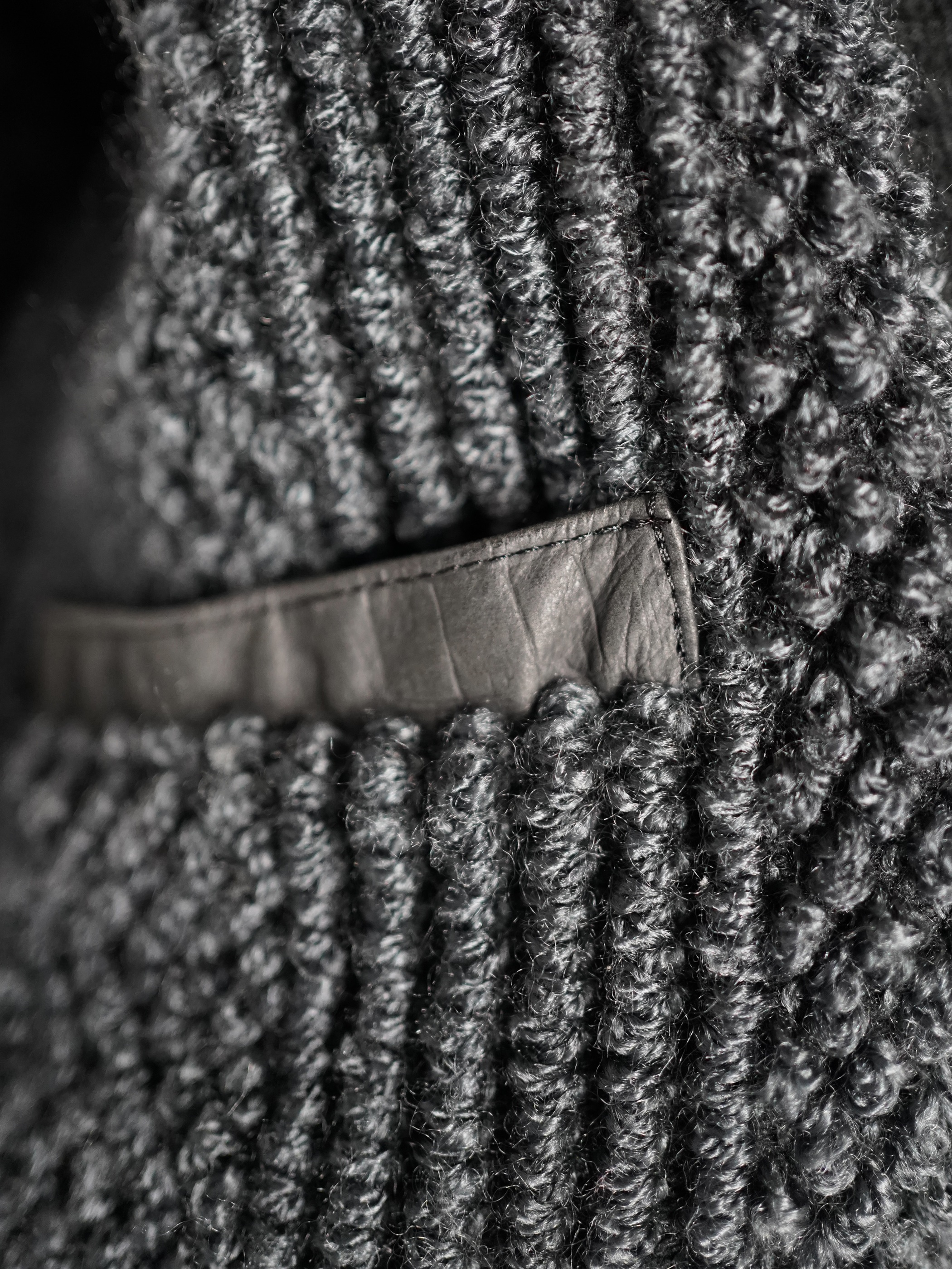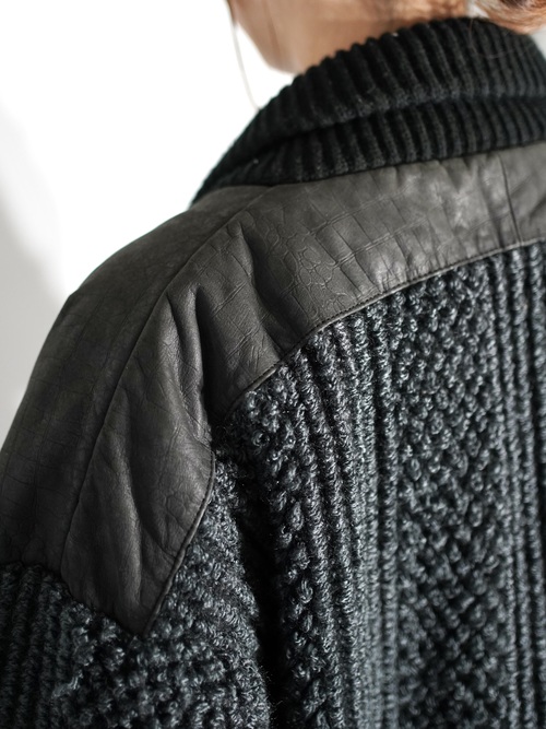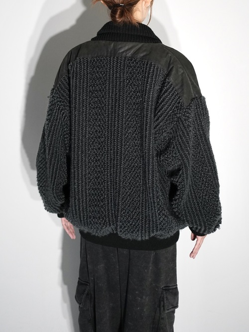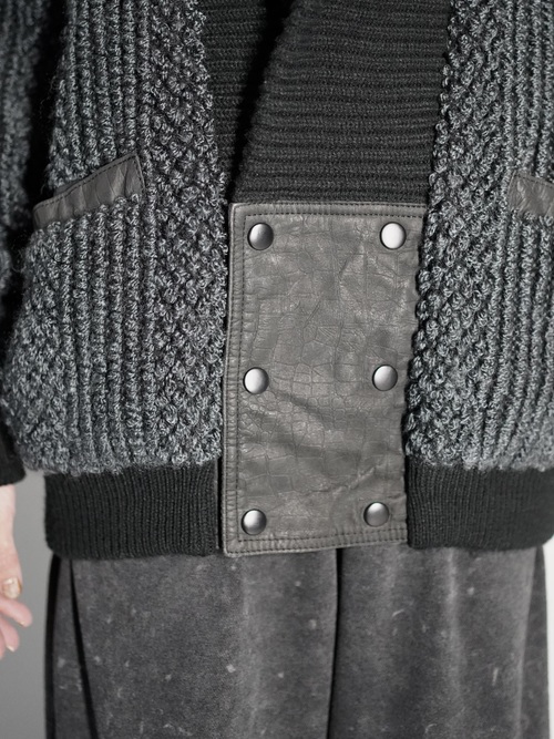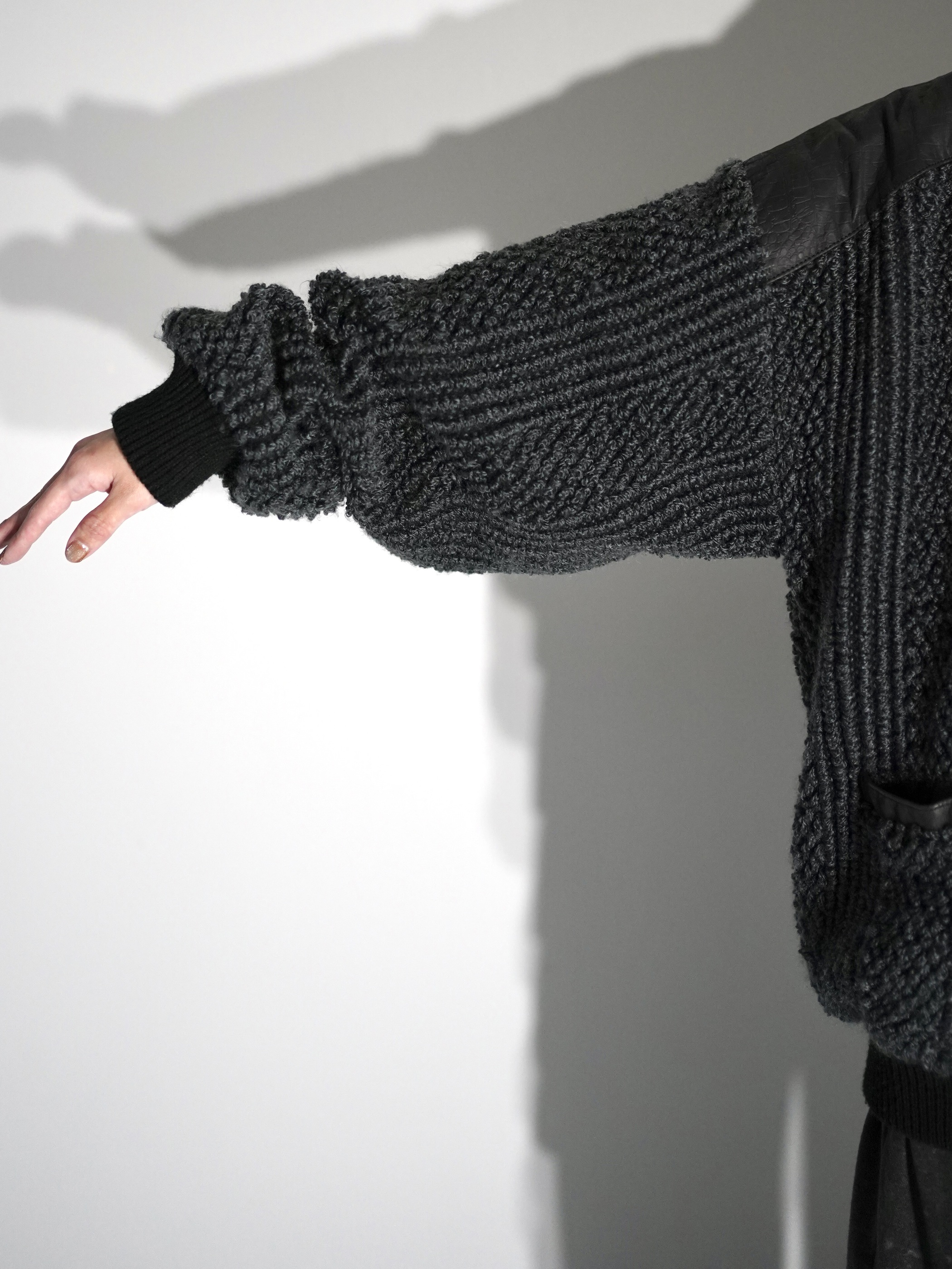グレーと黒の太目の毛糸でループ状に編みされており、凸凹感を演出。またショールカラー部分は厚みのあるニット地(黒)にて素材での切り替えも何気に良い。