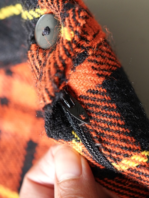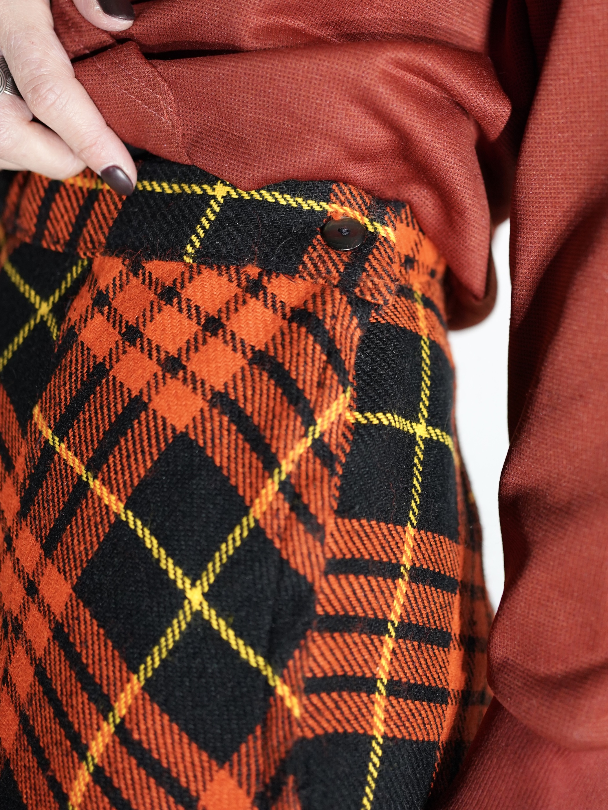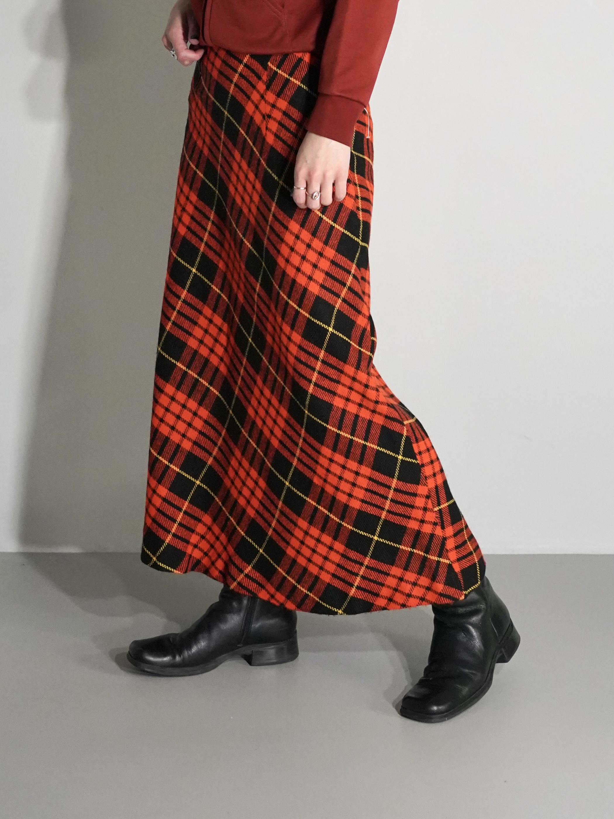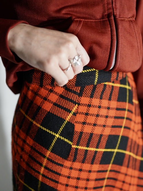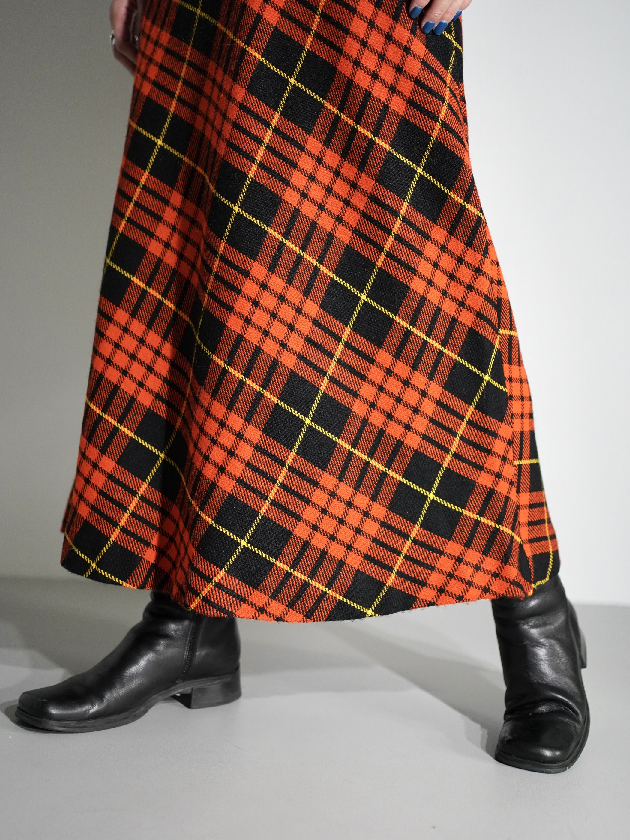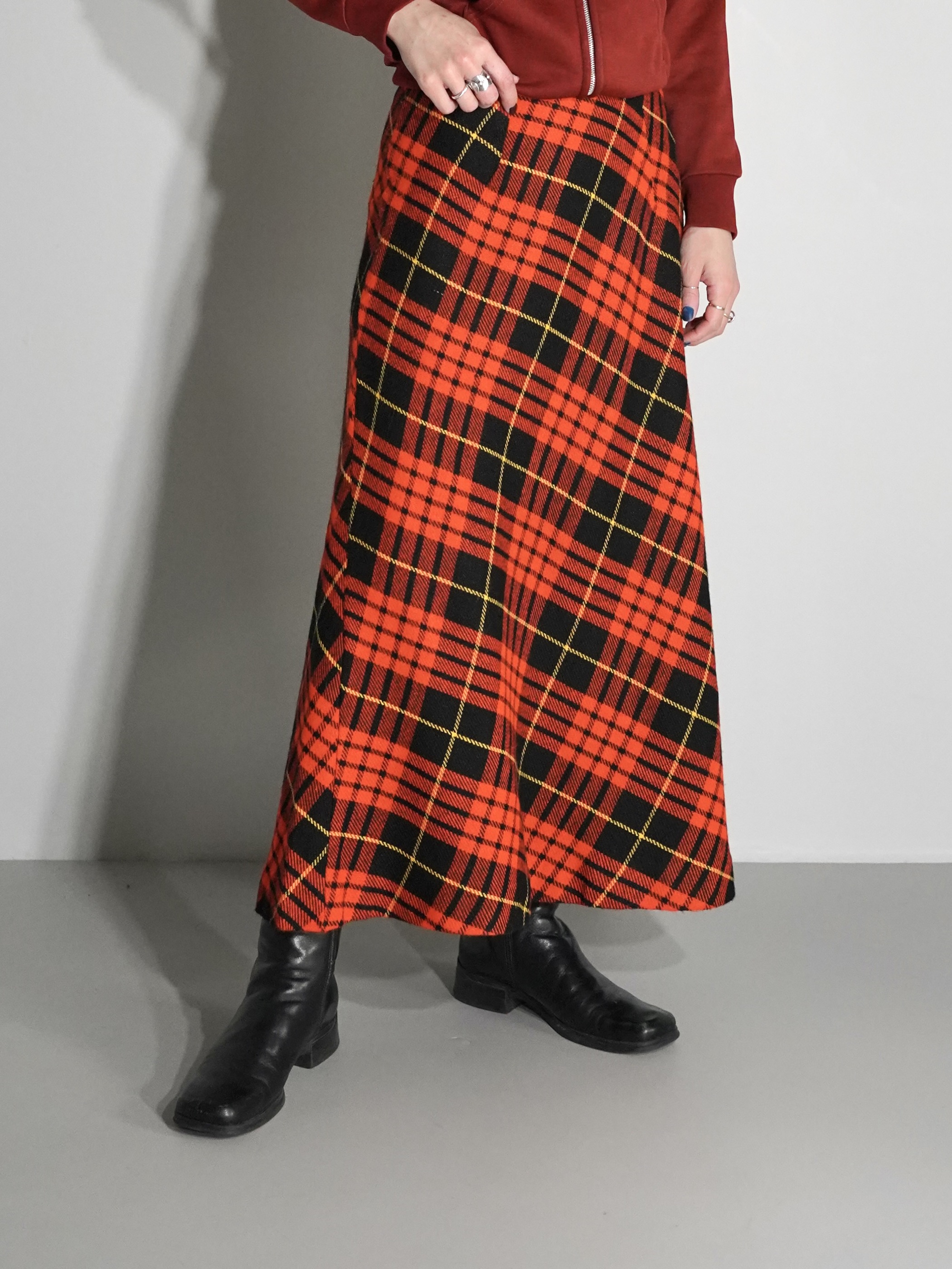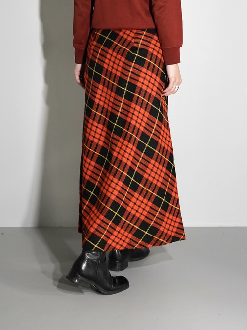 鮮やかなオレンジカラーをベースにイエローのラインが映えるタータンチェックのスカート