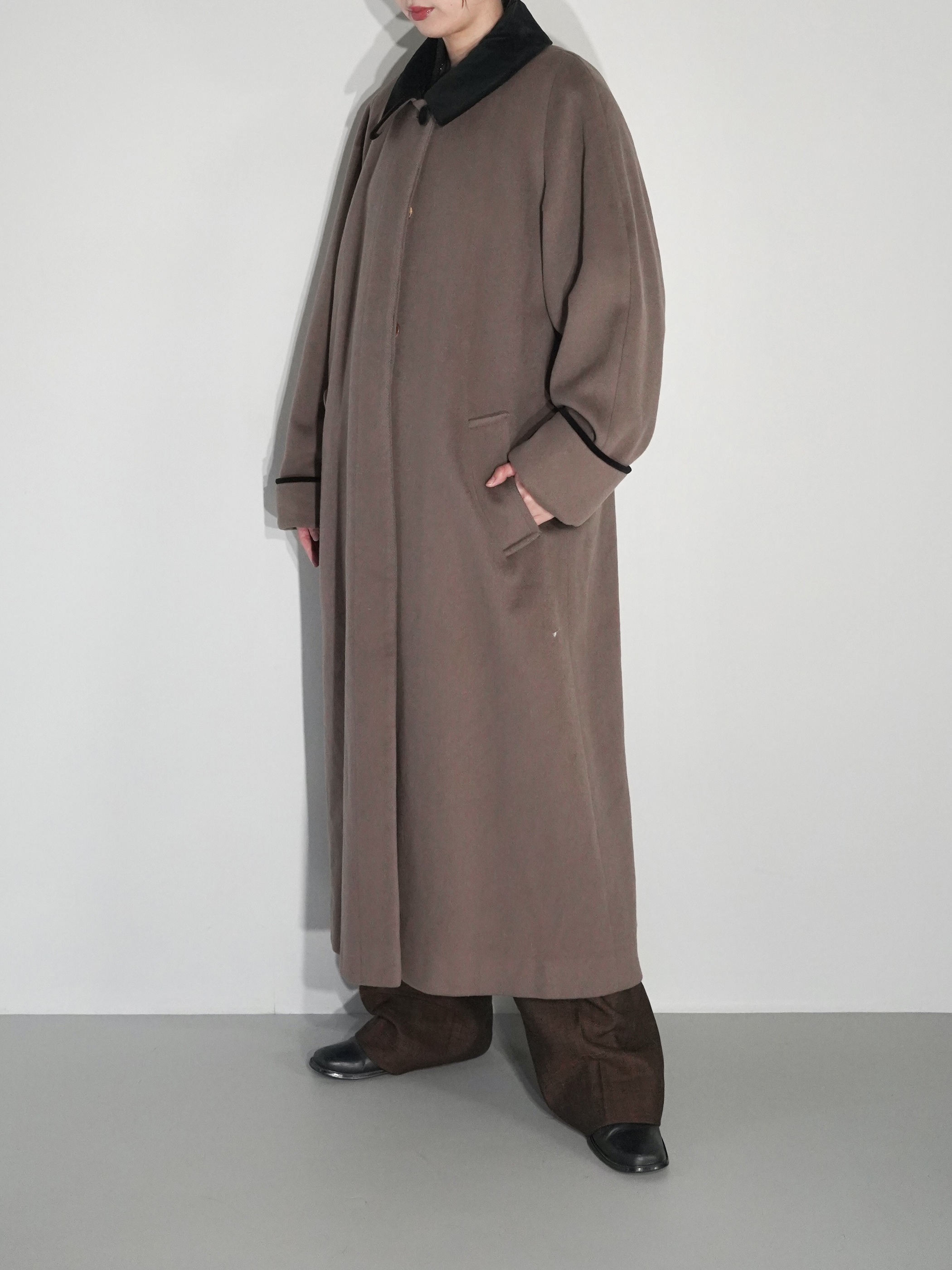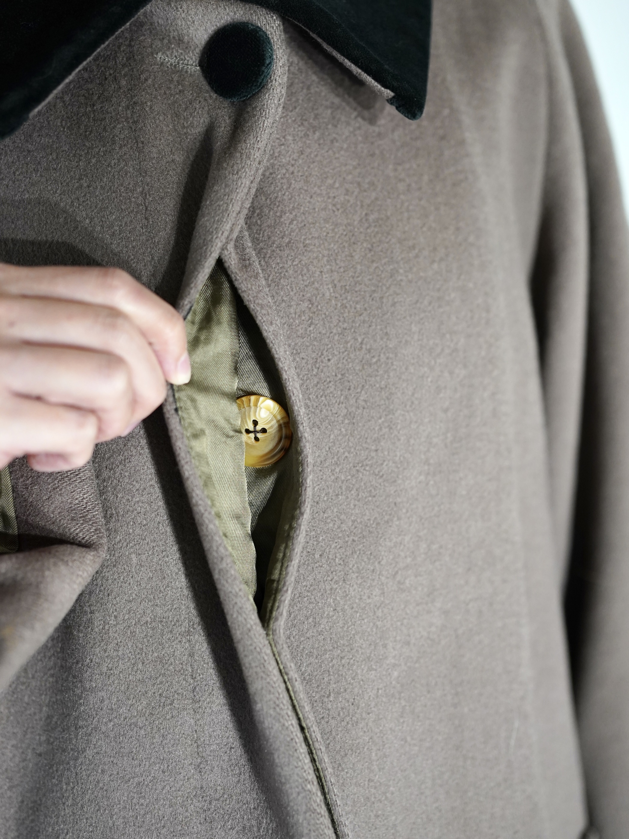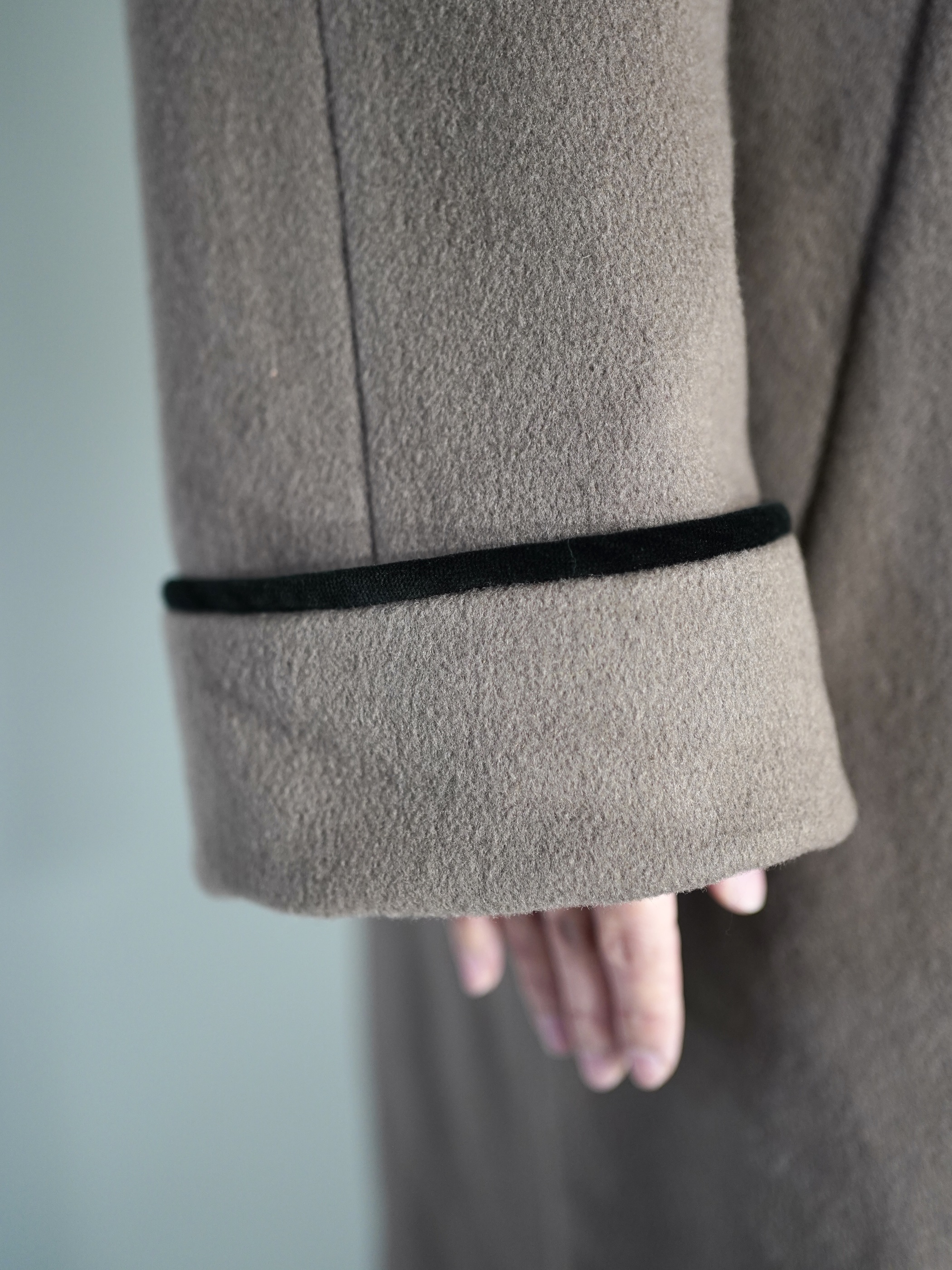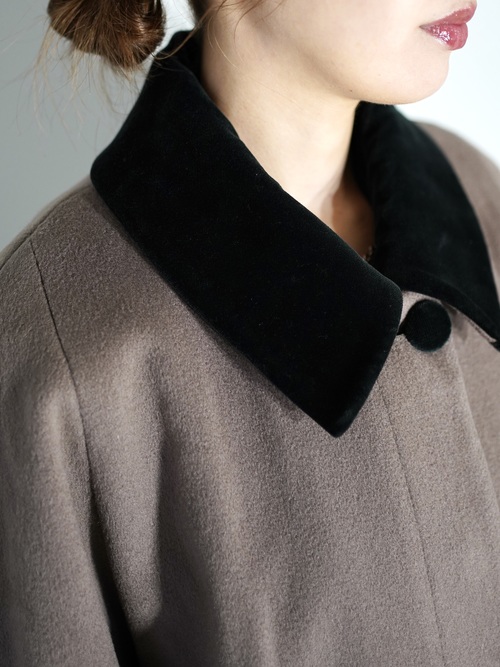 グレージュのメルトンウールに襟はベルベット素材の切り替えが90年代らしい