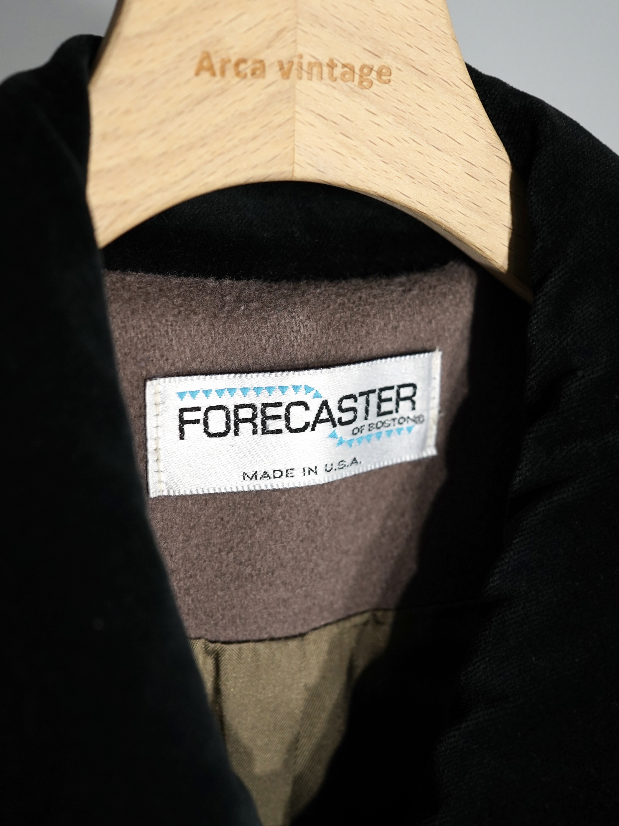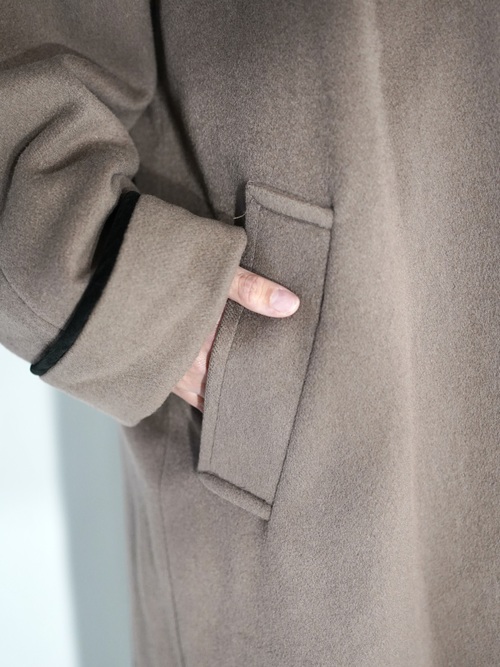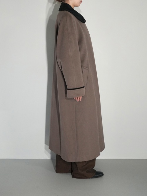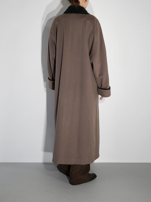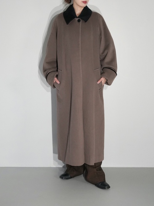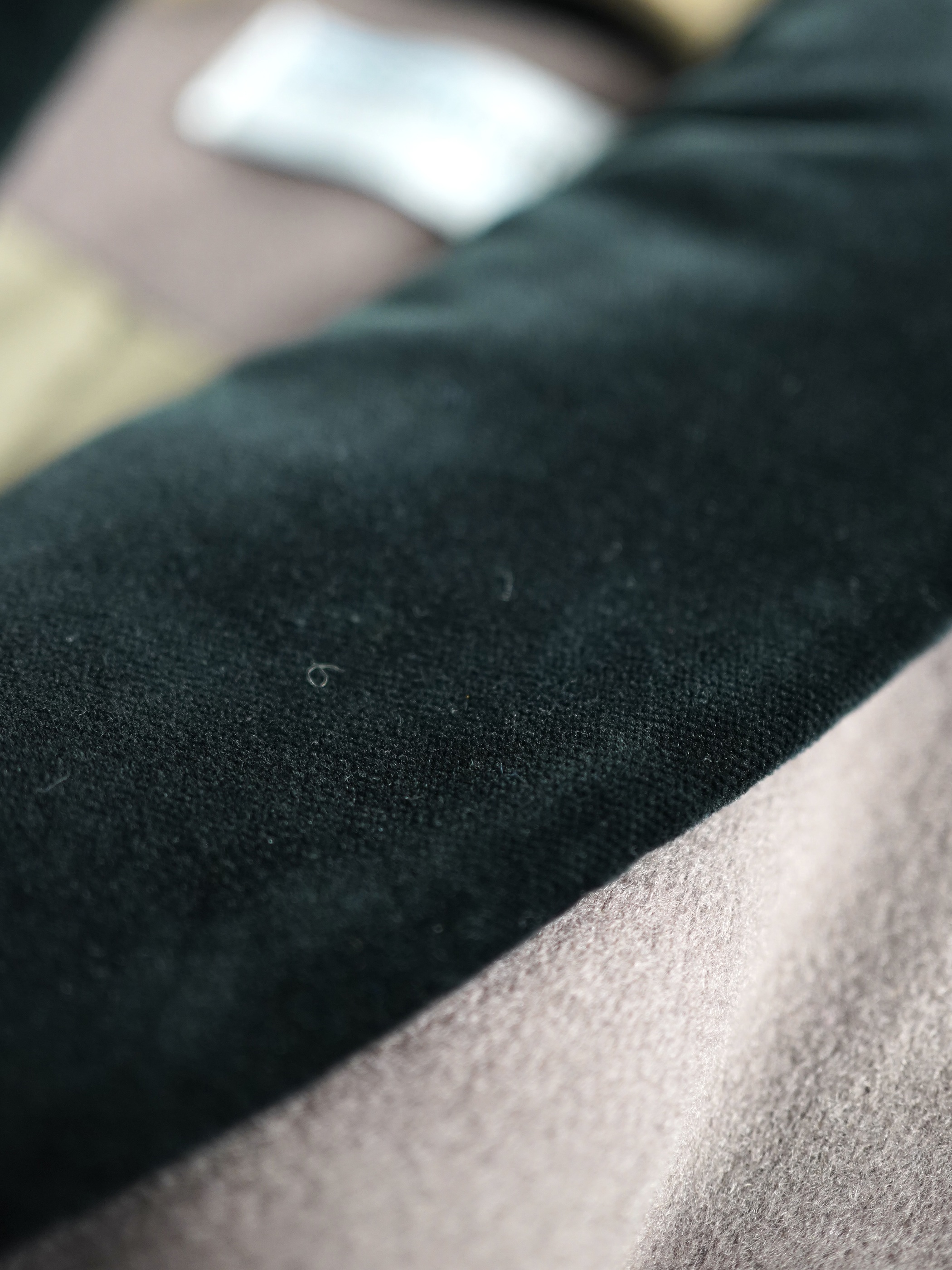 グレージュのメルトンウールに襟はベルベット素材の切り替えが90年代らしい