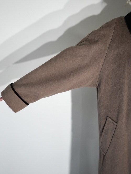 ラグラン仕様で肩のラインの張りもなく、すっきりとした印象。袖の折り返しデザインも全体を柔らかく魅せてくれています。