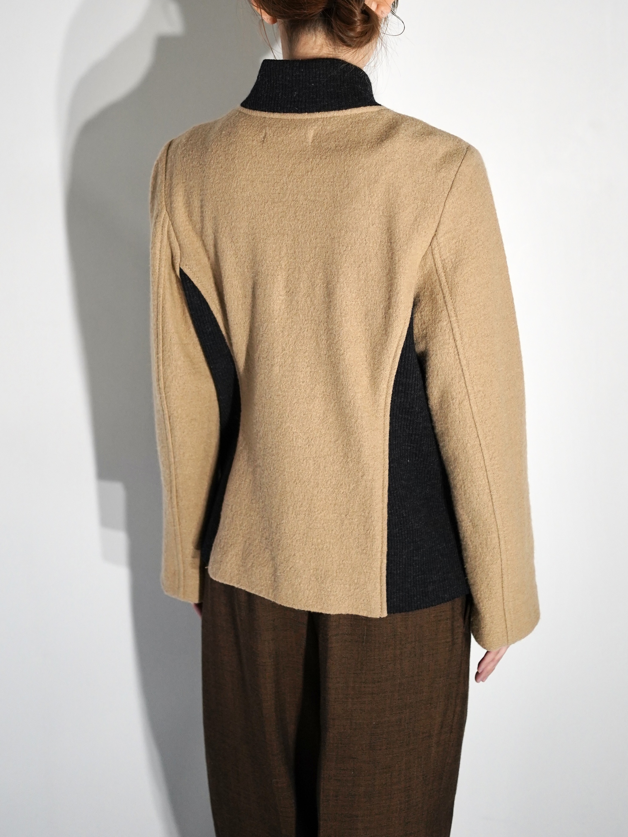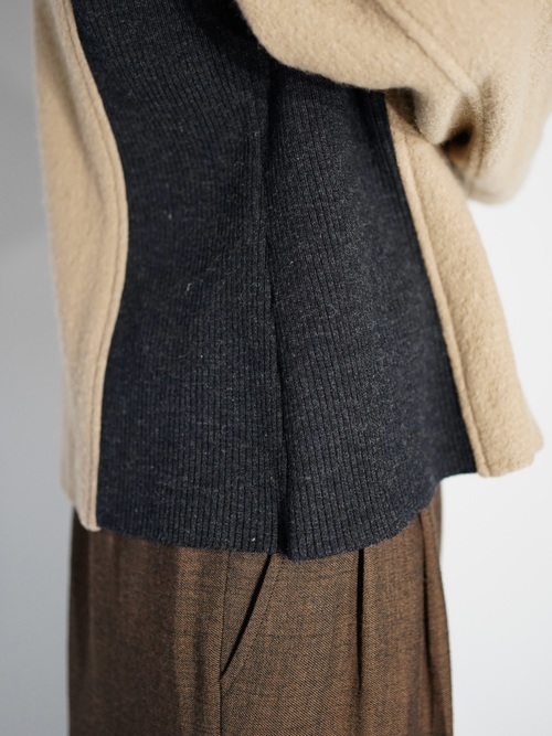襟元と身幅部分はリブ編み状のニット素材を使用