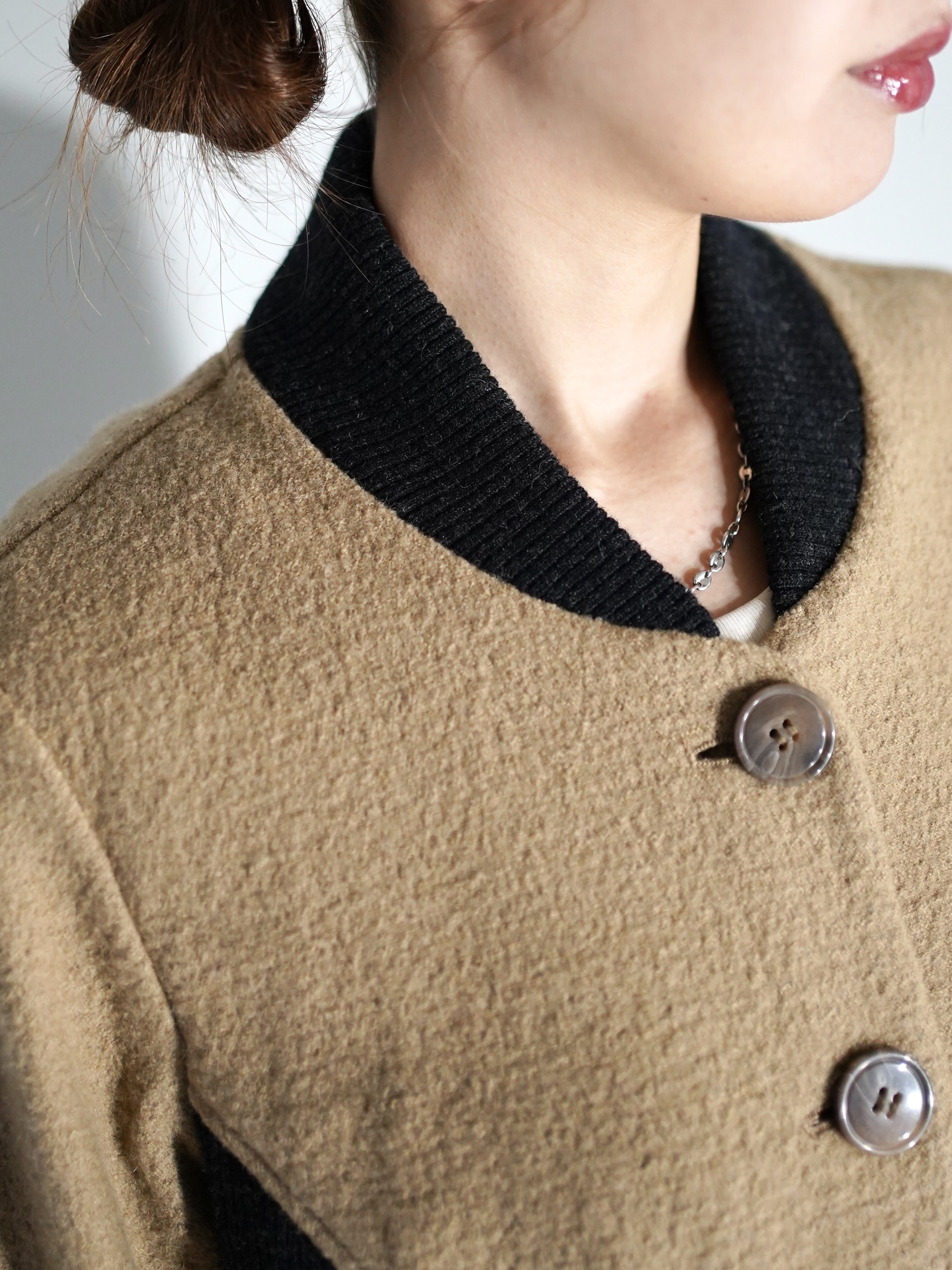 襟元がすっきりとクラシカルなデザインなので、カーディガン感覚にてコートのインナーに挿せるアイテムとなります。色味もまた良し。