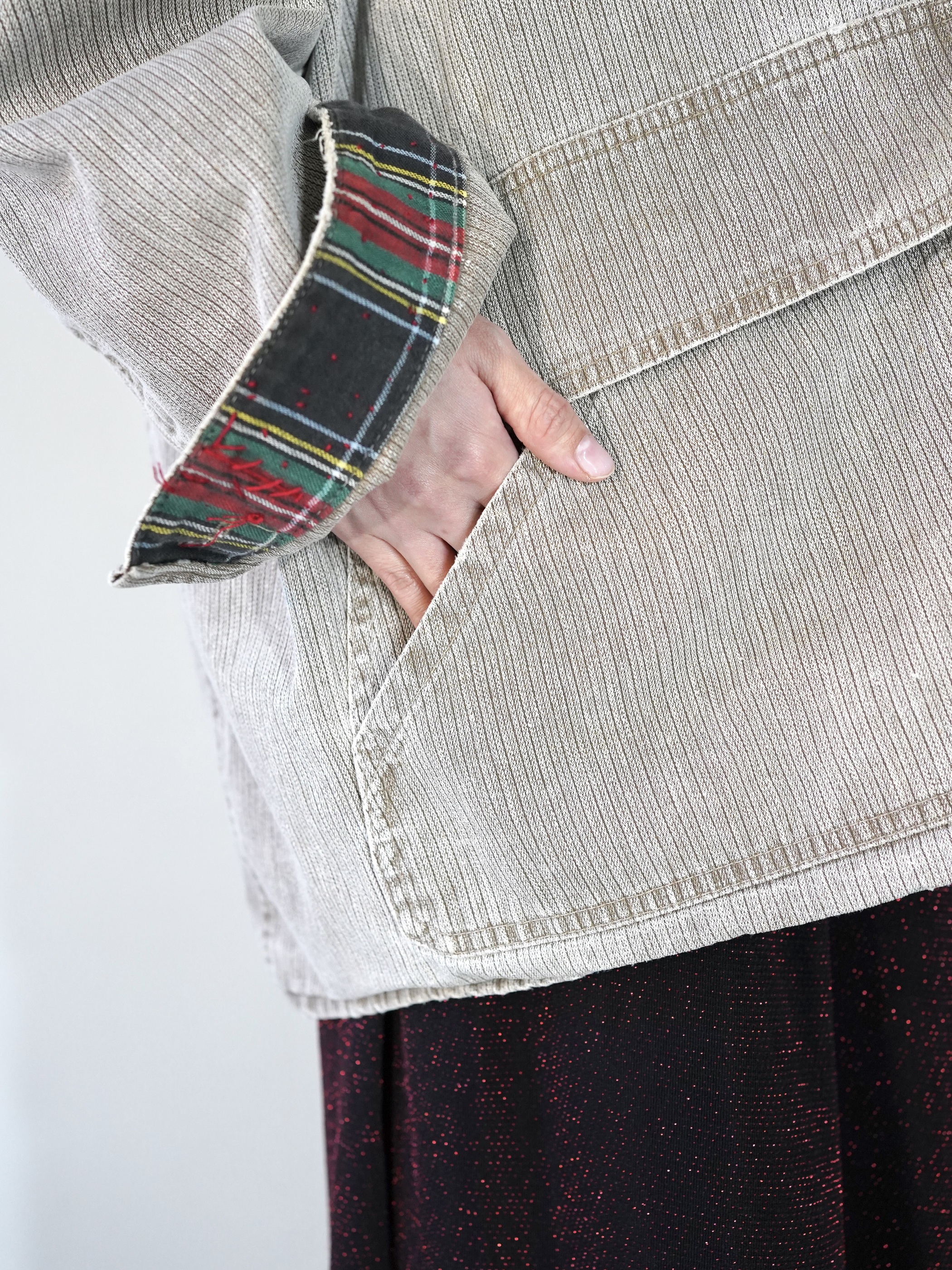 裏地がチェックパターンとなる為、折り返して魅せるもよし