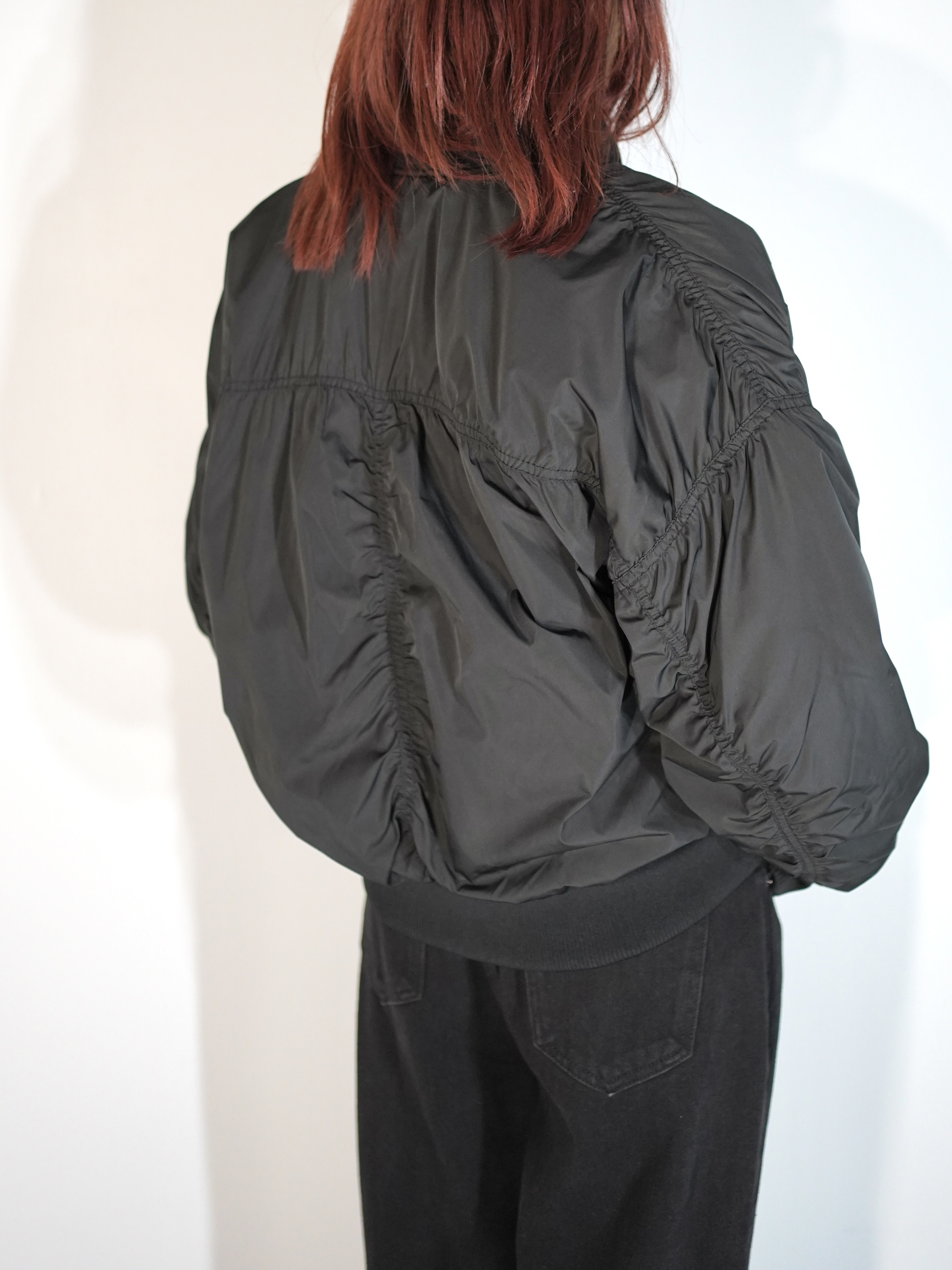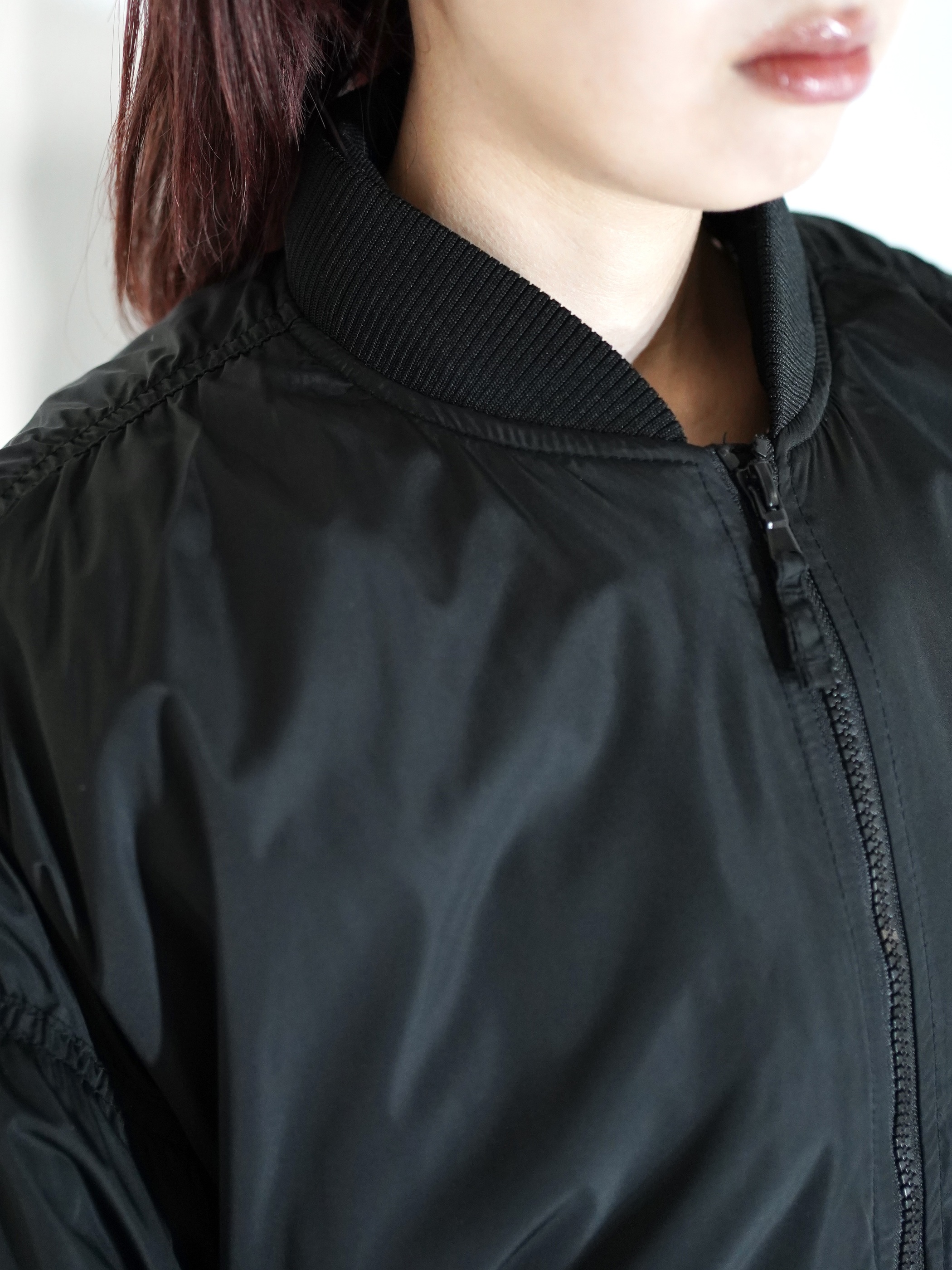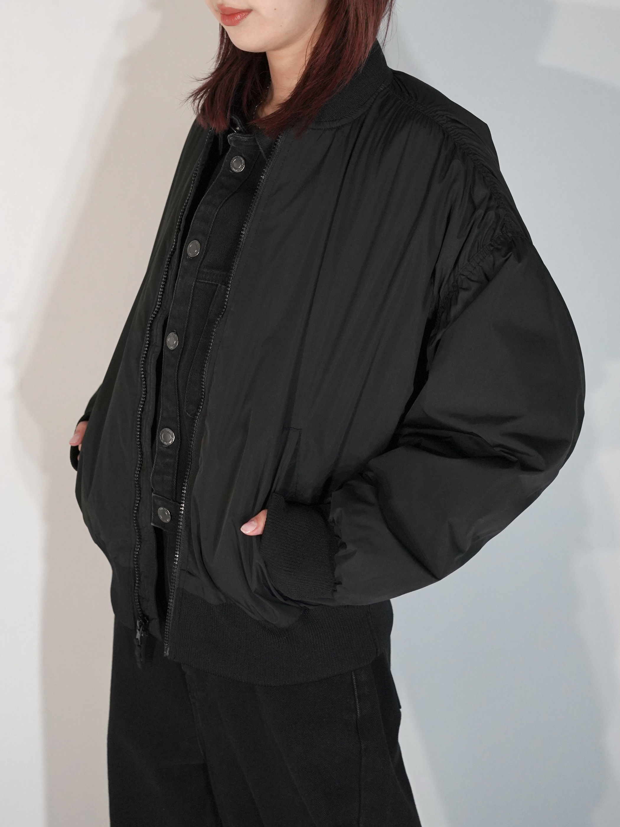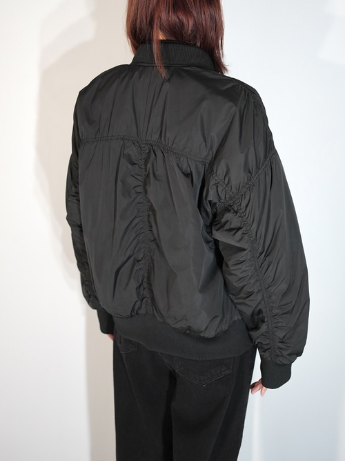 MA-1で黒だと強い印象になりがちですが、ギャザーが入ることにより柔らかな印象を与える1着です。