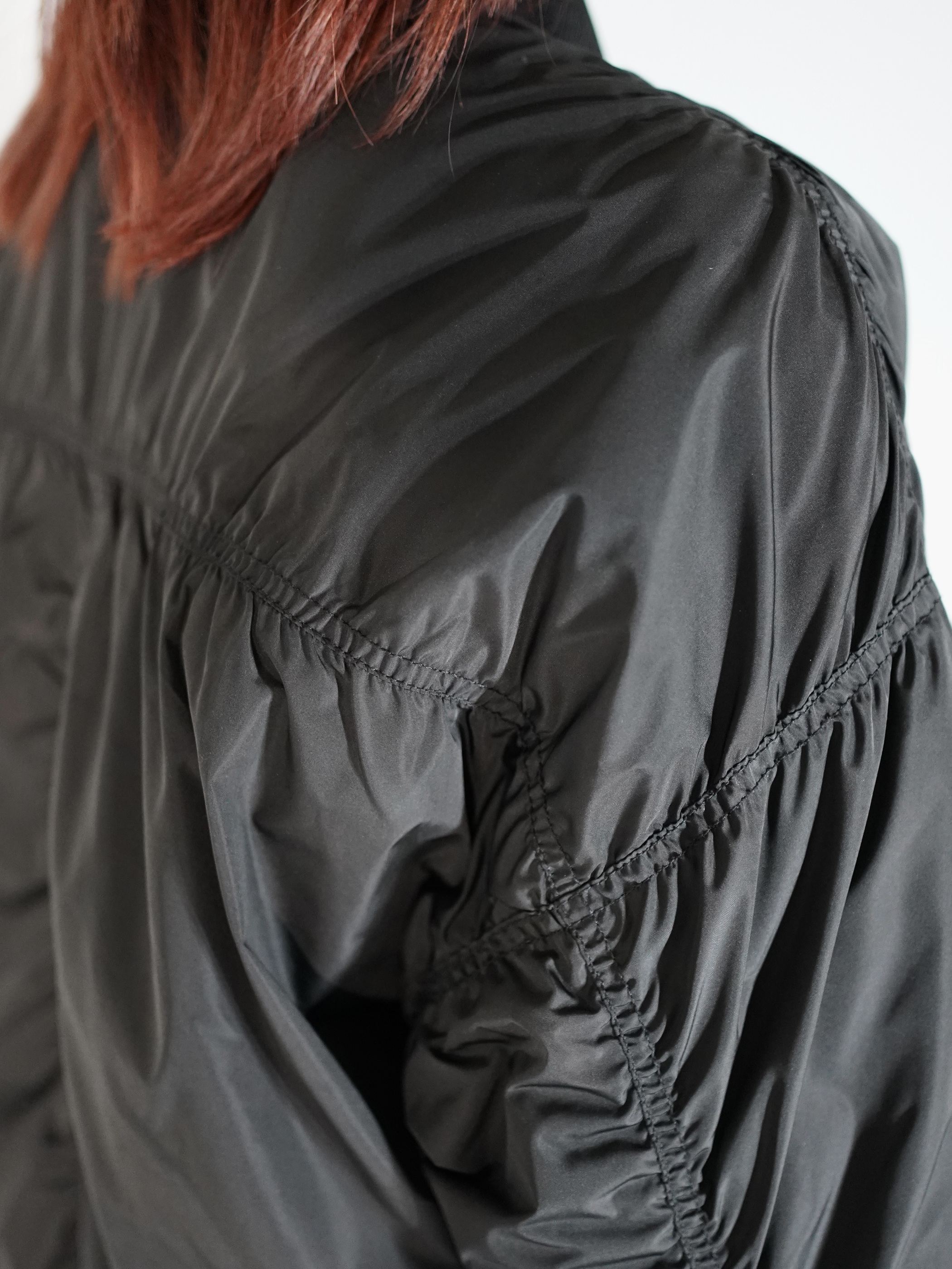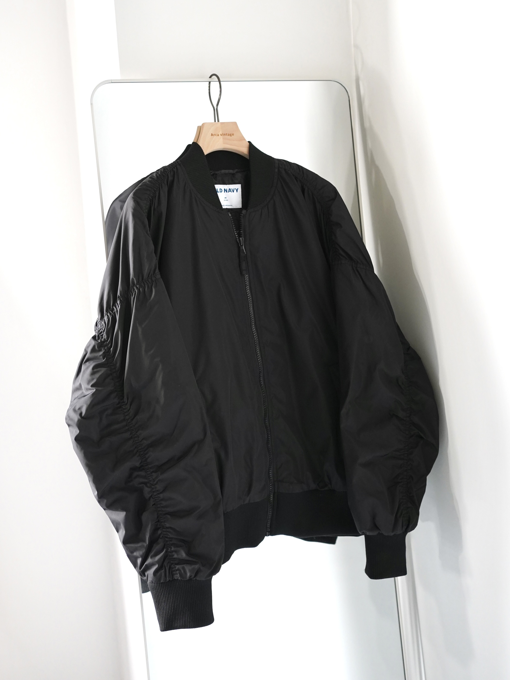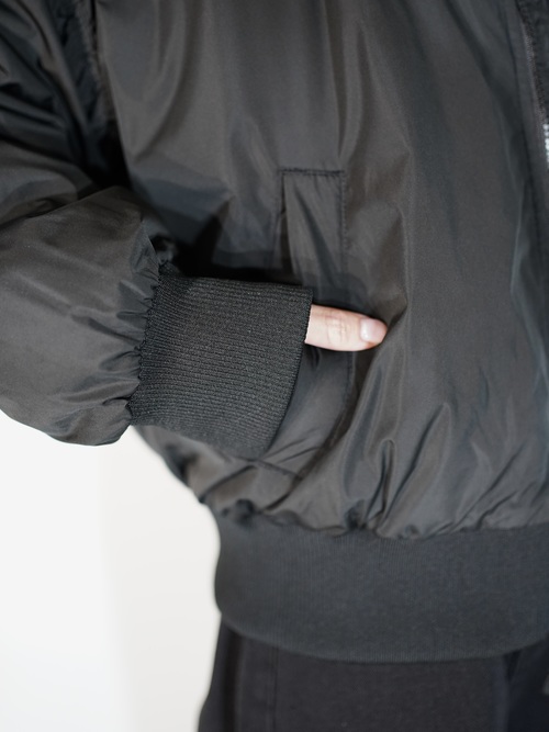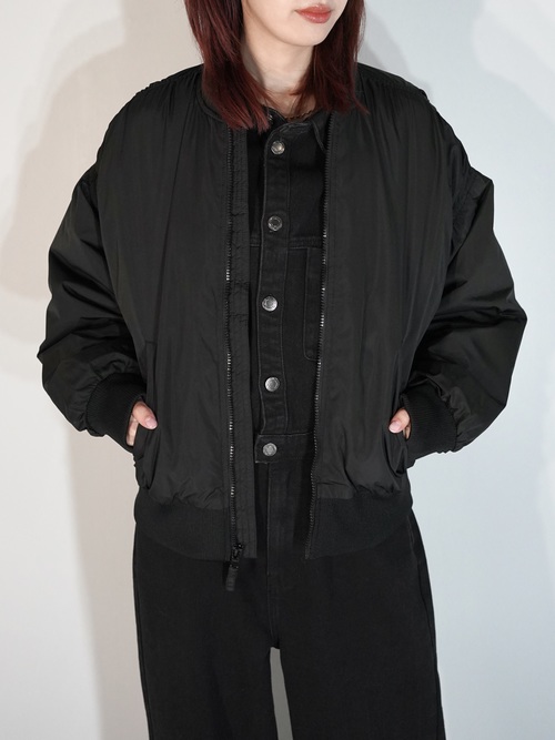 MA-1で黒だと強い印象になりがちですが、ギャザーが入ることにより柔らかな印象を与える1着です。