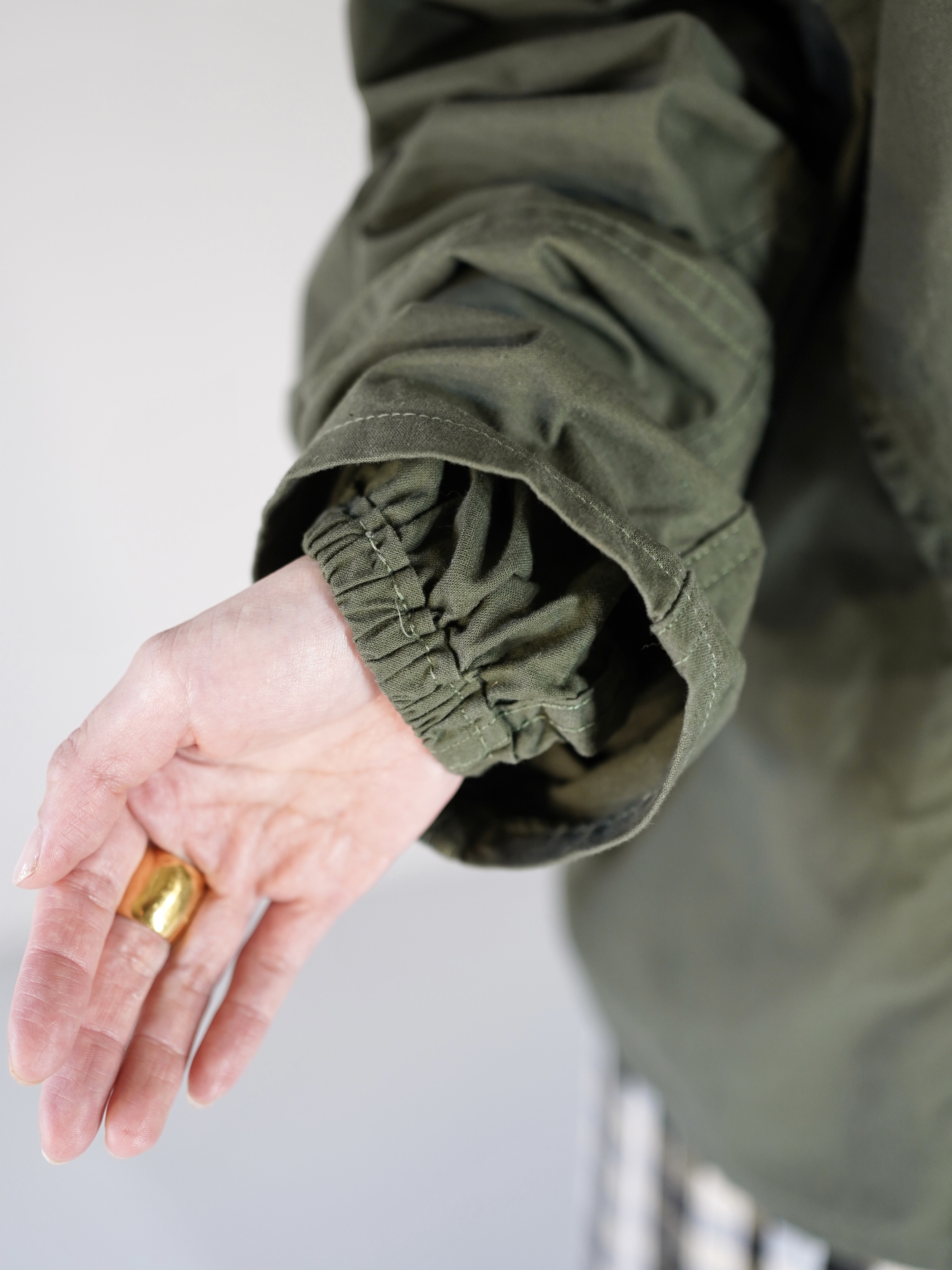 袖口は風の侵入を防ぐために内ゴム仕様、脇の部分は動きやすい様に大きく切り替えられていて機能面も高い1着です。