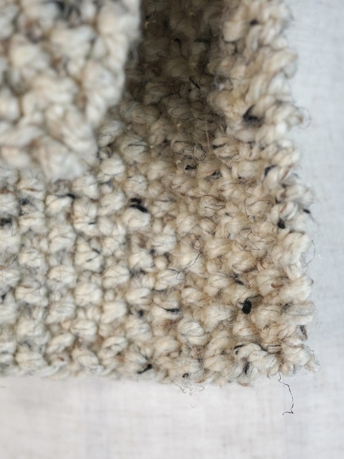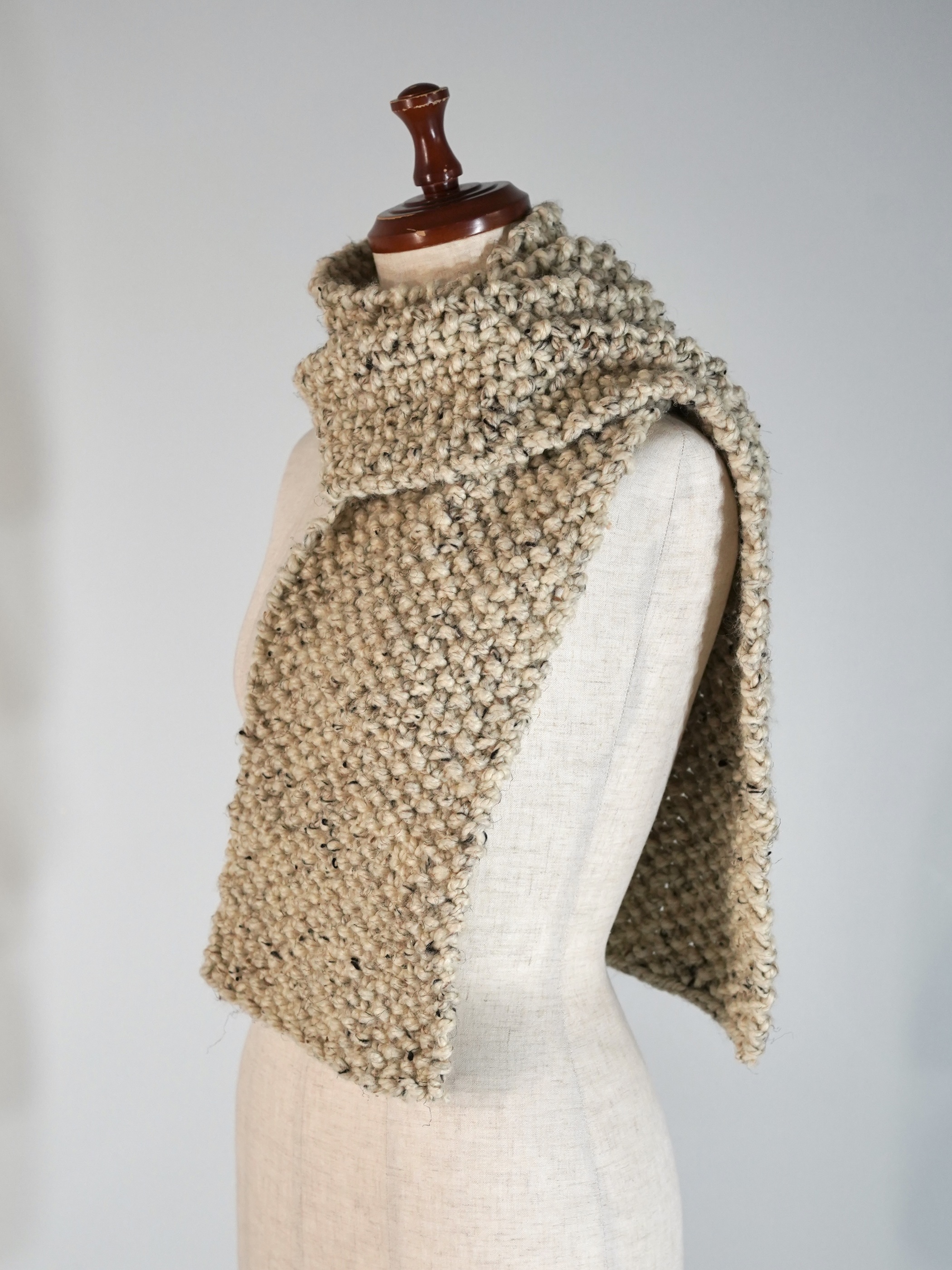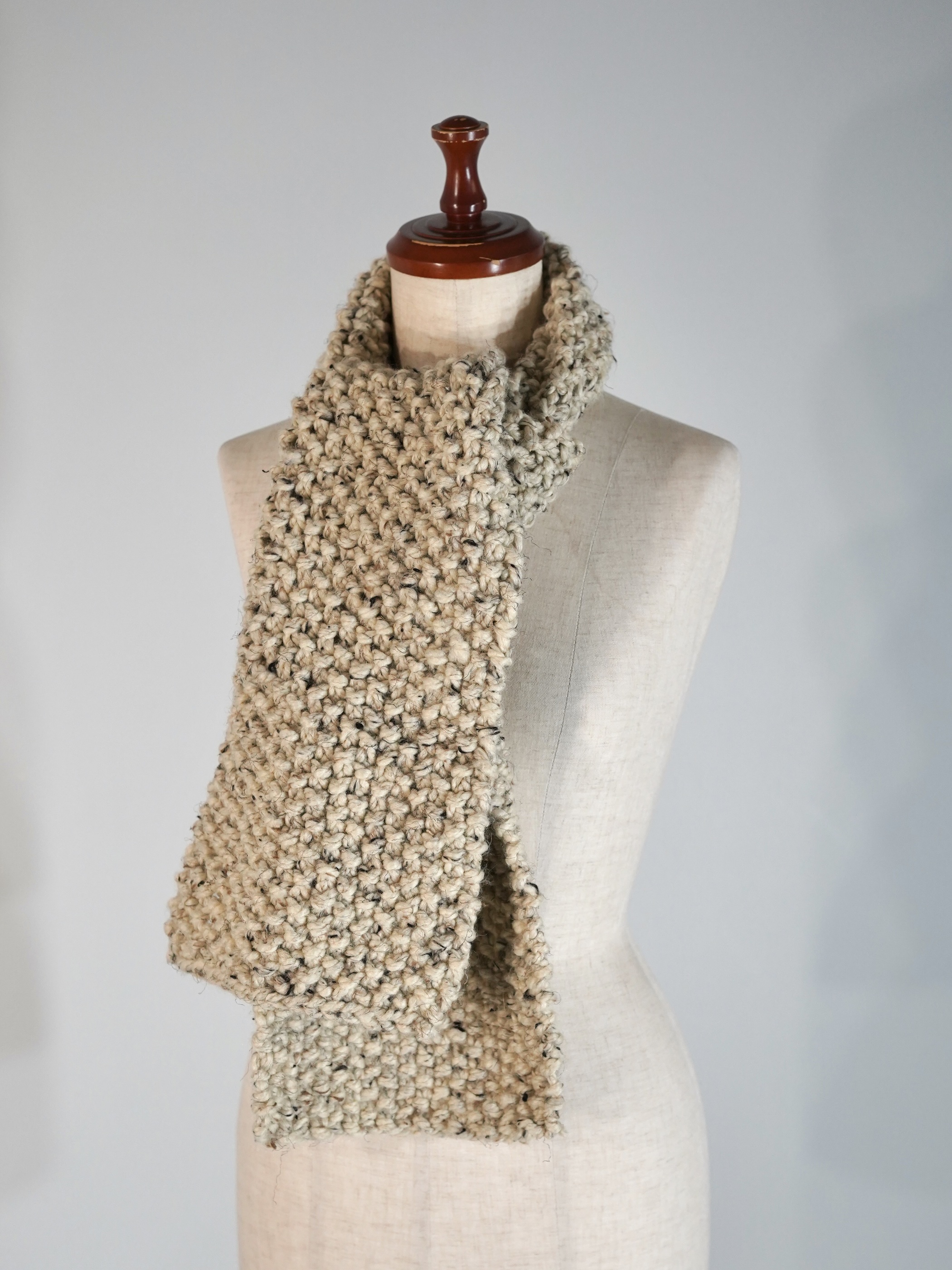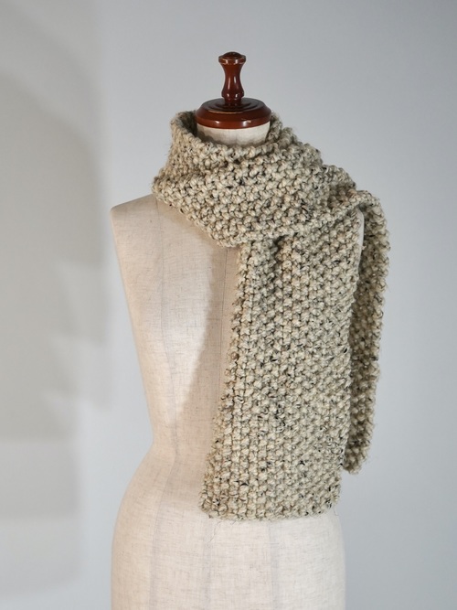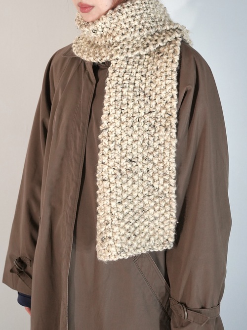 ポコポコとした編み目が可愛らしいベージュ系の糸で纏められたマフラー。