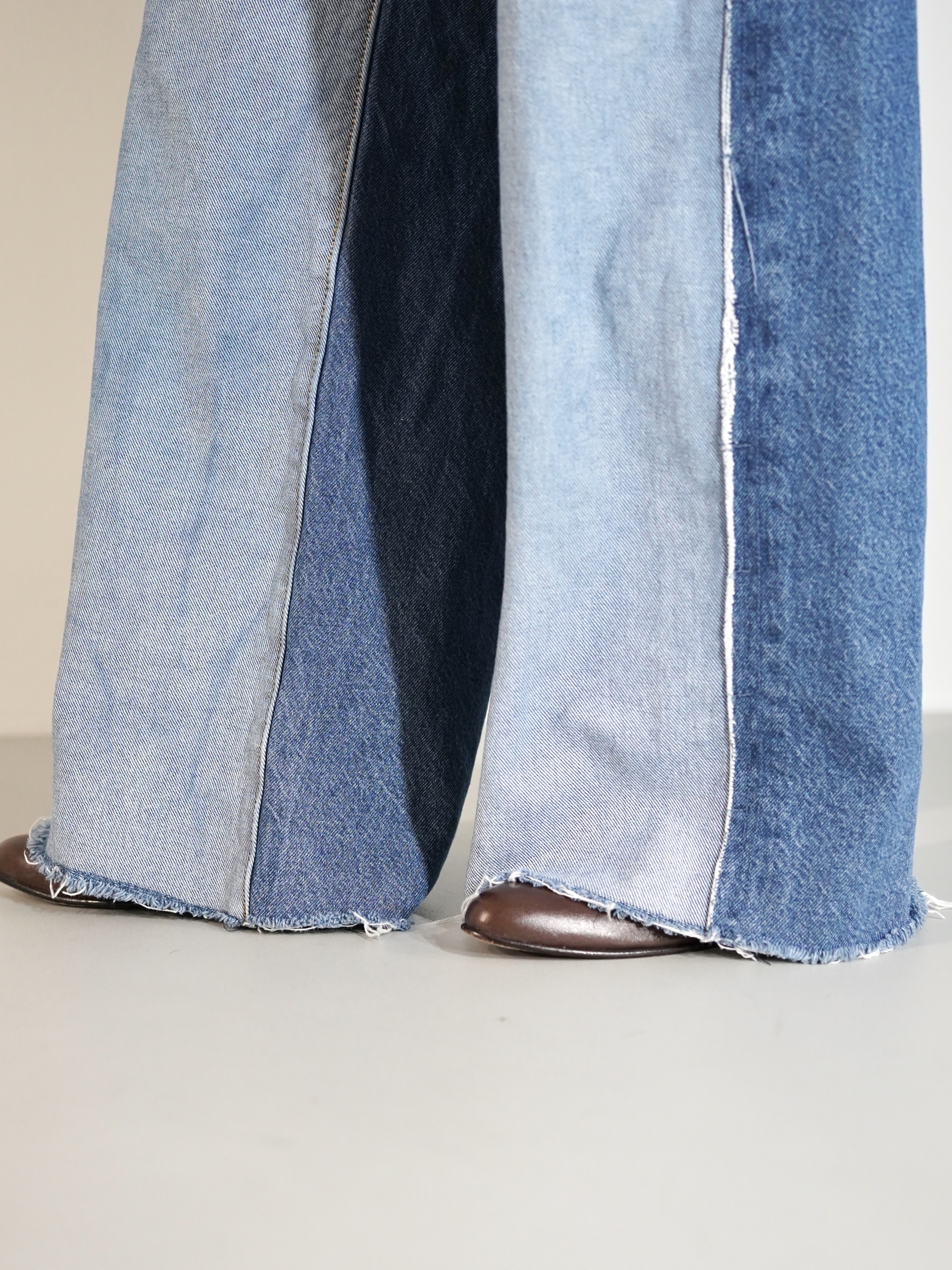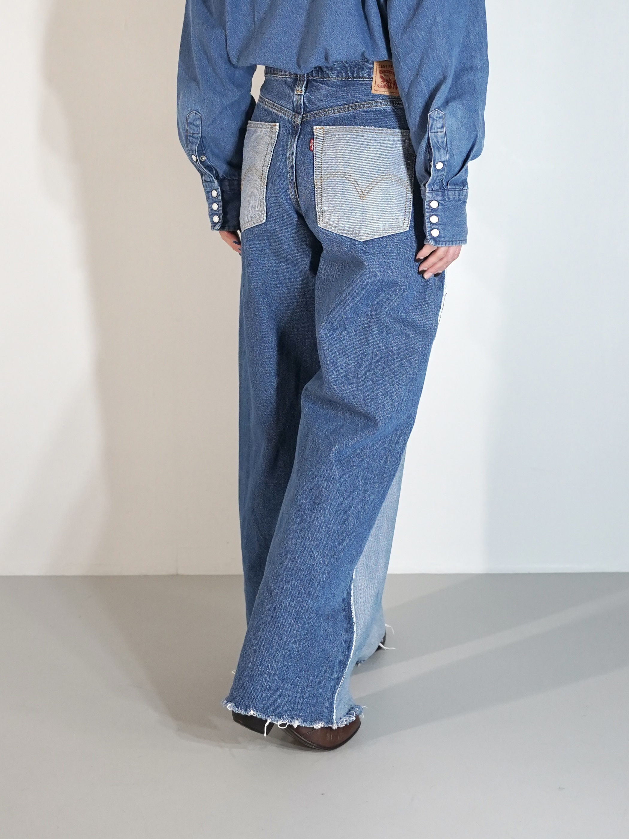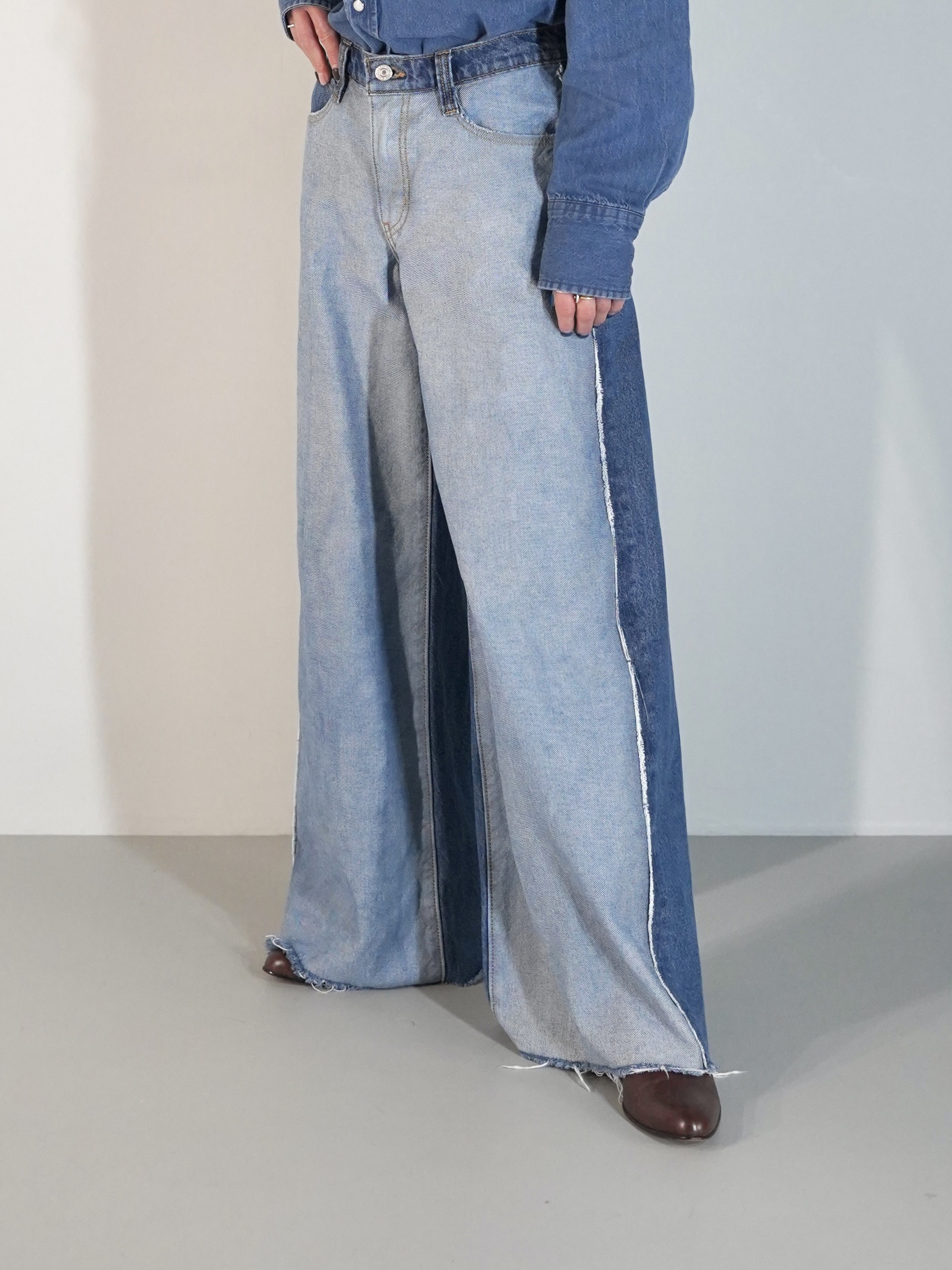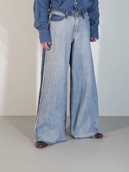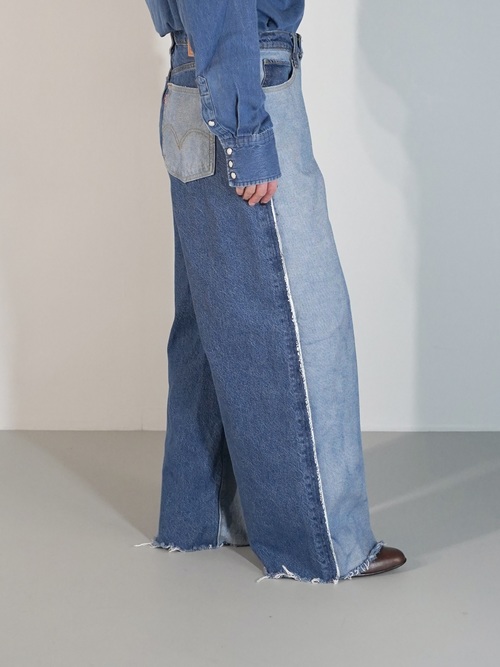 前見頃と後見頃で裏地と表地が切り替えられたワイドバギーデニム。